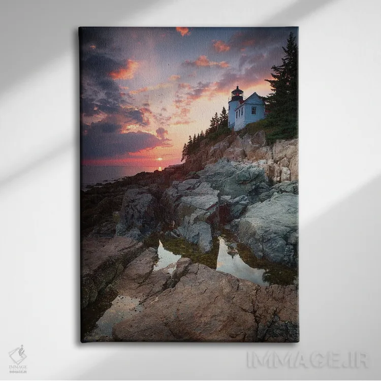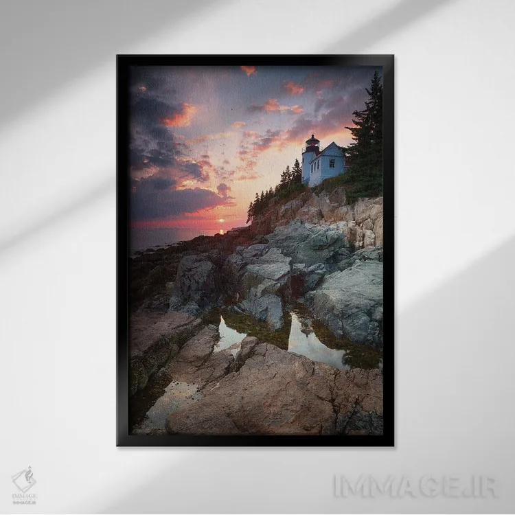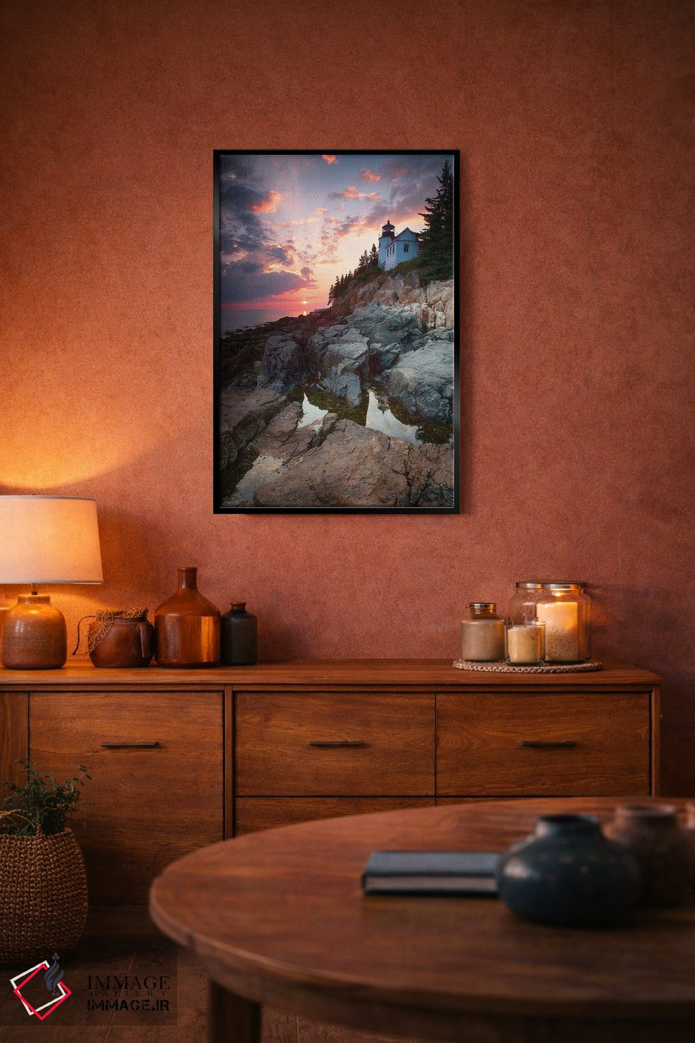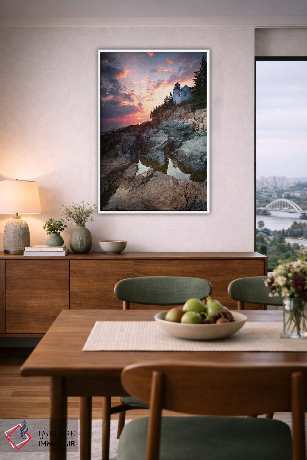 اگر اهل «کم اما درست» هستید، «Mount Desert Island، Maine، USA، غروب در فانوس دریایی بندر بس، جزیره ماونت دیزرت، مین، آمریکا» اثرِ «جین ریکس» به فضا، روایت ملایم و قابل لمس میدهد؛ برای نشیمنهای صمیمی و پذیراییهای شیک پیشنهاد میشود. این تابلو میتواند شروعِ خوبی برای یک دیوار گالری باشد.