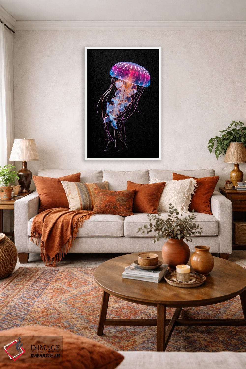 در «عروس دریایی روی زمینه مشکی» اثرِ «جین ریکس»، حضور حیوانات به دیوار، انرژیِ نرم و زنده میدهد؛ برای دکورهایی با رنگهای خنثی انتخابی خوشسلیقه است. هم فضا را گرم میکند، هم شلوغش نمیکند.