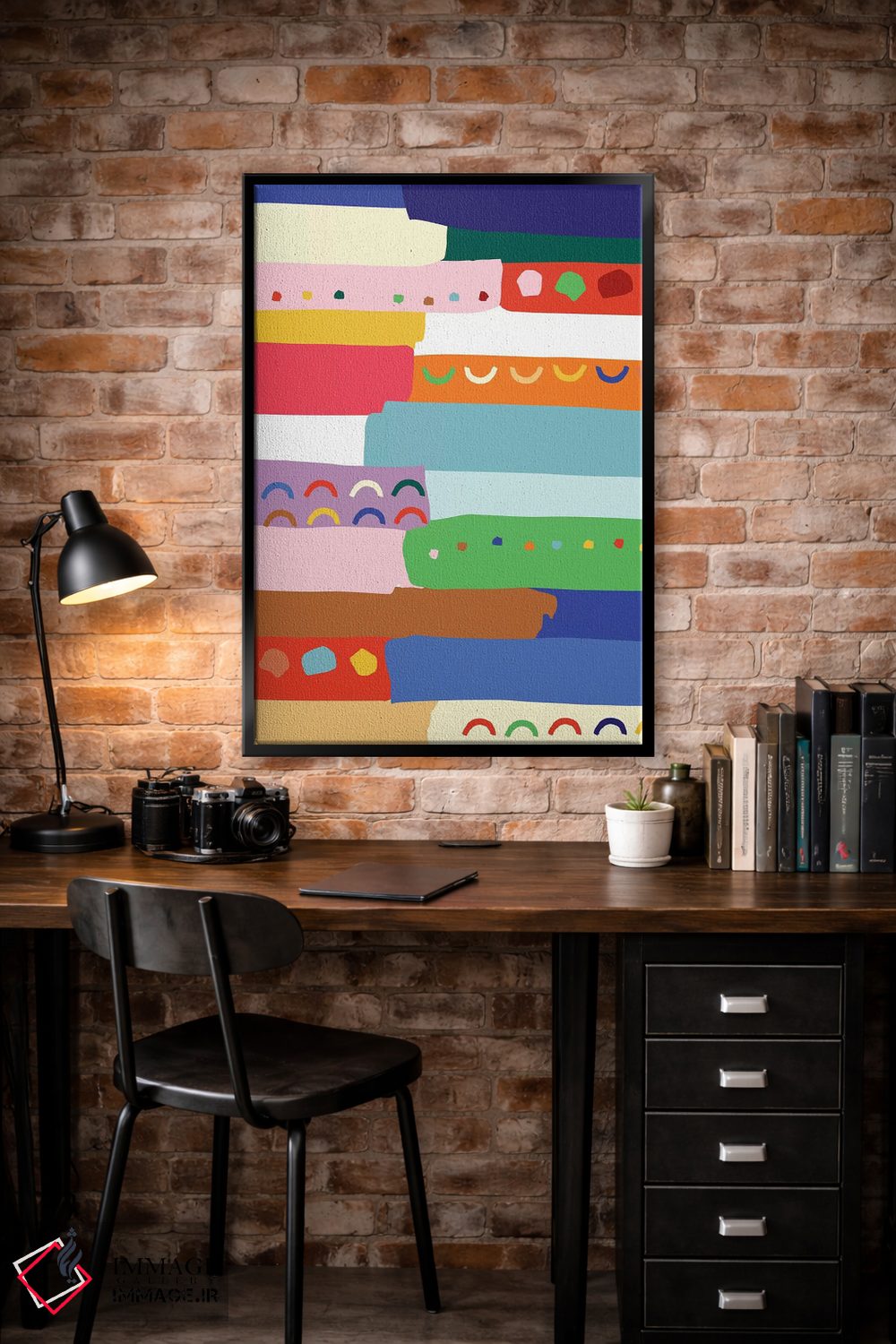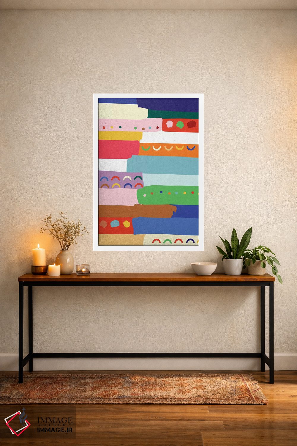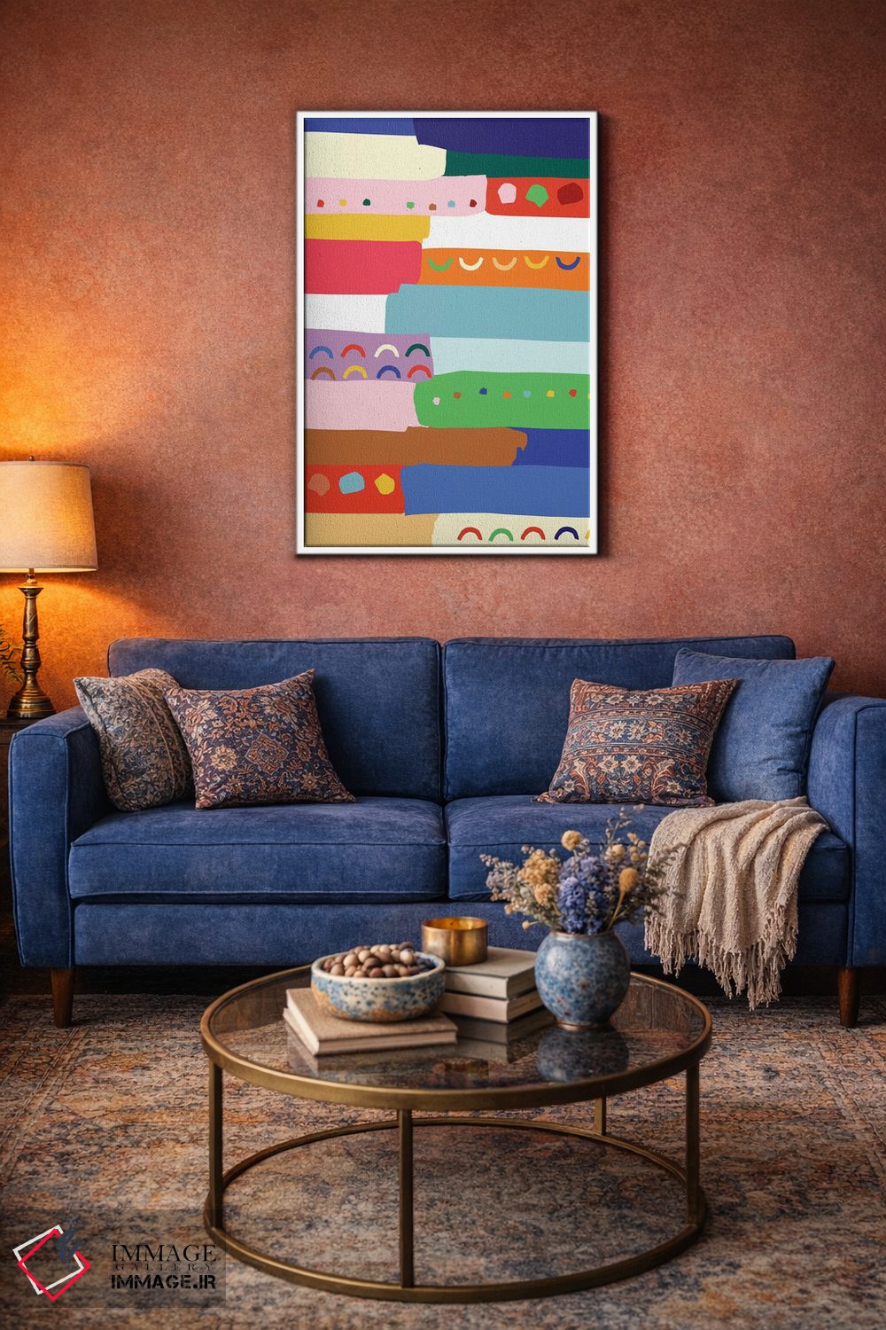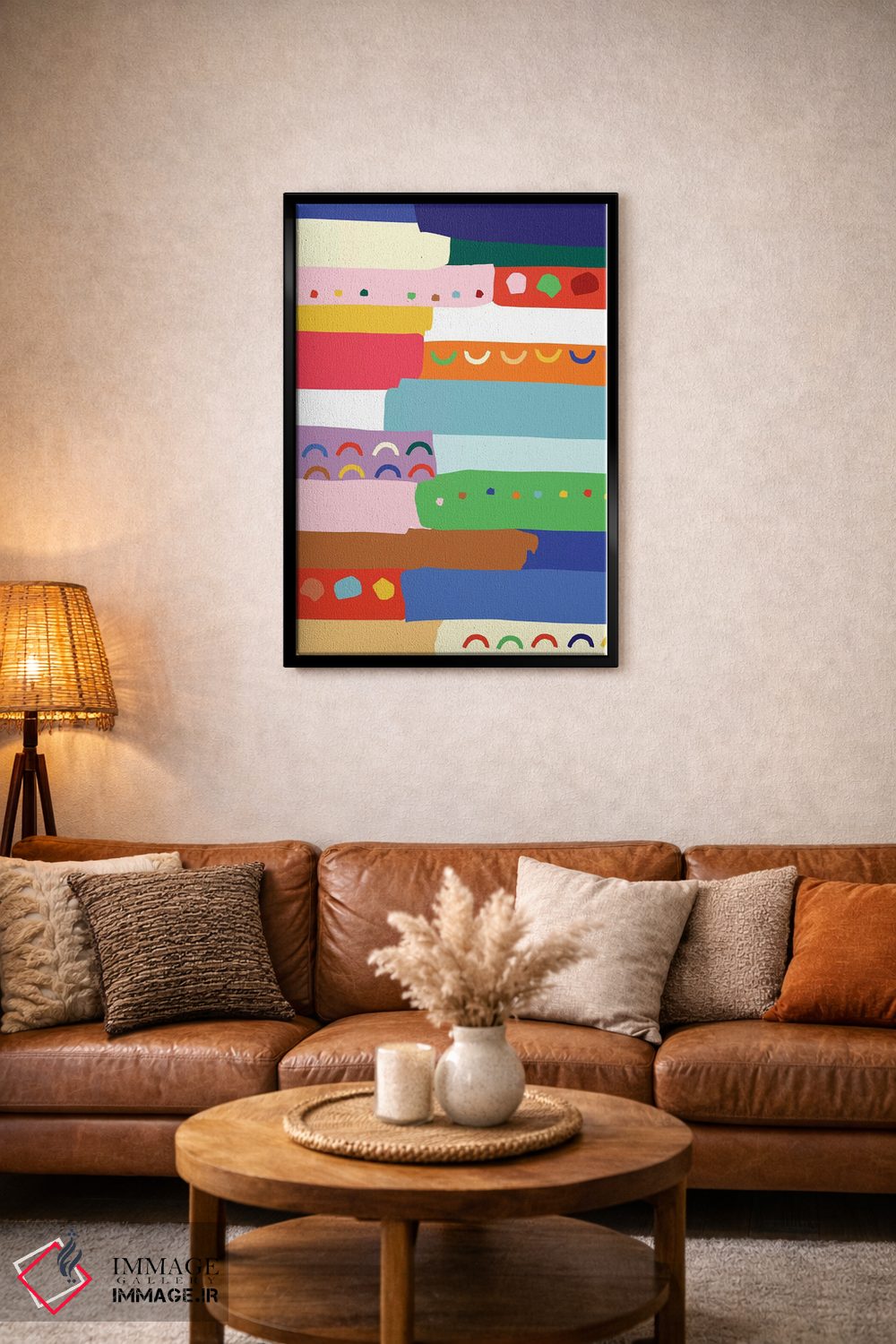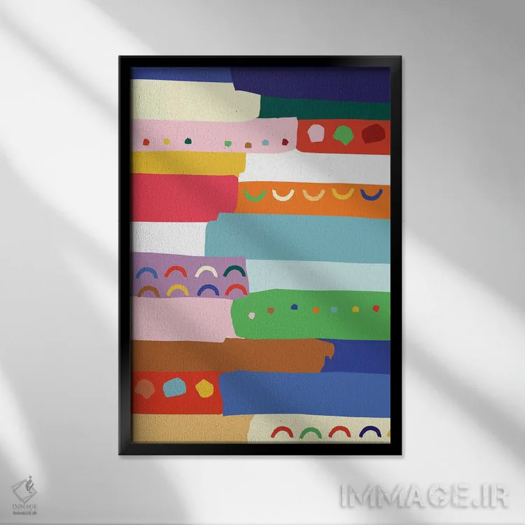 براساس پالت ترکیبی اثر، قاب تیک گرم (چوبی) پیشنهاد اول است و مشکی مات (فریم متوسط) مکمل. برای سفارشهای پروژهای با ابعاد و قابهای اختصاصی با ایماژ در تماس باشید.