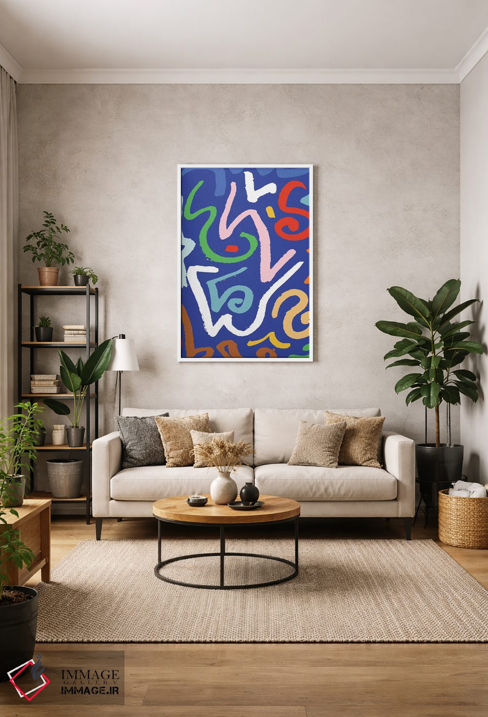 اگر ابعاد دیوار را دارید، میتوانید هماهنگ کنید تا انتخاب نهایی دقیقتر انجام شود. اگر میپسندید که اثر در محیط «آرام و خنثی» دیده شود، انتخاب قاب مناسب کمک بزرگی است و تصمیم را سادهتر میکند.