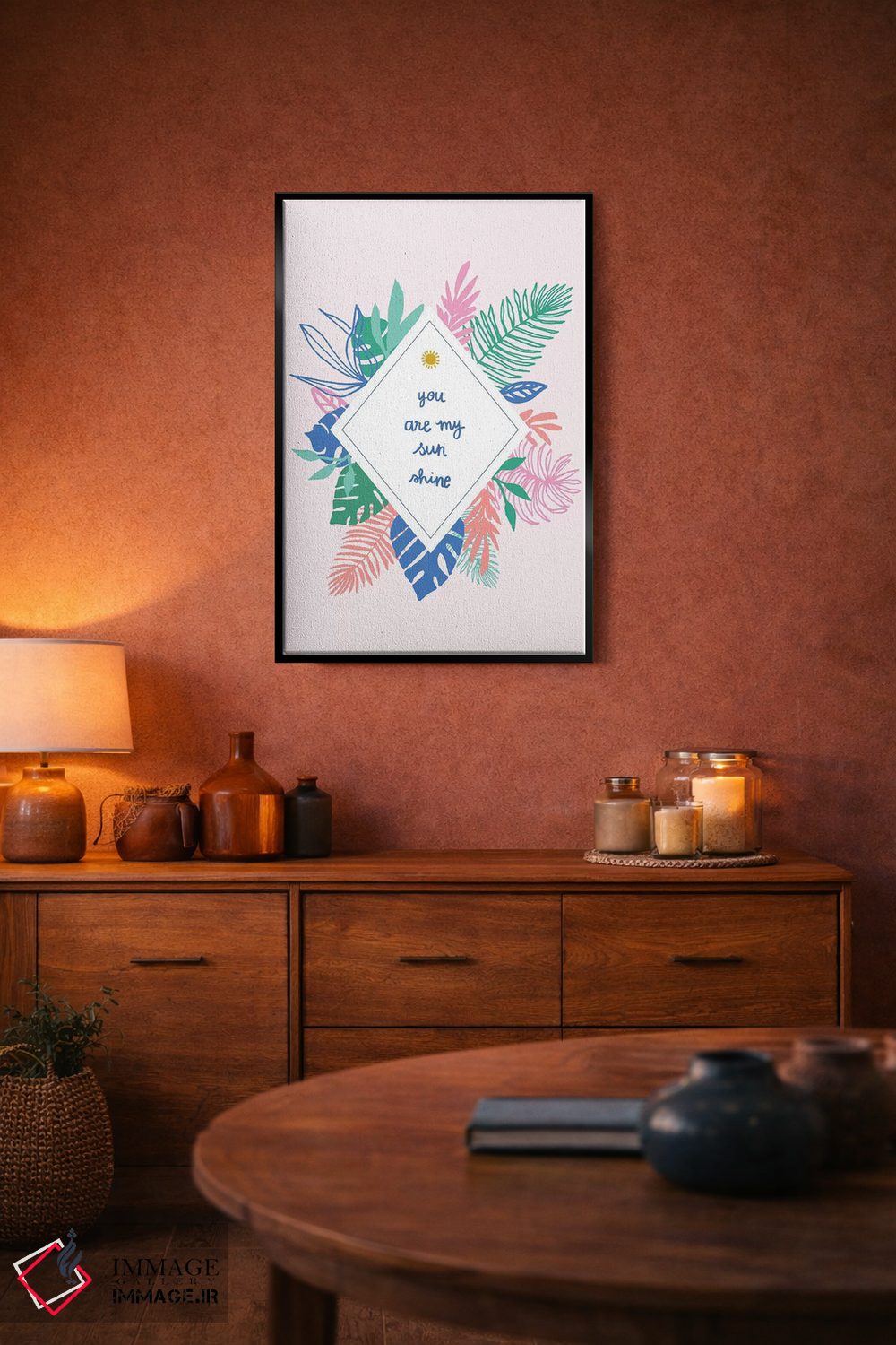 براساس پالت ترکیبی اثر، قاب تیک گرم (چوبی) پیشنهاد اول است و مشکی مات (فریم متوسط) مکمل.