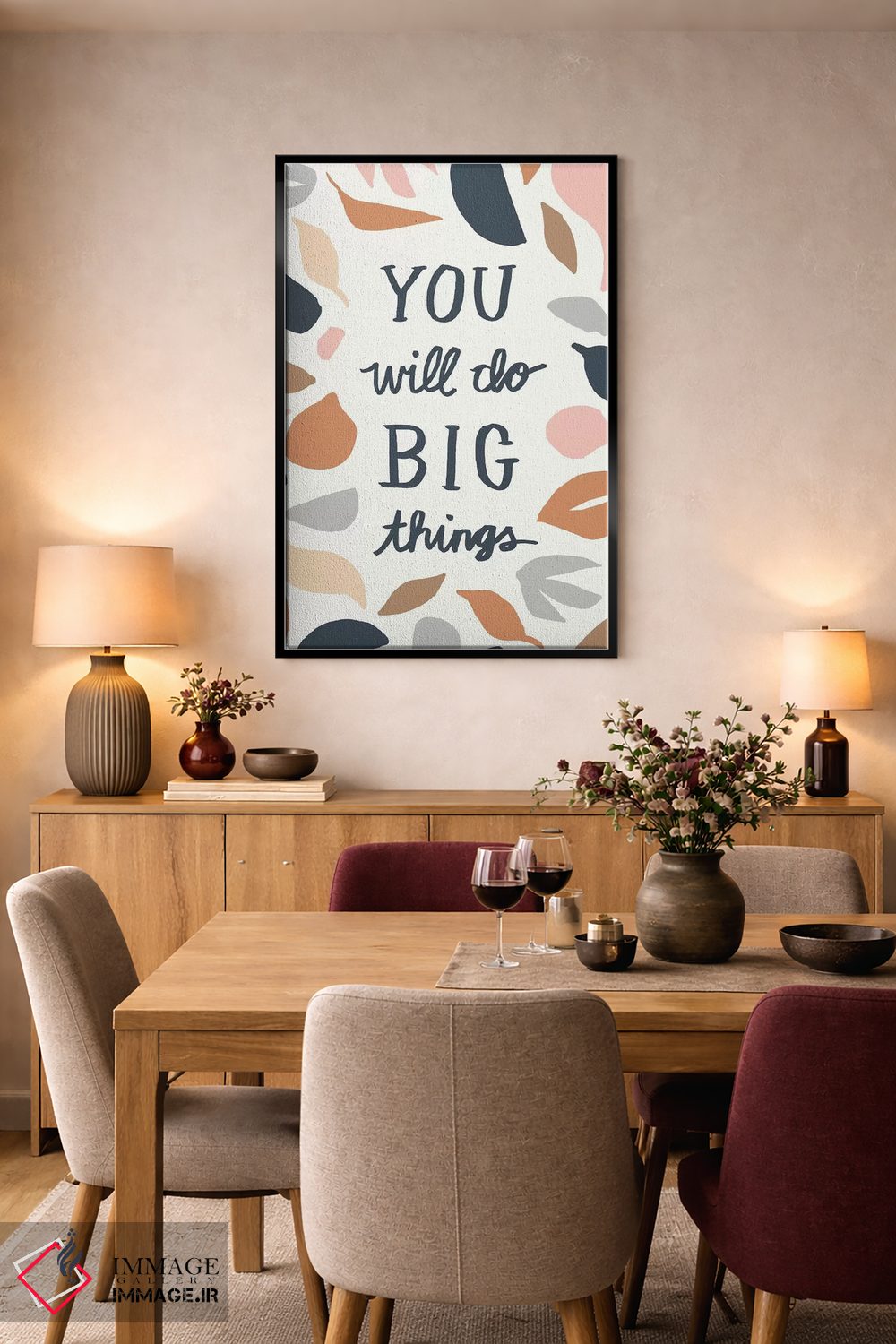 براساس پالت گرم اثر، قاب تیک گرم (چوبی) پیشنهاد اول است و مشکی مات (فریم متوسط) مکمل. برای سفارشهای پروژهای با ابعاد و قابهای اختصاصی با ایماژ در تماس باشید.