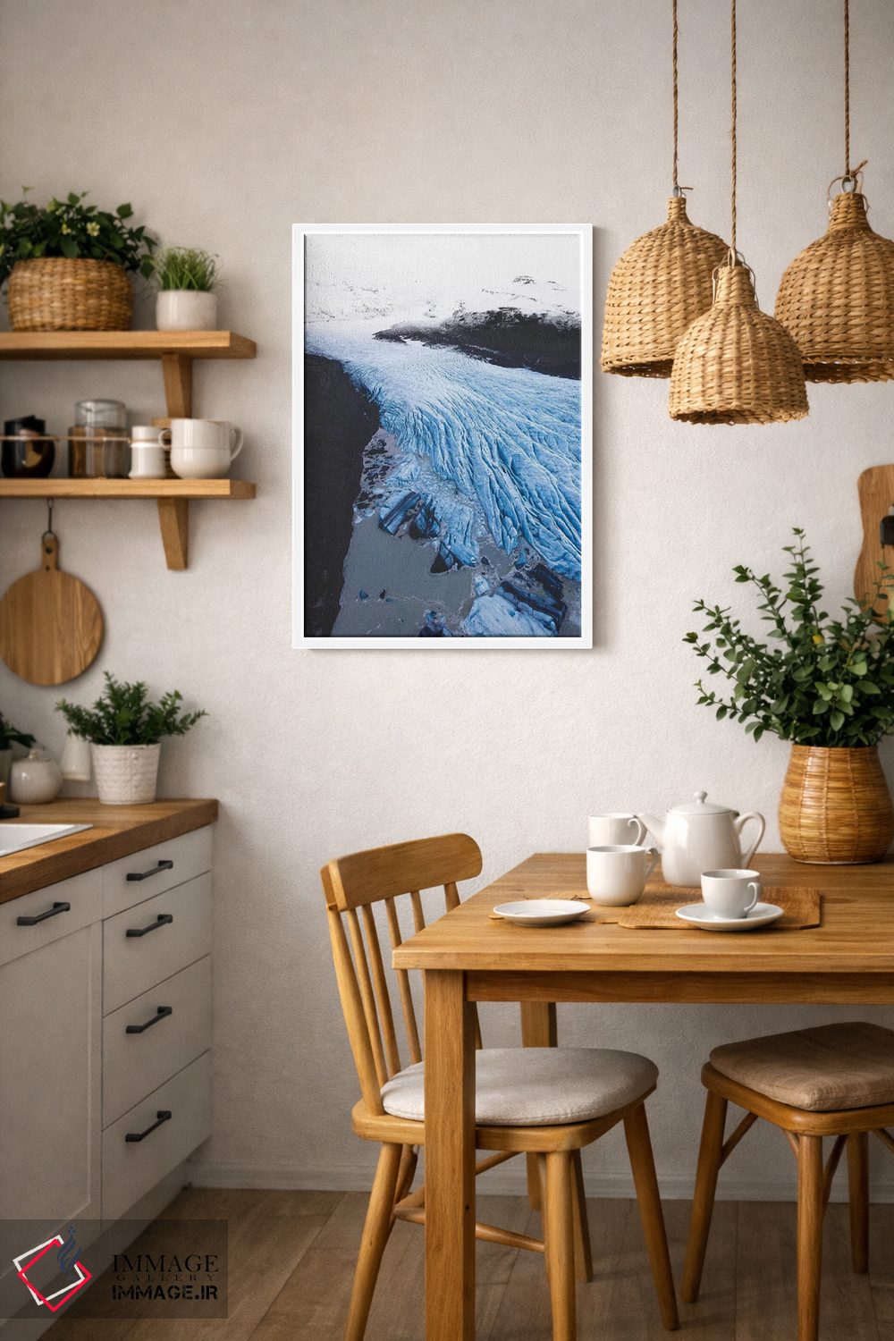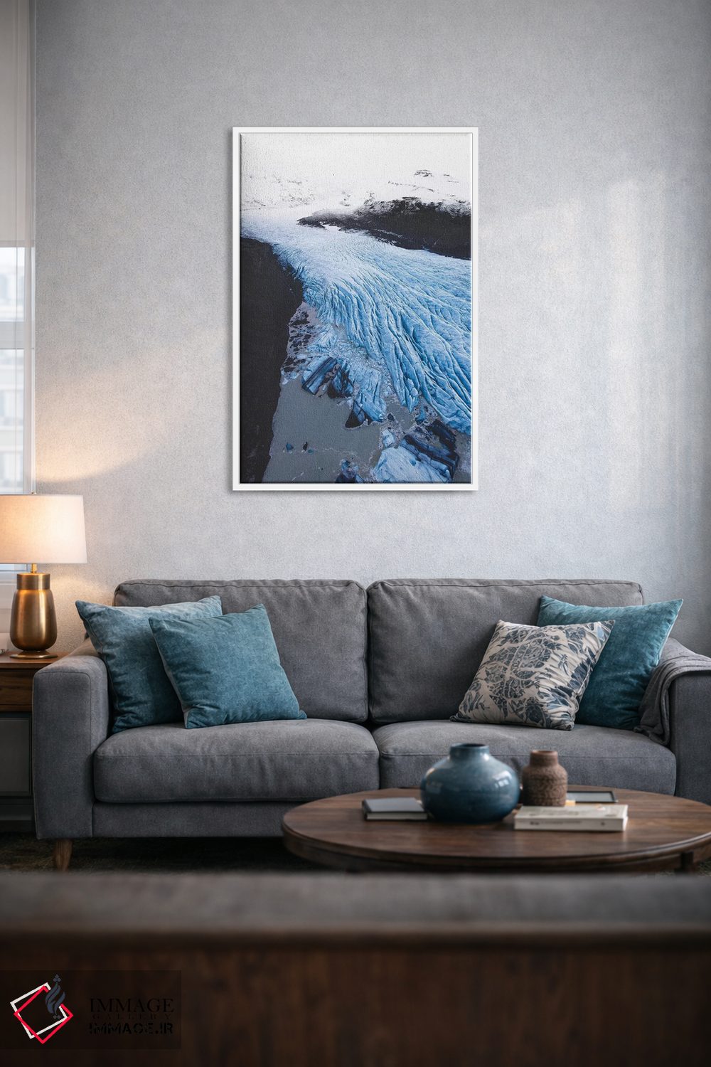 این تابلو با عنوان «رودخانهٔ آبی یخ» اثرِ «جو شاتر» حس گالریوار را بیسروصدا وارد خانه میکند؛ برای اتاق کار و گوشهٔ مطالعه پیشنهاد میشود. برای فضاهایی که دنبال «وقار» هستند، انتخابی مطمئن است.