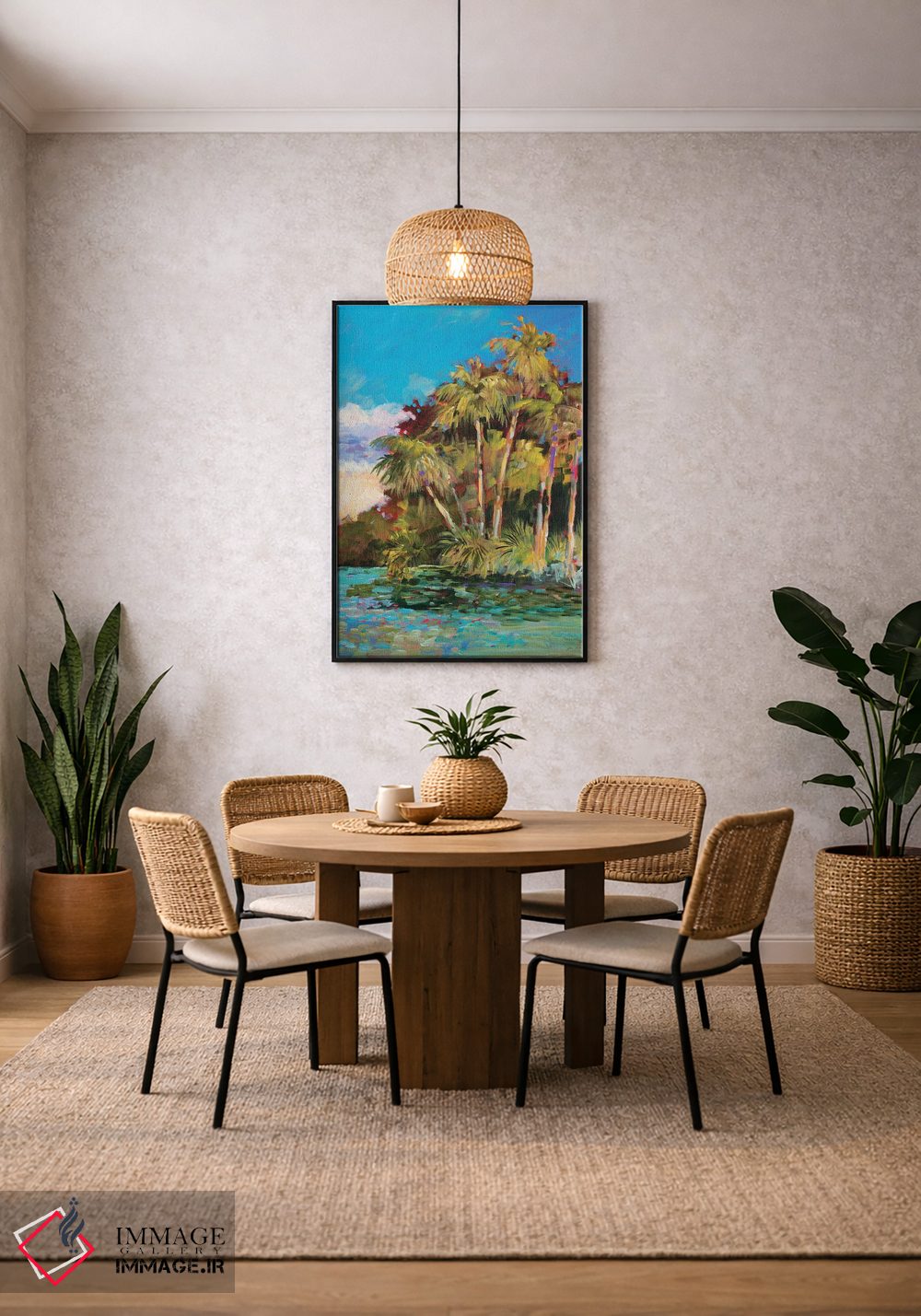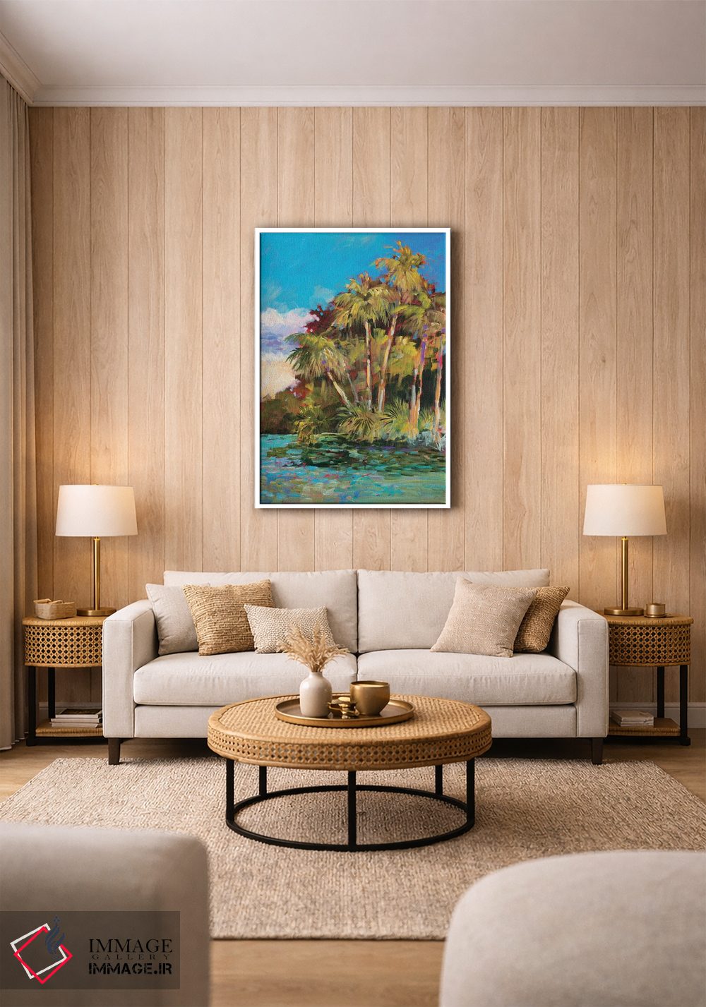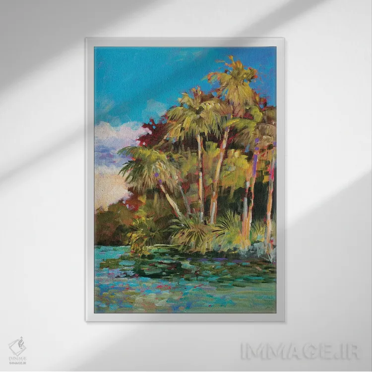 براساس پالت ترکیبی اثر، قاب تیک گرم (چوبی) پیشنهاد اول است و مشکی مات (فریم متوسط) مکمل. برای سفارشهای پروژهای با ابعاد و قابهای اختصاصی با ایماژ در تماس باشید.