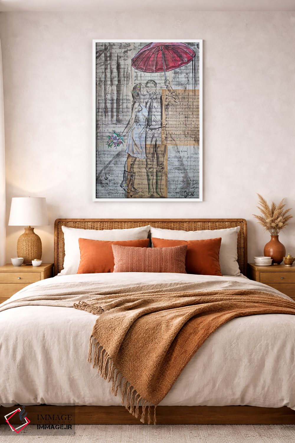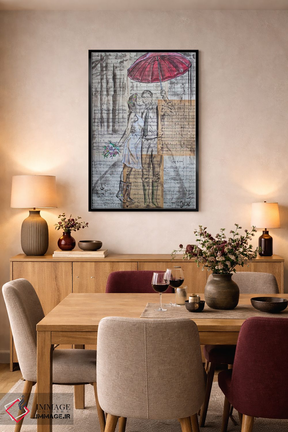 براساس پالت گرم اثر، قاب بلوط روشن (چوبی) پیشنهاد اول است و استخوانی ملایم مکمل. برای سفارشهای پروژهای با ابعاد و قابهای اختصاصی با ایماژ در تماس باشید.