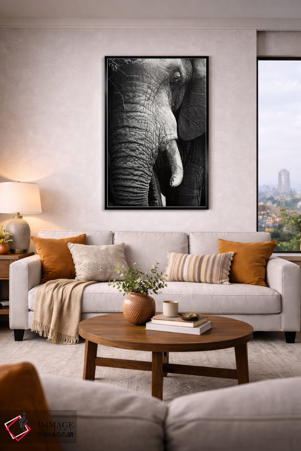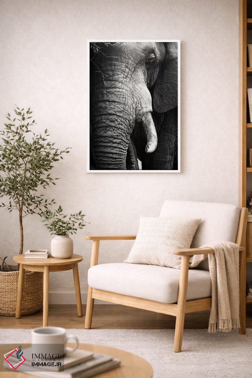 در «پرتره نزدیک فیل» اثرِ «یوهان سوانپوئل»، حضور حیوانات در کنار رنگهای خنثی، تضاد دلچسبی میسازد؛ برای دیوار کنار میز کار انتخابی خوشسلیقه است. در کنار گیاهان و نور طبیعی، جذابتر هم میشود.