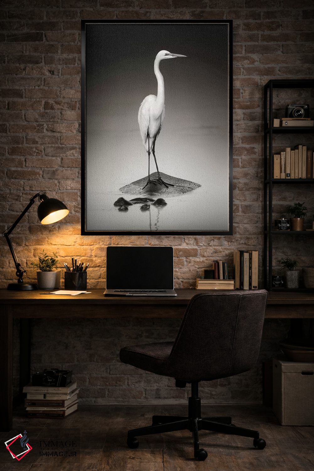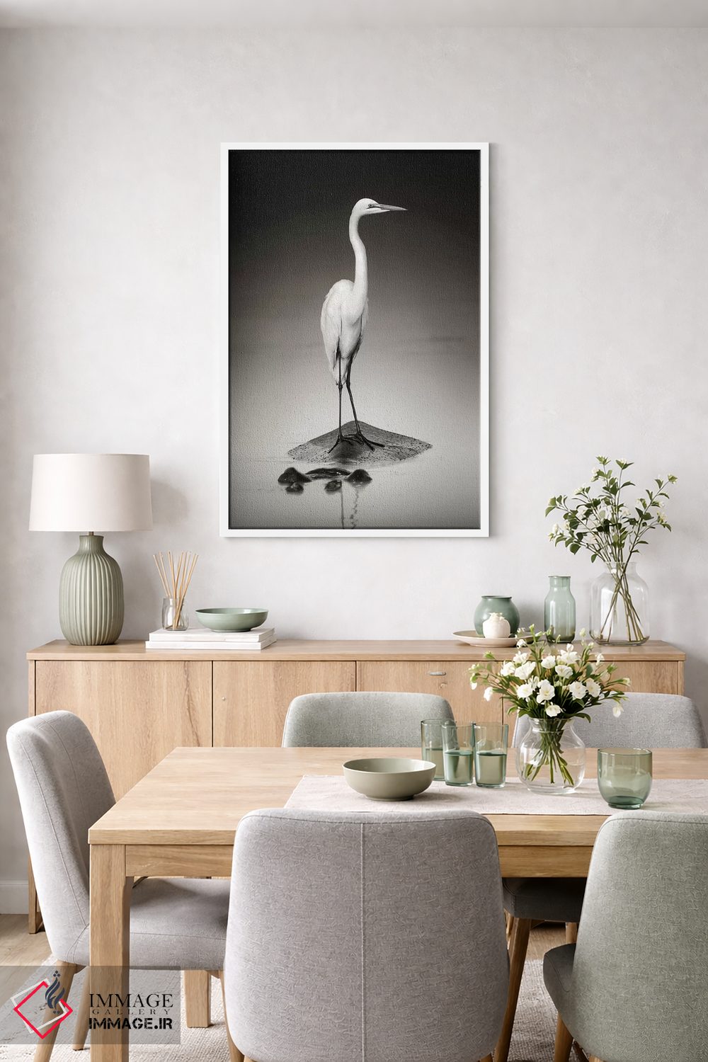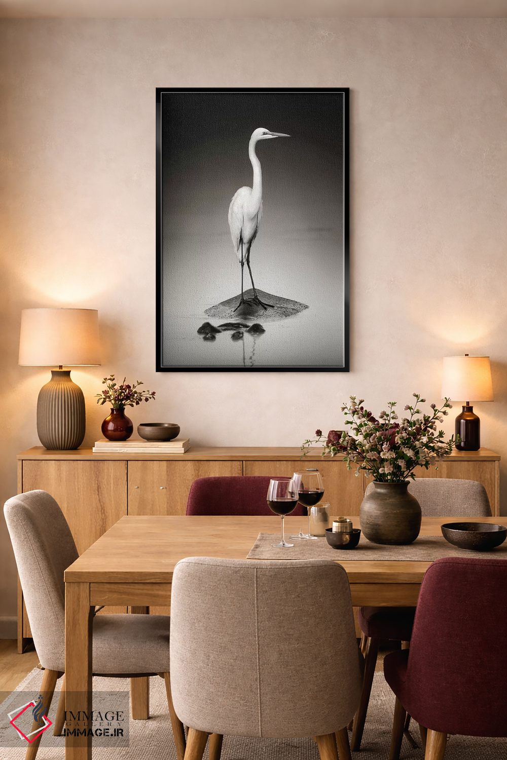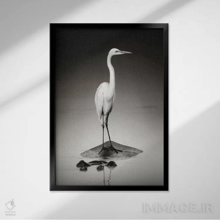این اثر با عنوان «حواصیل سفید بزرگ روی اسب آبی» اثرِ «یوهان سوانپوئل» فضا را صمیمیتر و دعوتکنندهتر نشان میدهد؛ برای اتاق بازی یا گوشهٔ مطالعه انتخابی خوشسلیقه است. حسش صمیمی است، اما کیفیتش جدی و خوشپرداخت.