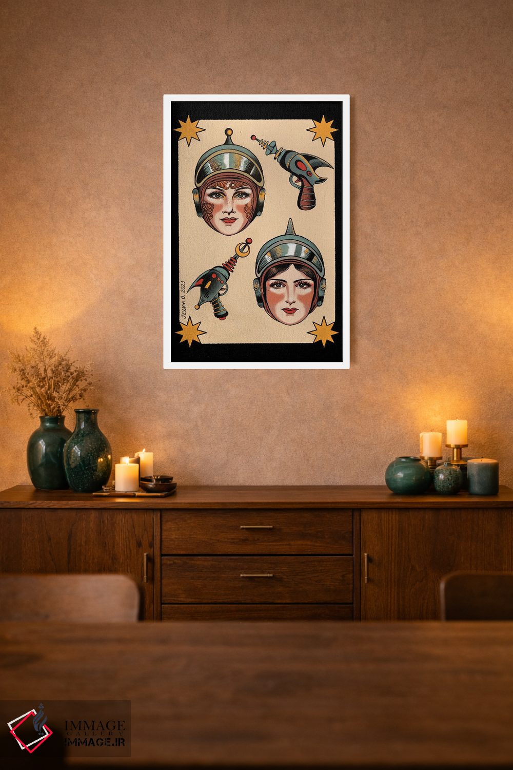 براساس پالت گرم اثر، قاب بلوط روشن (چوبی) پیشنهاد اول است و استخوانی ملایم مکمل. برای سفارشهای پروژهای با ابعاد و قابهای اختصاصی با ایماژ در تماس باشید.