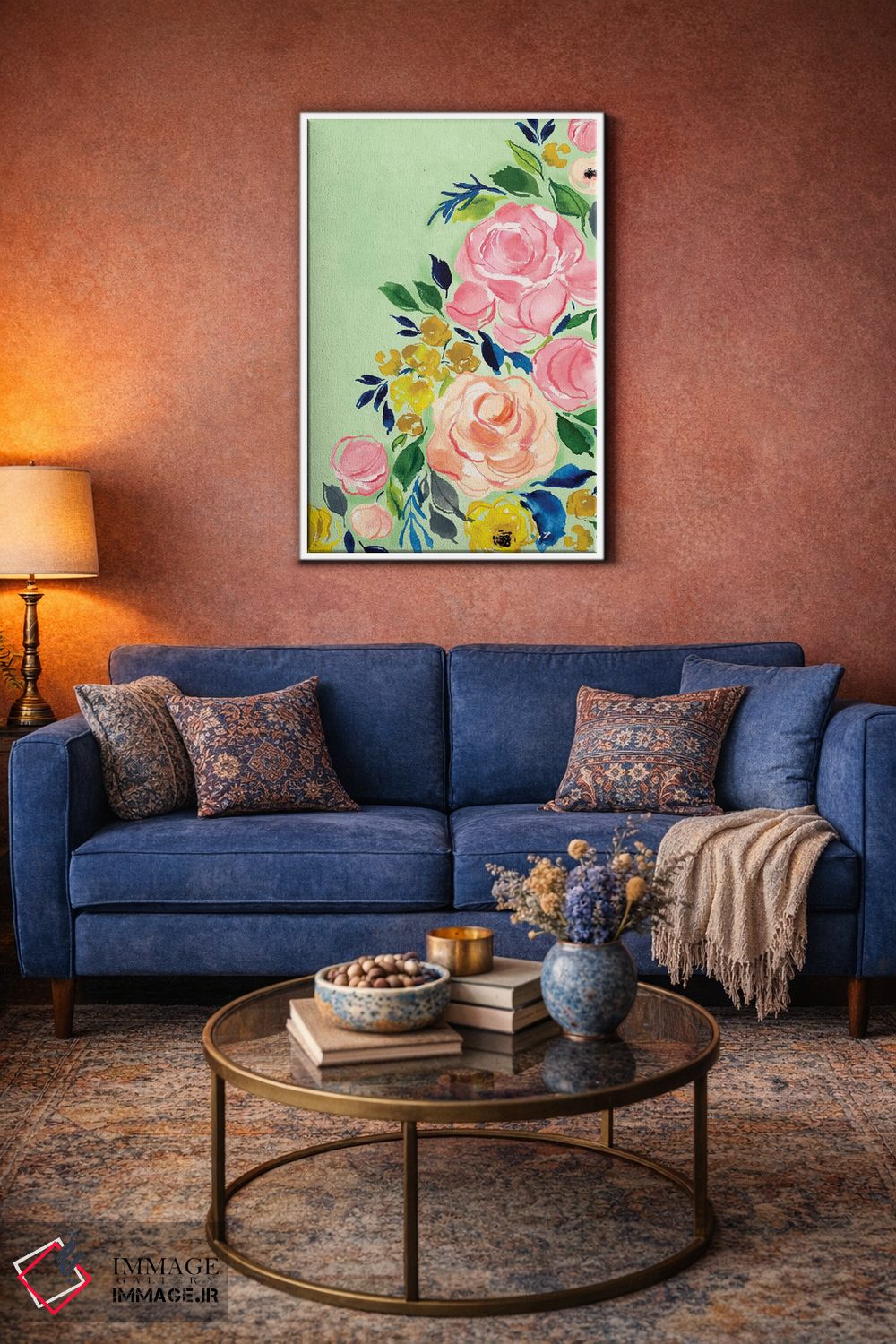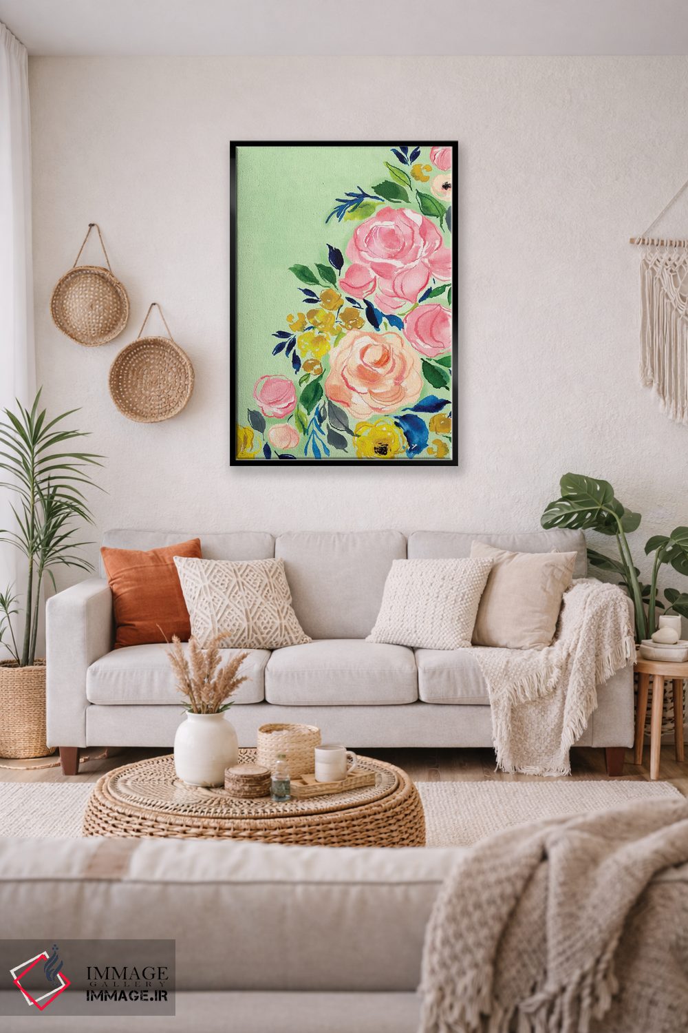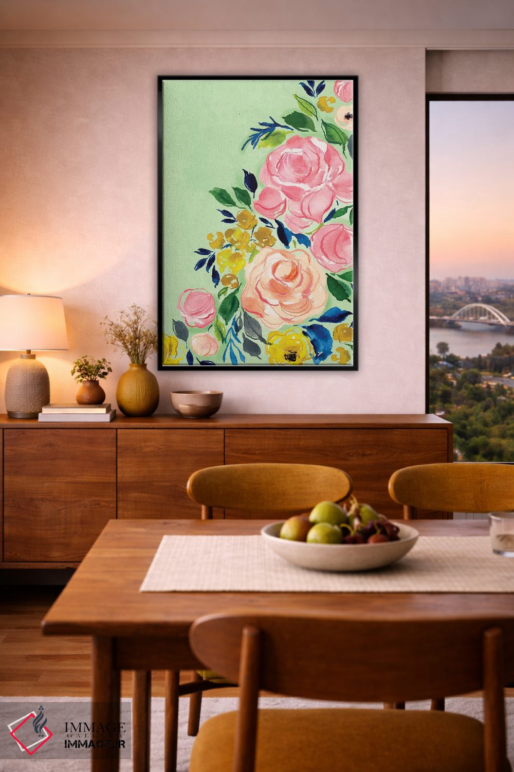 اگر دوست دارید دیوار روشنتر و آرامتر دیده شود، «گلها» اثرِ «جوی تینگ» در کنار چوب و پارچههای روشن، عالی مینشیند، برای کنار میز آرایش یا کنسول گزینهٔ مناسبیست. با قاب روشن یا چوبی، حس طبیعیتری پیدا میکند.
