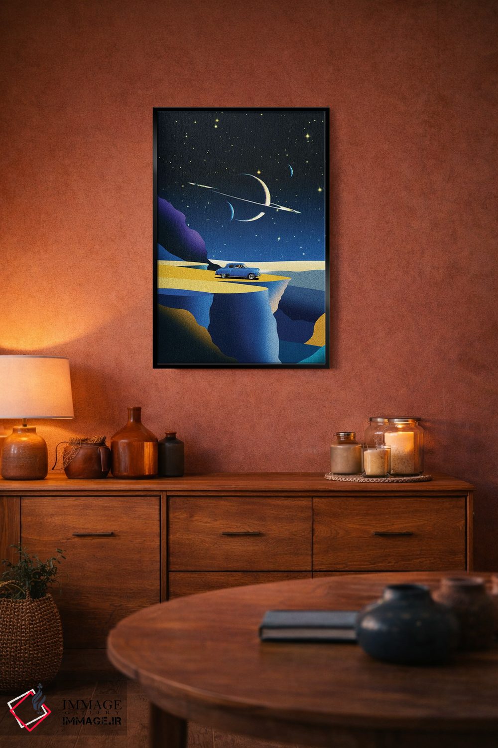 براساس پالت ترکیبی اثر، قاب تیک گرم (چوبی) پیشنهاد اول است و مشکی مات (فریم متوسط) مکمل. برای سفارشهای پروژهای با ابعاد و قابهای اختصاصی با ایماژ در تماس باشید.