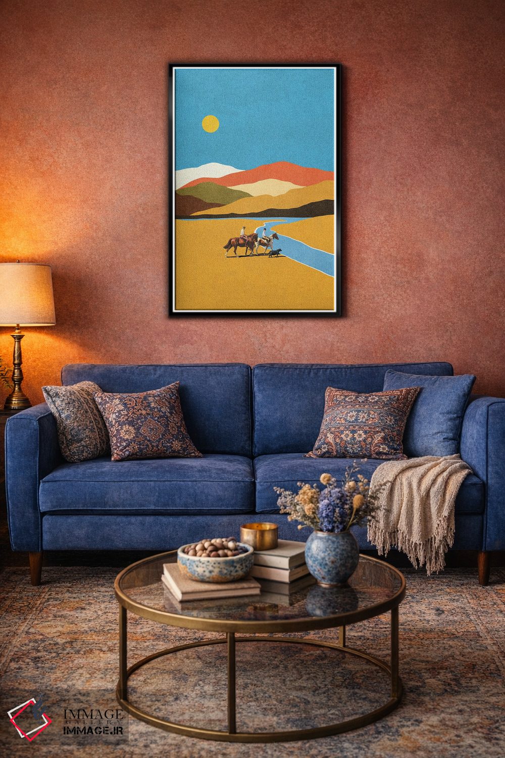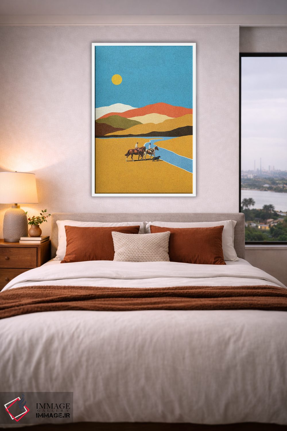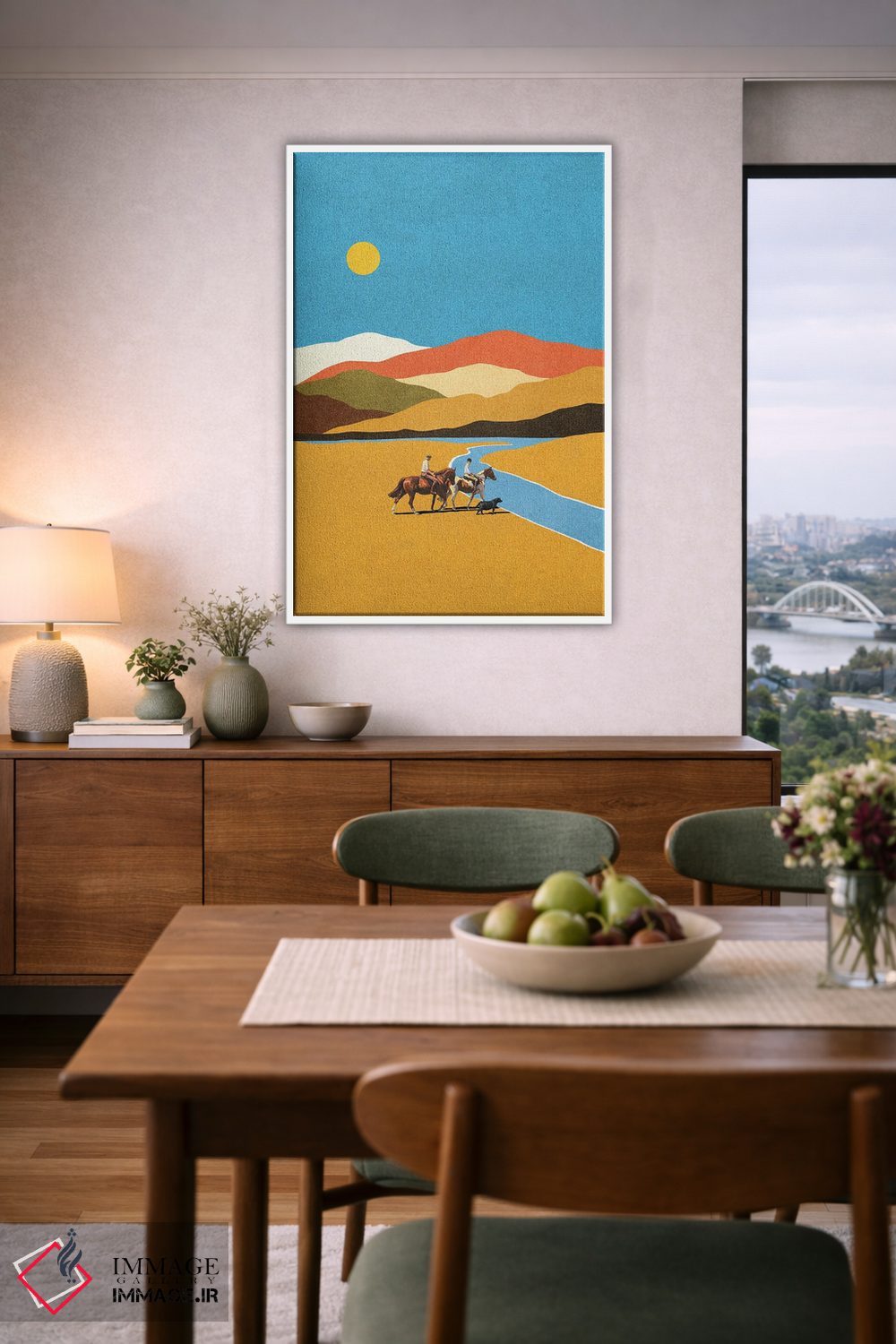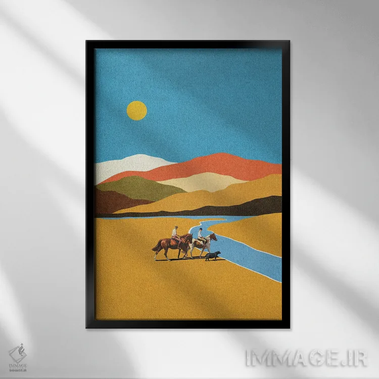 براساس پالت ترکیبی اثر، قاب تیک گرم (چوبی) پیشنهاد اول است و مشکی مات (فریم متوسط) مکمل. برای سفارشهای پروژهای با ابعاد و قابهای اختصاصی با ایماژ در تماس باشید.