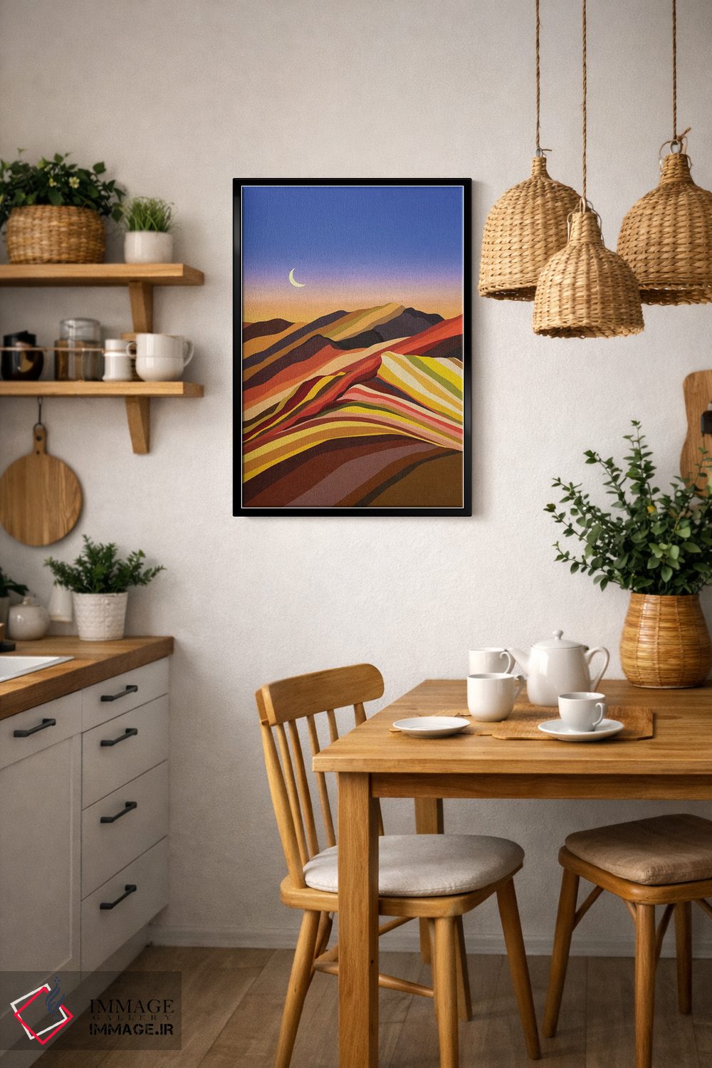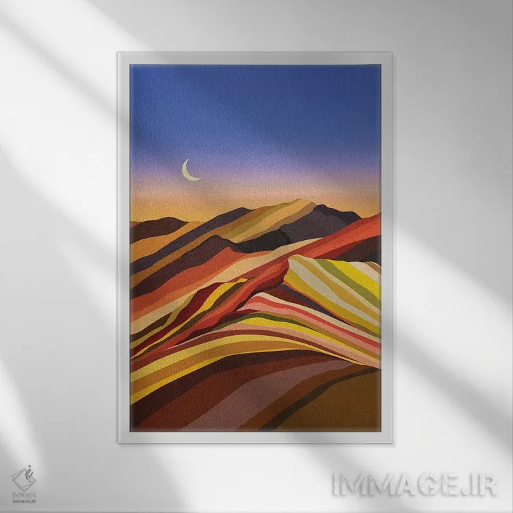براساس پالت ترکیبی اثر، قاب تیک گرم (چوبی) پیشنهاد اول است و مشکی مات (فریم متوسط) مکمل. برای سفارشهای پروژهای با ابعاد و قابهای اختصاصی با ایماژ در تماس باشید.