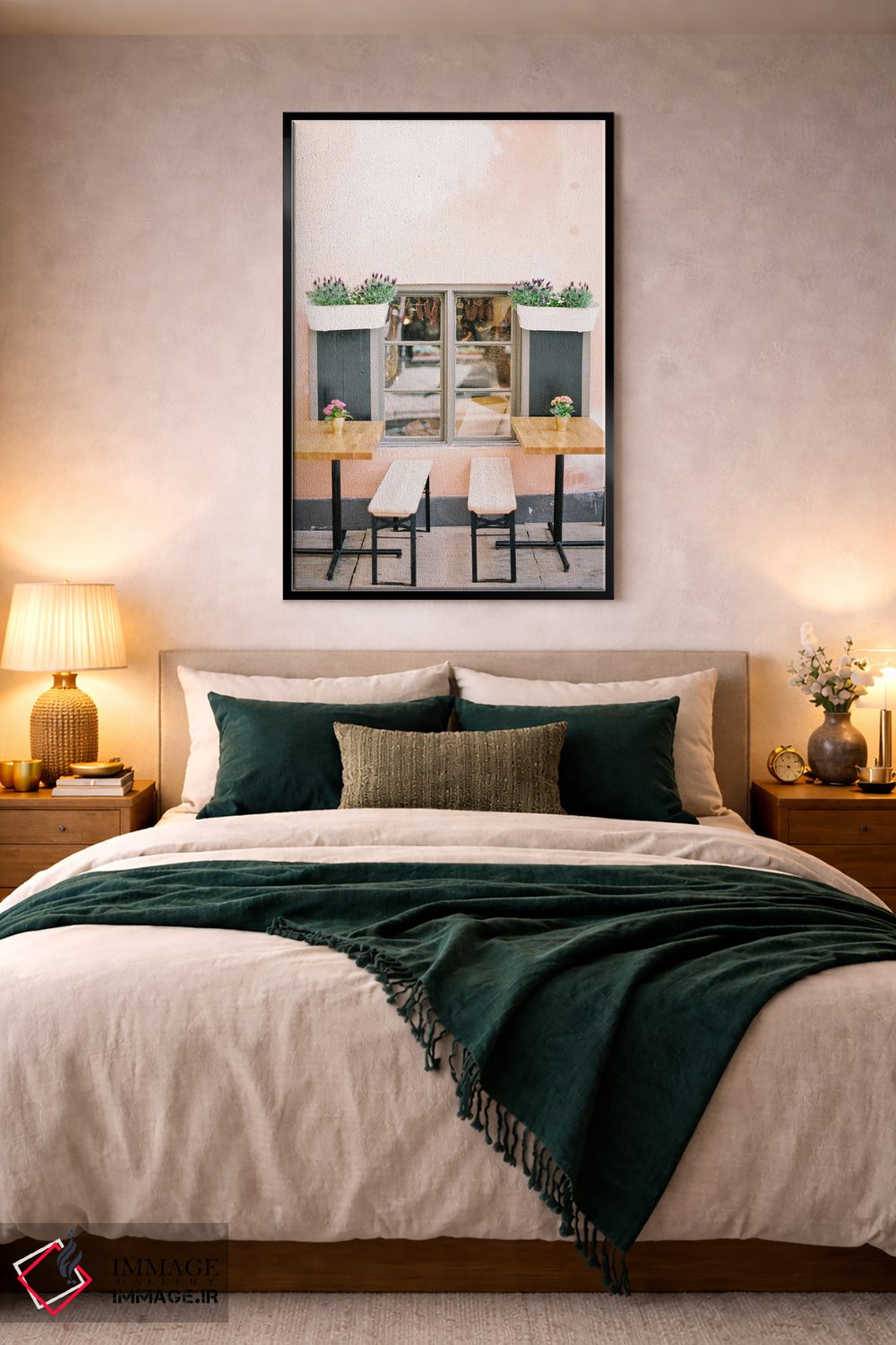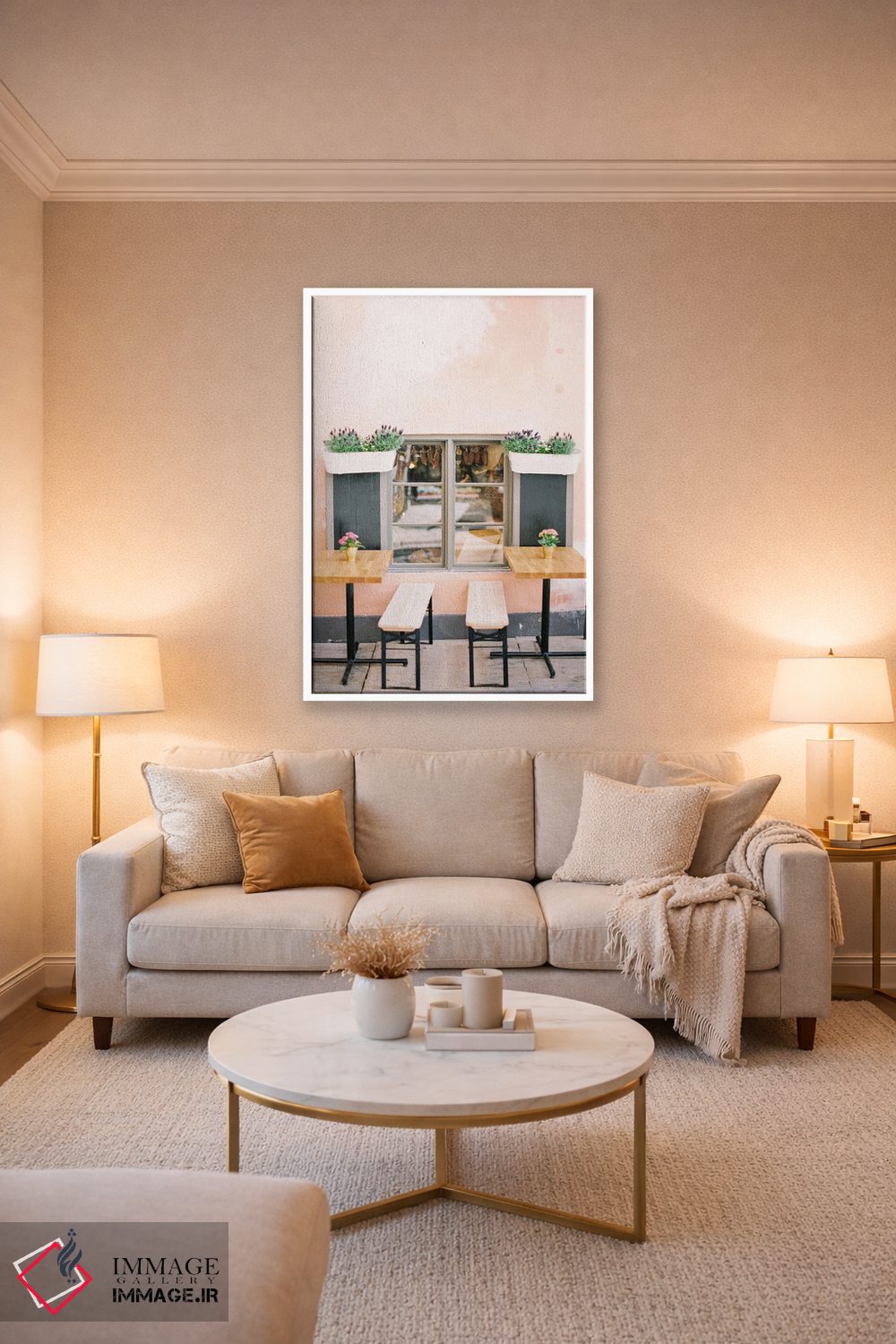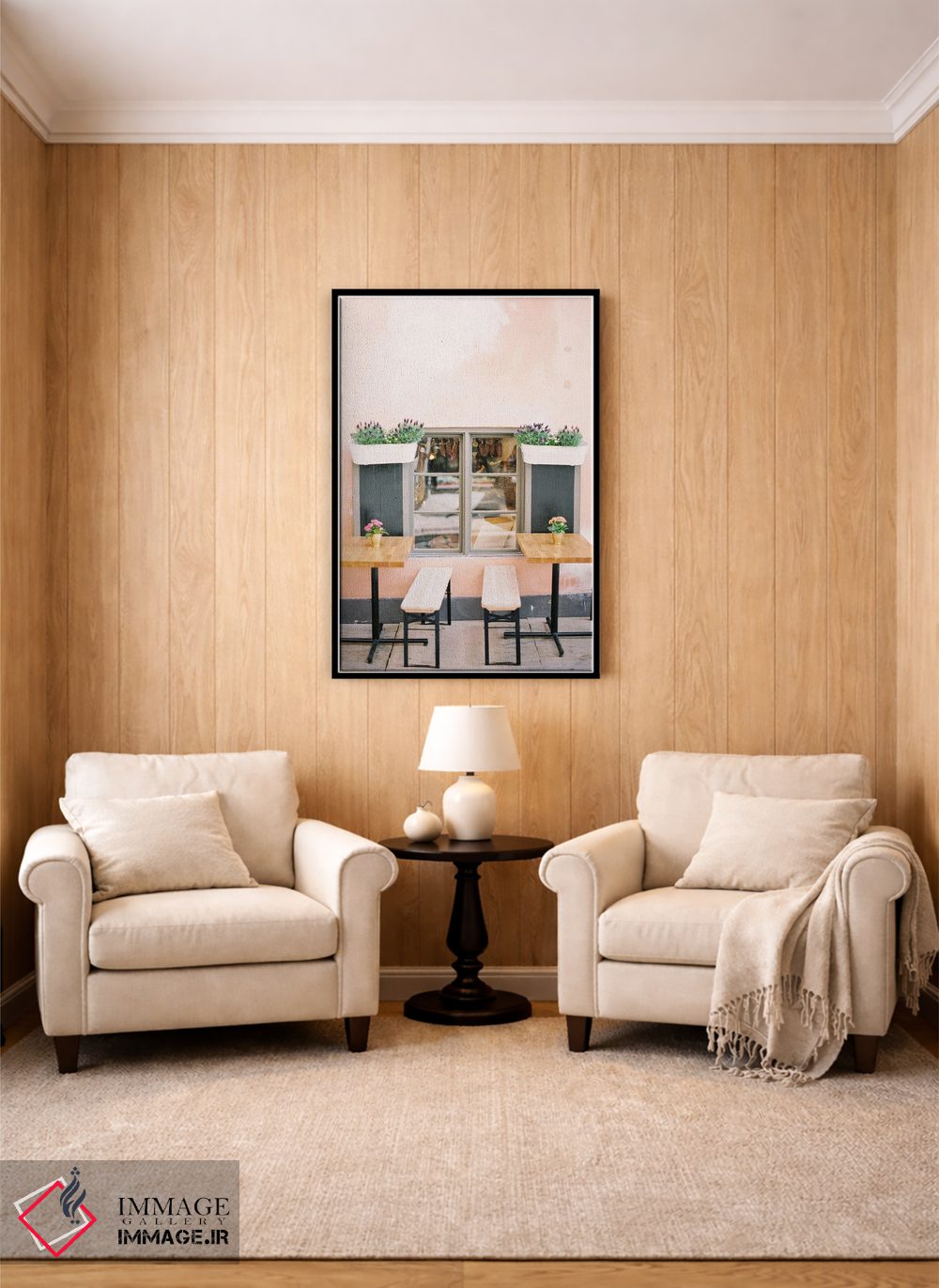 براساس پالت گرم اثر، قاب بلوط روشن (چوبی) پیشنهاد اول است و استخوانی ملایم مکمل. برای سفارشهای پروژهای با ابعاد و قابهای اختصاصی با ایماژ در تماس باشید.