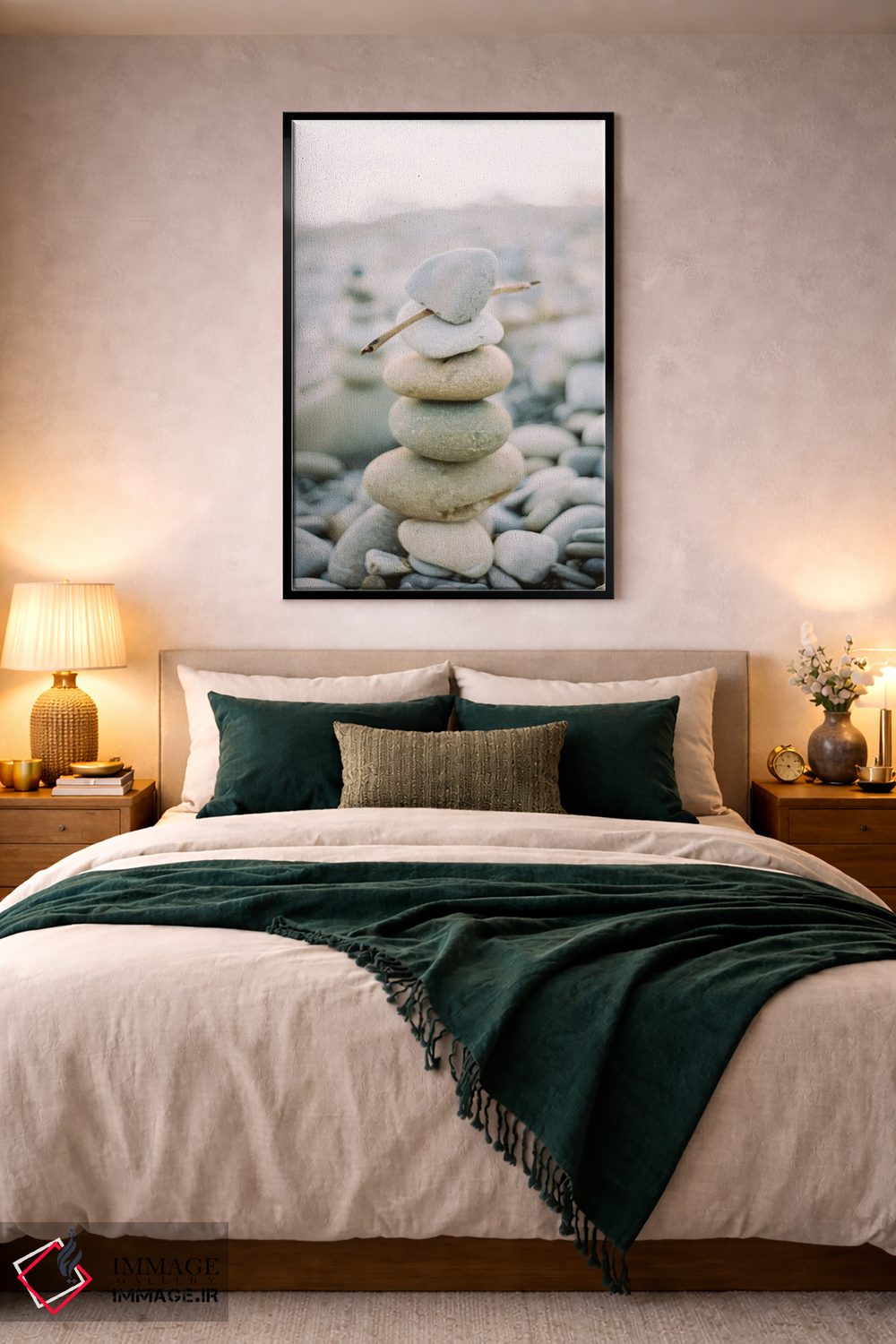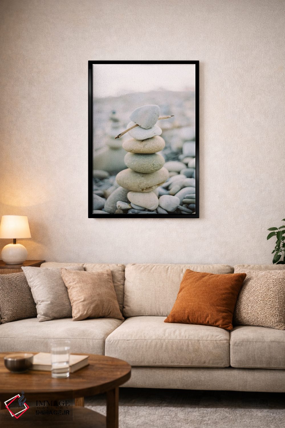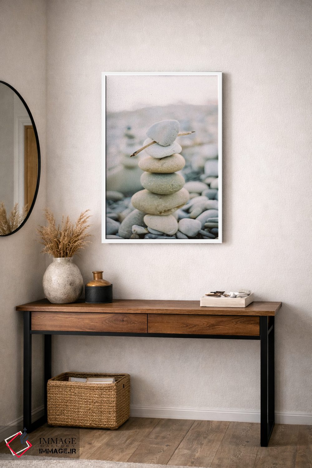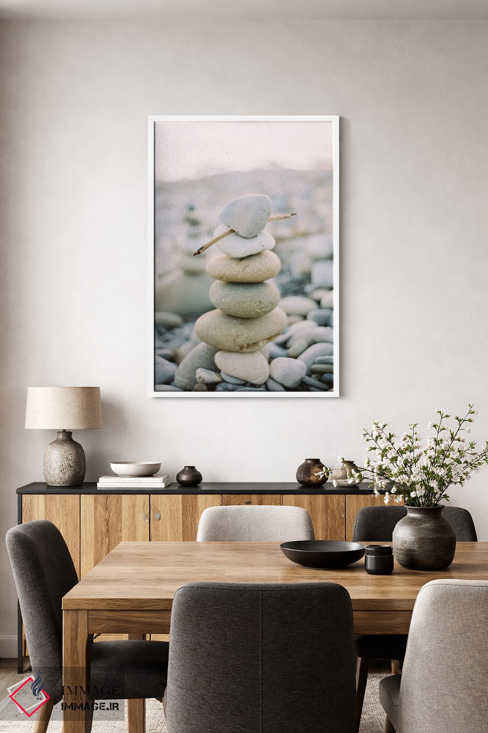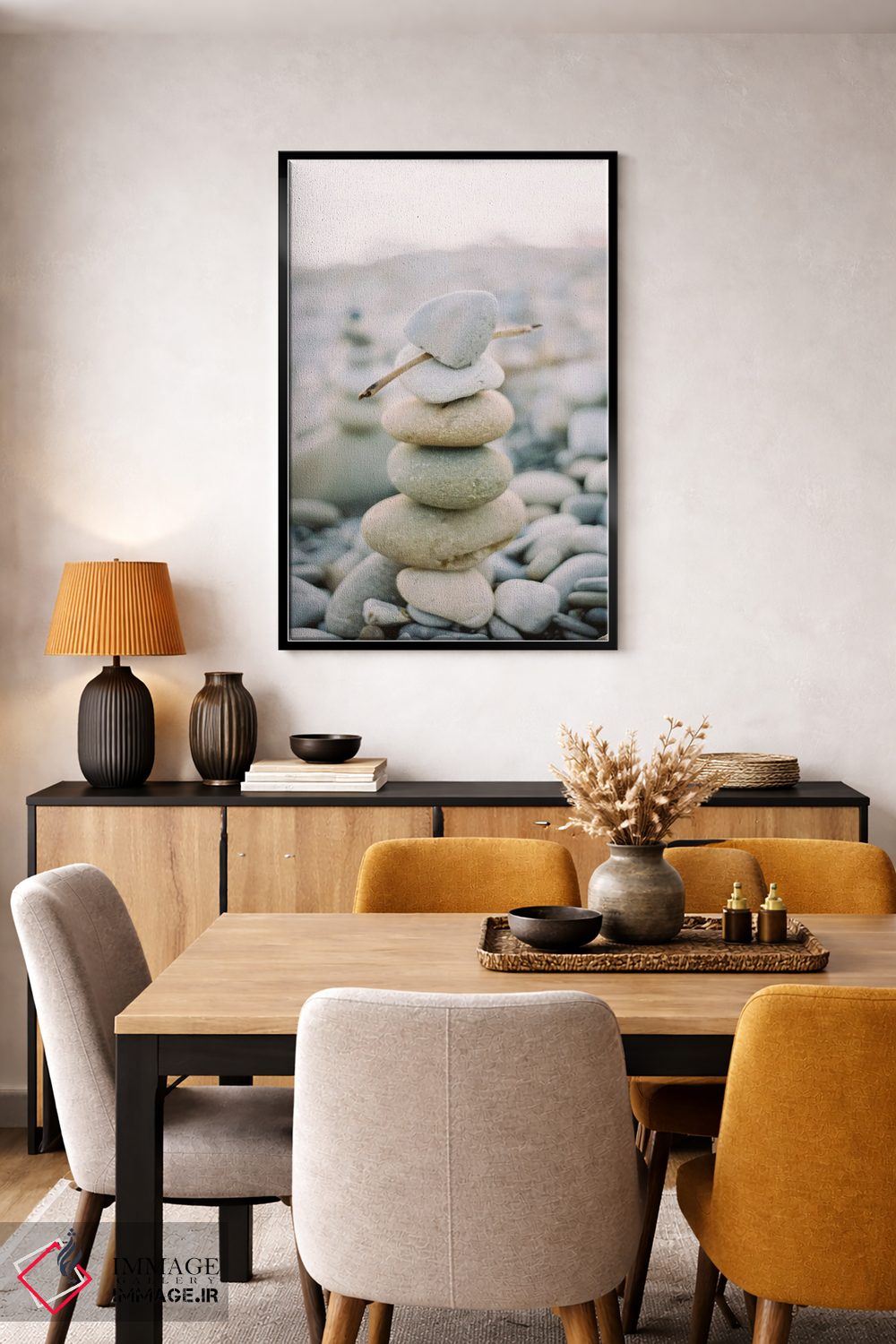 براساس پالت گرم اثر، قاب بلوط روشن (چوبی) پیشنهاد اول است و استخوانی ملایم مکمل. برای سفارشهای پروژهای با ابعاد و قابهای اختصاصی با ایماژ در تماس باشید.