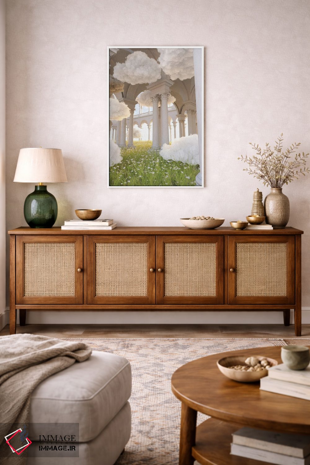 براساس پالت ترکیبی اثر، قاب بلوط روشن (چوبی) پیشنهاد اول است و استخوانی ملایم مکمل. برای سفارشهای پروژهای با ابعاد و قابهای اختصاصی با ایماژ در تماس باشید.