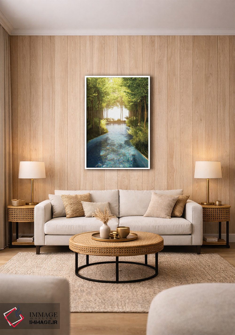 براساس پالت ترکیبی اثر، قاب تیک گرم (چوبی) پیشنهاد اول است و مشکی مات (فریم متوسط) مکمل. برای سفارشهای پروژهای با ابعاد و قابهای اختصاصی با ایماژ در تماس باشید.