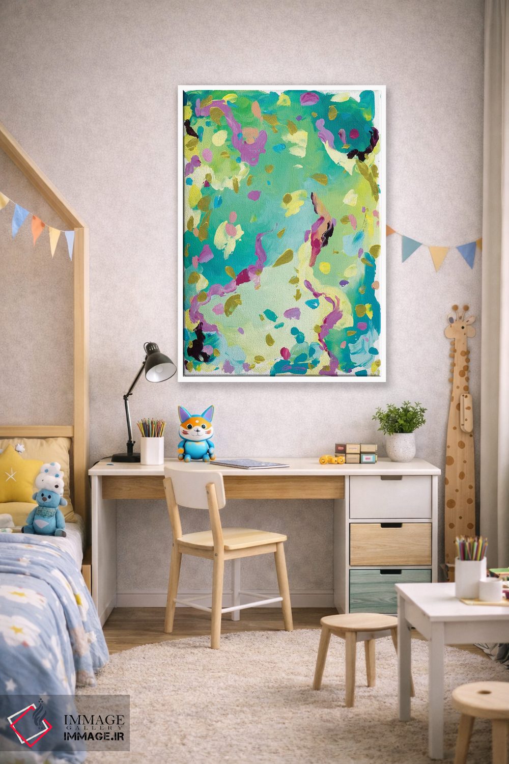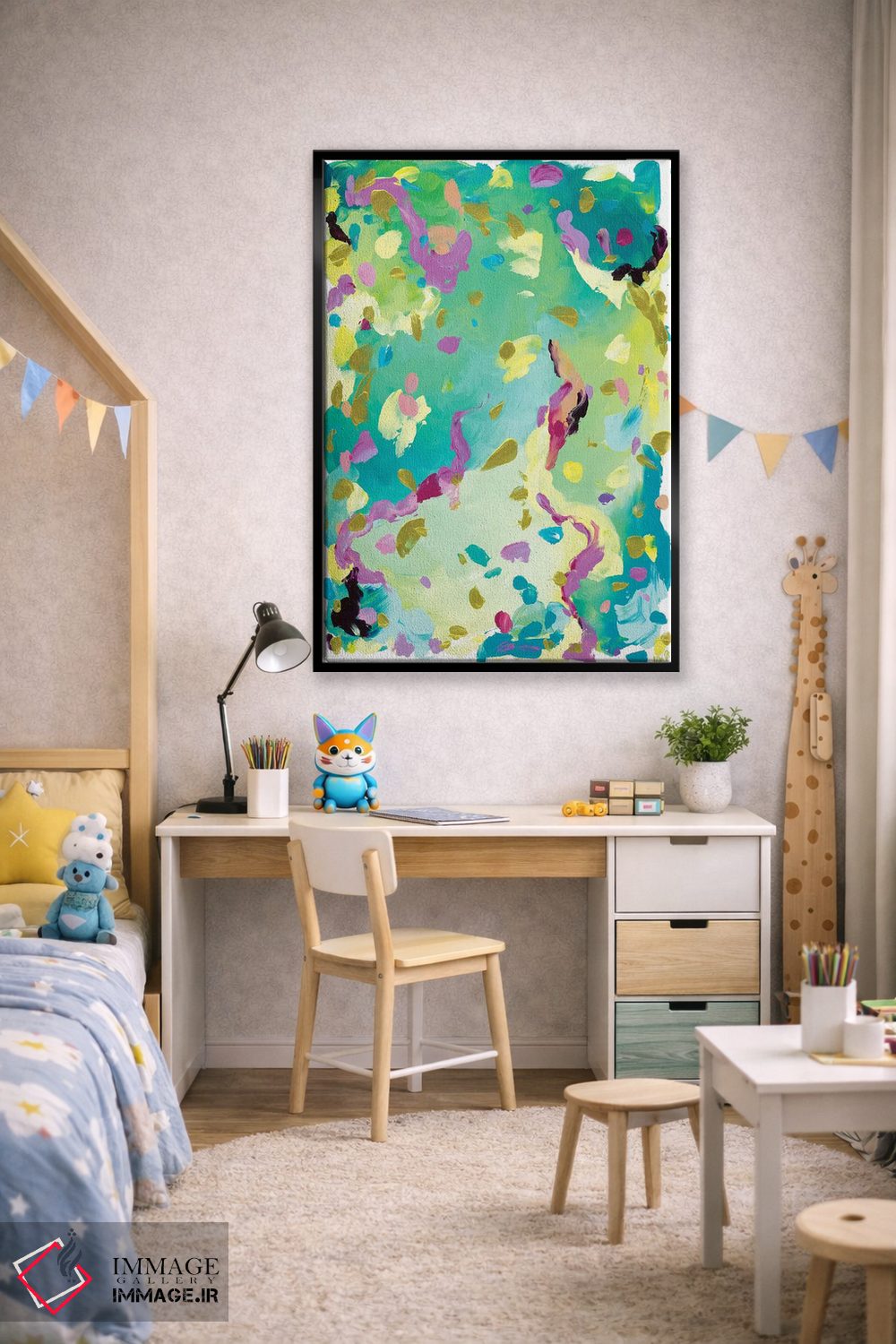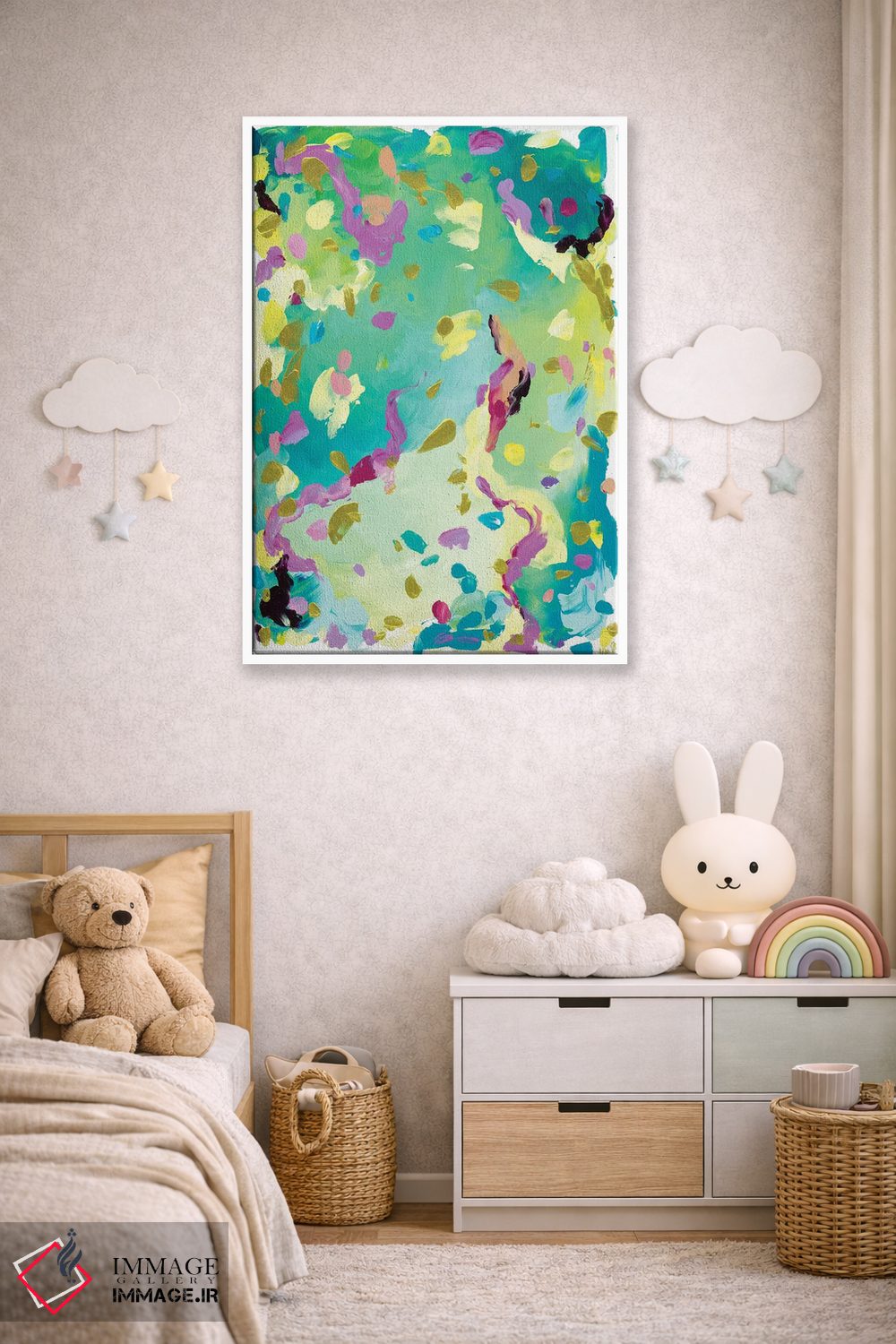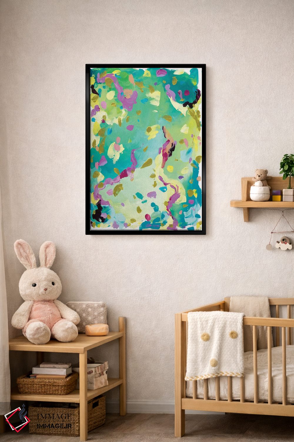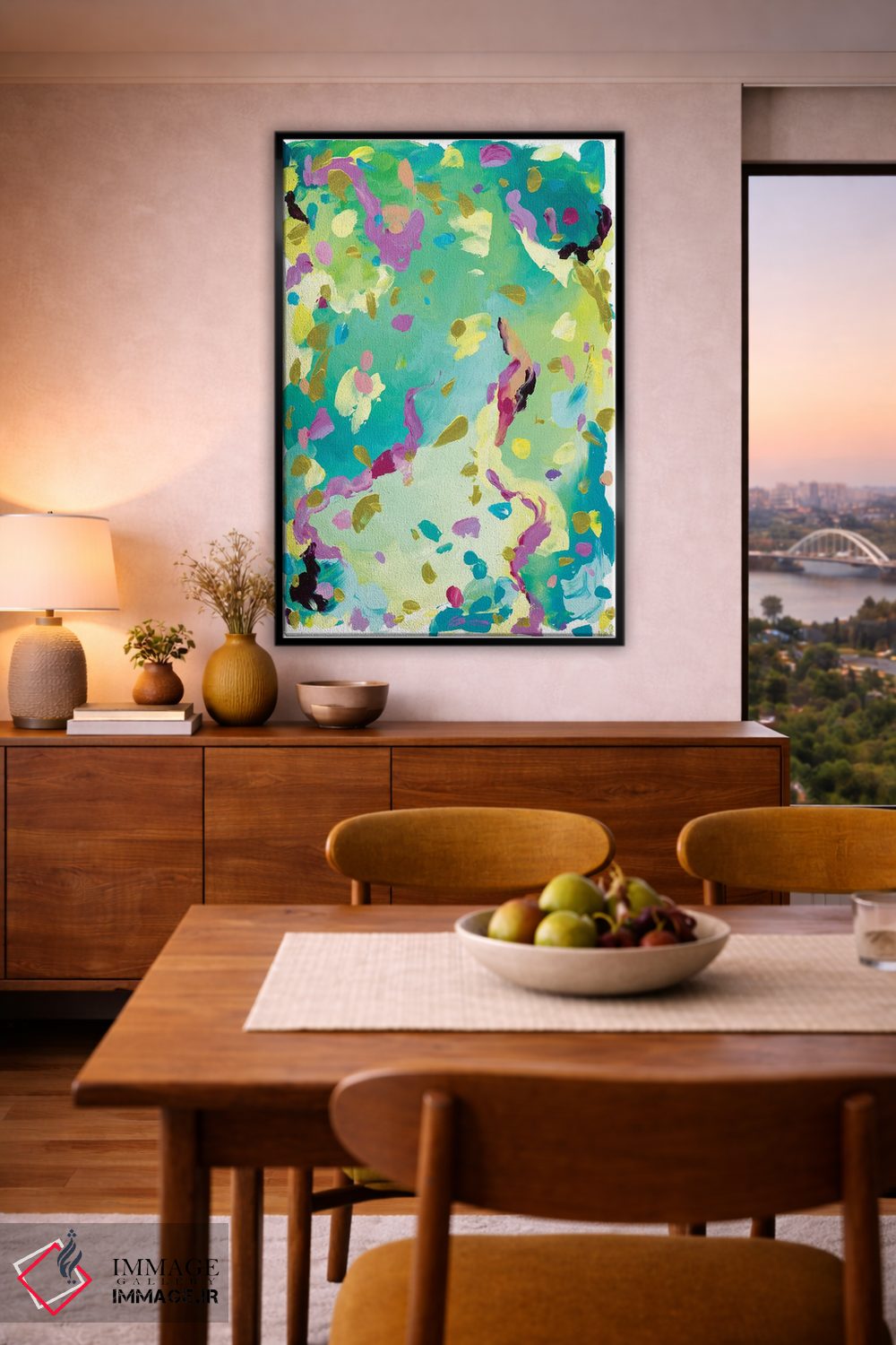 براساس پالت ترکیبی اثر، قاب تیک گرم (چوبی) پیشنهاد اول است و مشکی مات (فریم متوسط) مکمل. برای سفارشهای پروژهای با ابعاد و قابهای اختصاصی با ایماژ در تماس باشید.