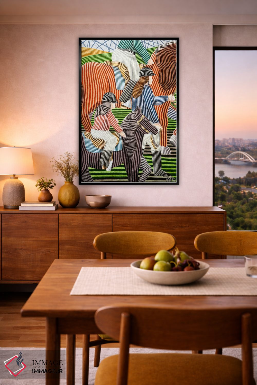 براساس پالت ترکیبی اثر، قاب تیک گرم (چوبی) پیشنهاد اول است و مشکی مات (فریم متوسط) مکمل. برای سفارشهای پروژهای با ابعاد و قابهای اختصاصی با ایماژ در تماس باشید.