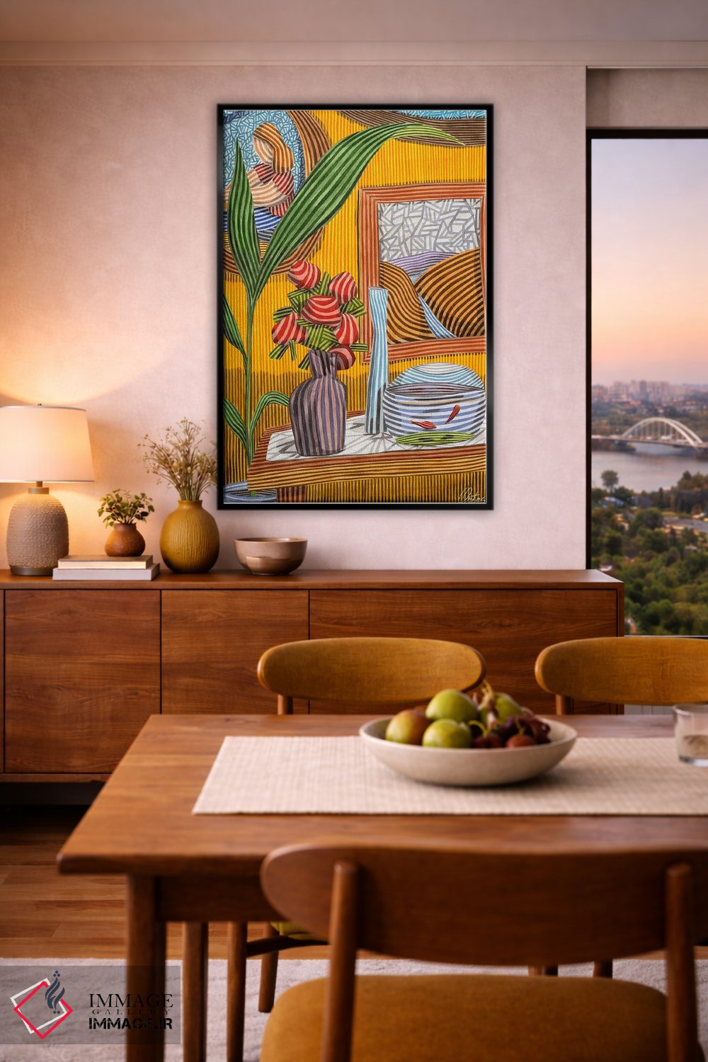 براساس پالت ترکیبی اثر، قاب تیک گرم (چوبی) پیشنهاد اول است و مشکی مات (فریم متوسط) مکمل. برای سفارشهای پروژهای با ابعاد و قابهای اختصاصی با ایماژ در تماس باشید.