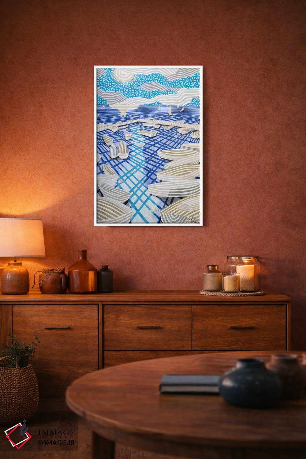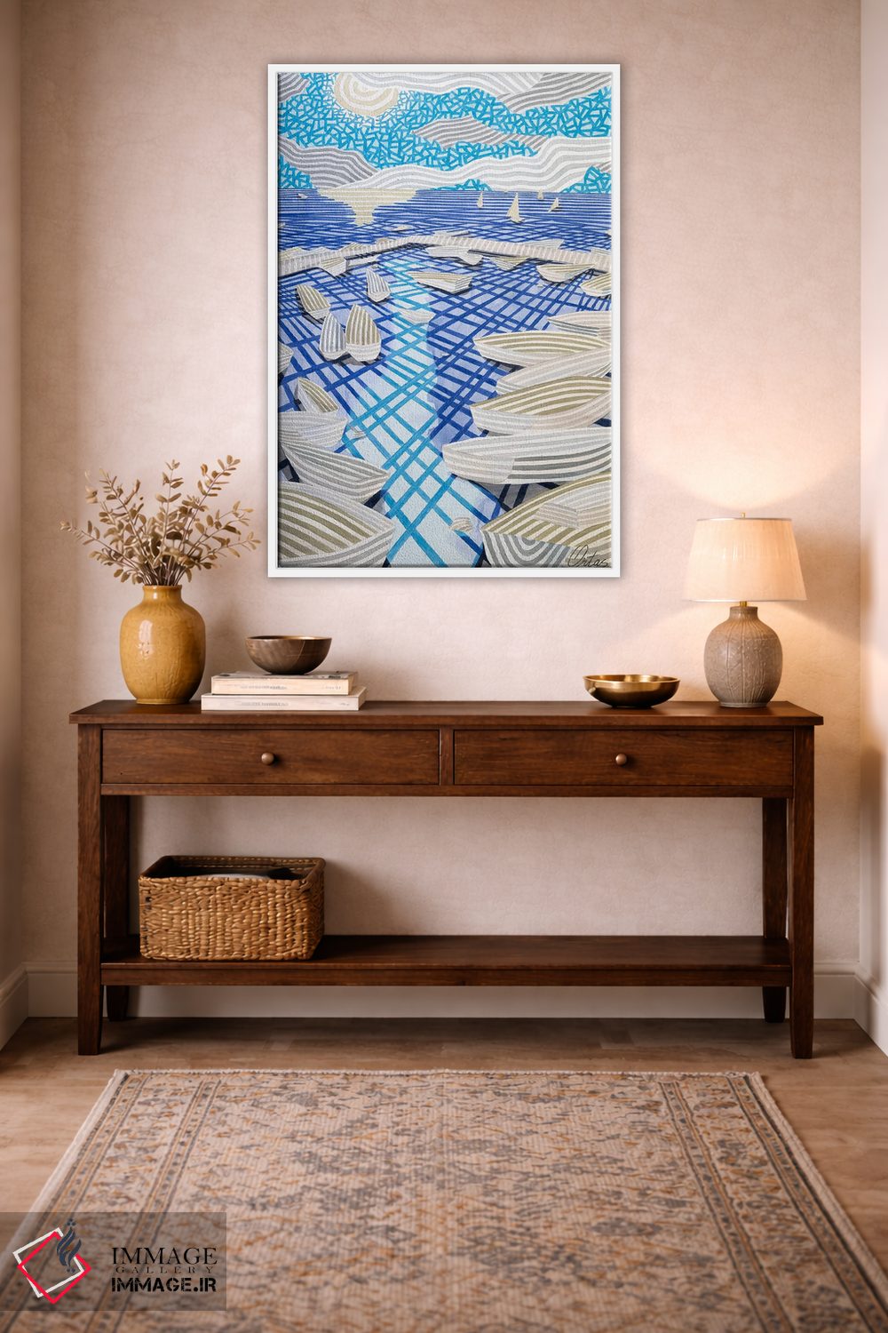 براساس پالت سرد اثر، قاب سفید مات (فریم باریک) پیشنهاد اول است و نقرهای برسخورده (متالیک) مکمل. برای سفارشهای پروژهای با ابعاد و قابهای اختصاصی با ایماژ در تماس باشید.