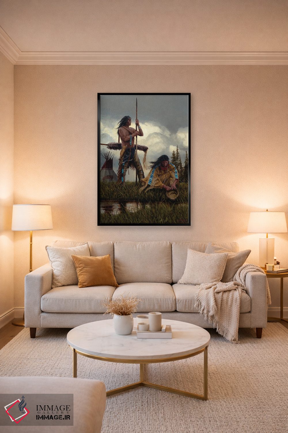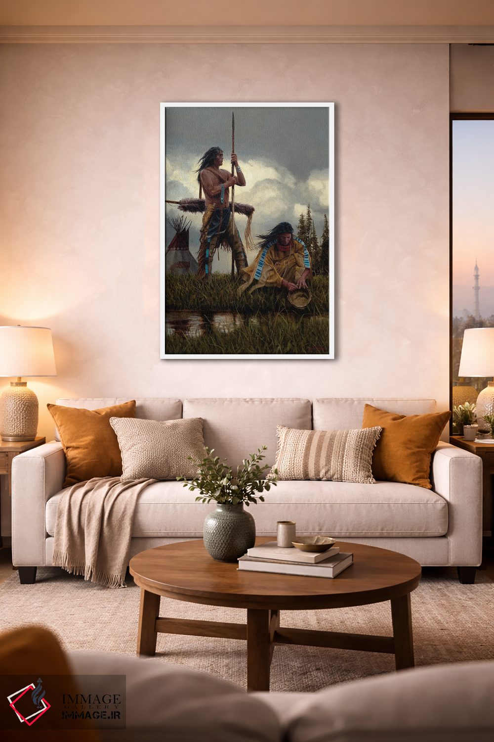 براساس پالت گرم اثر، قاب بلوط روشن (چوبی) پیشنهاد اول است و استخوانی ملایم مکمل. برای سفارشهای پروژهای با ابعاد و قابهای اختصاصی با ایماژ در تماس باشید.