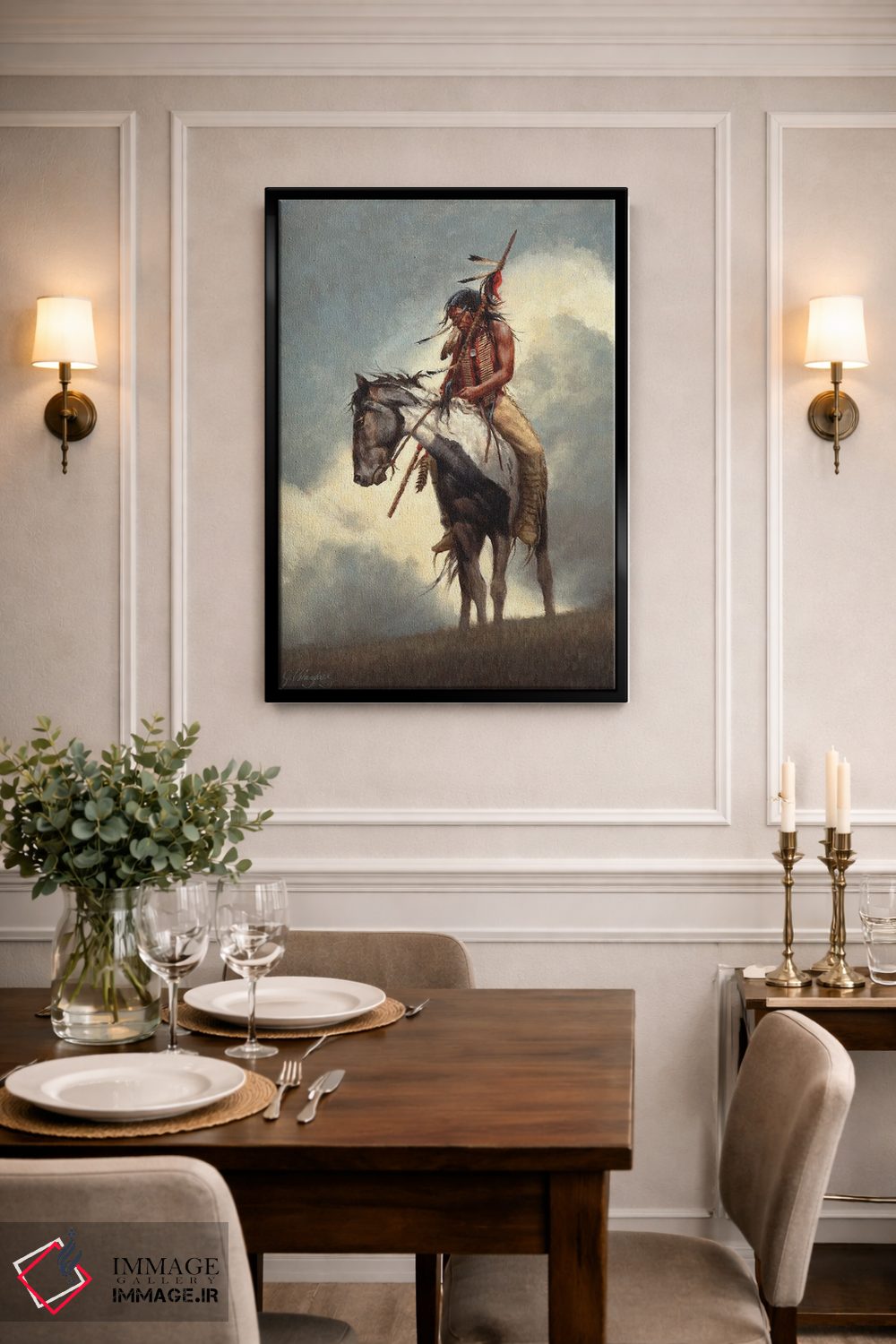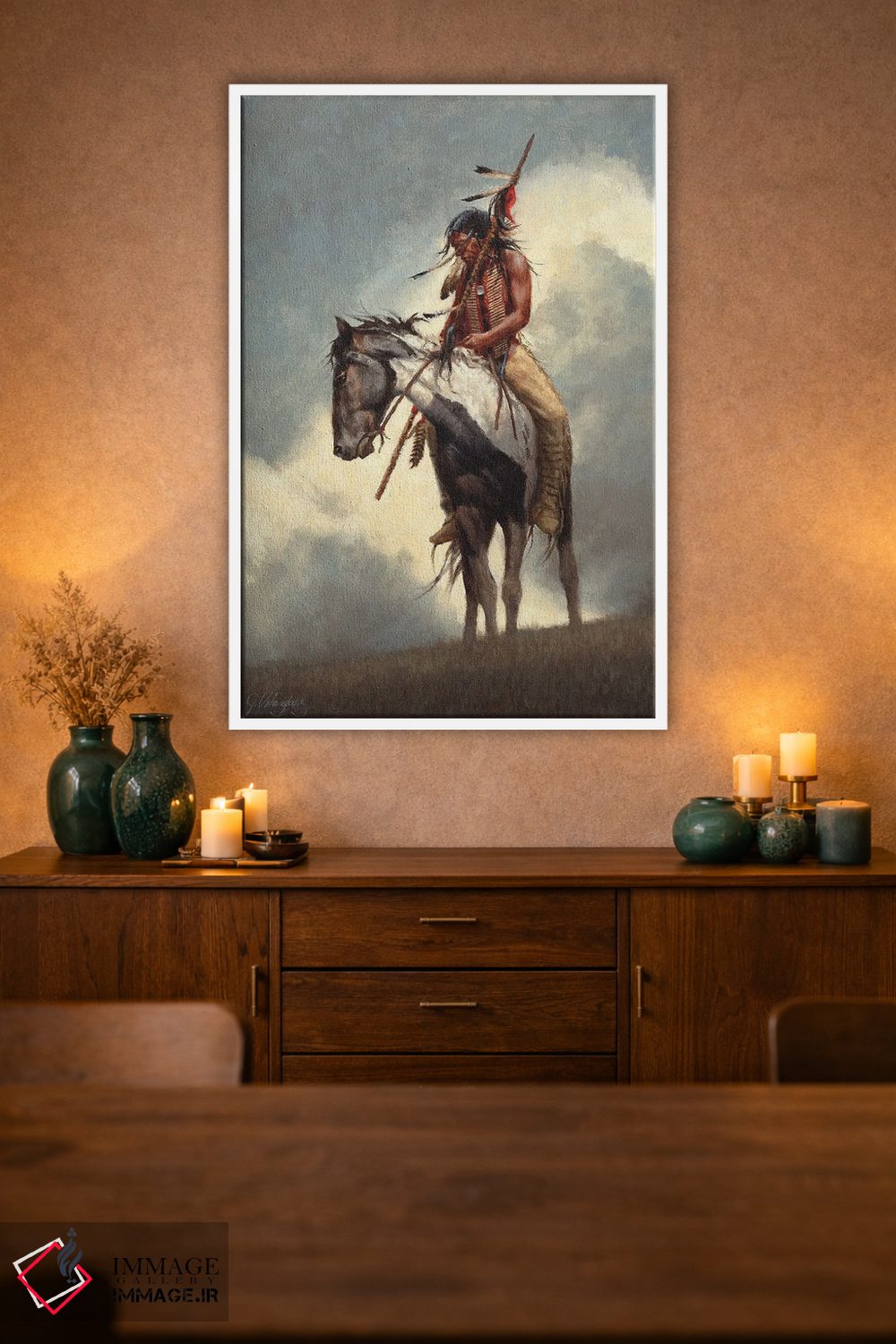 براساس پالت گرم اثر، قاب بلوط روشن (چوبی) پیشنهاد اول است و استخوانی ملایم مکمل. برای سفارشهای پروژهای با ابعاد و قابهای اختصاصی با ایماژ در تماس باشید.