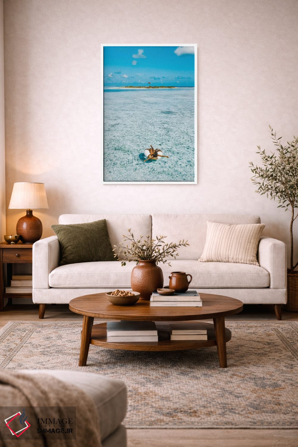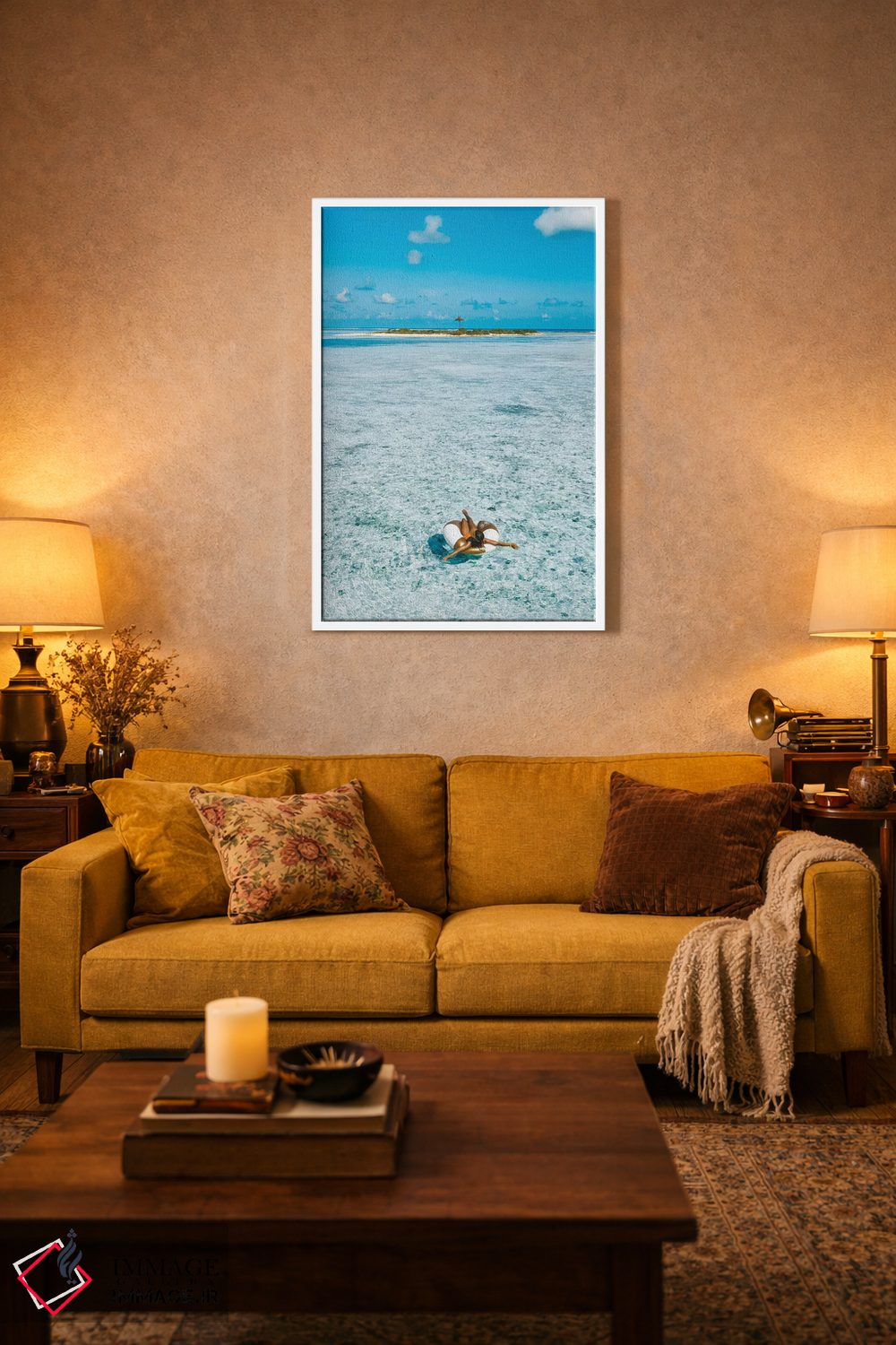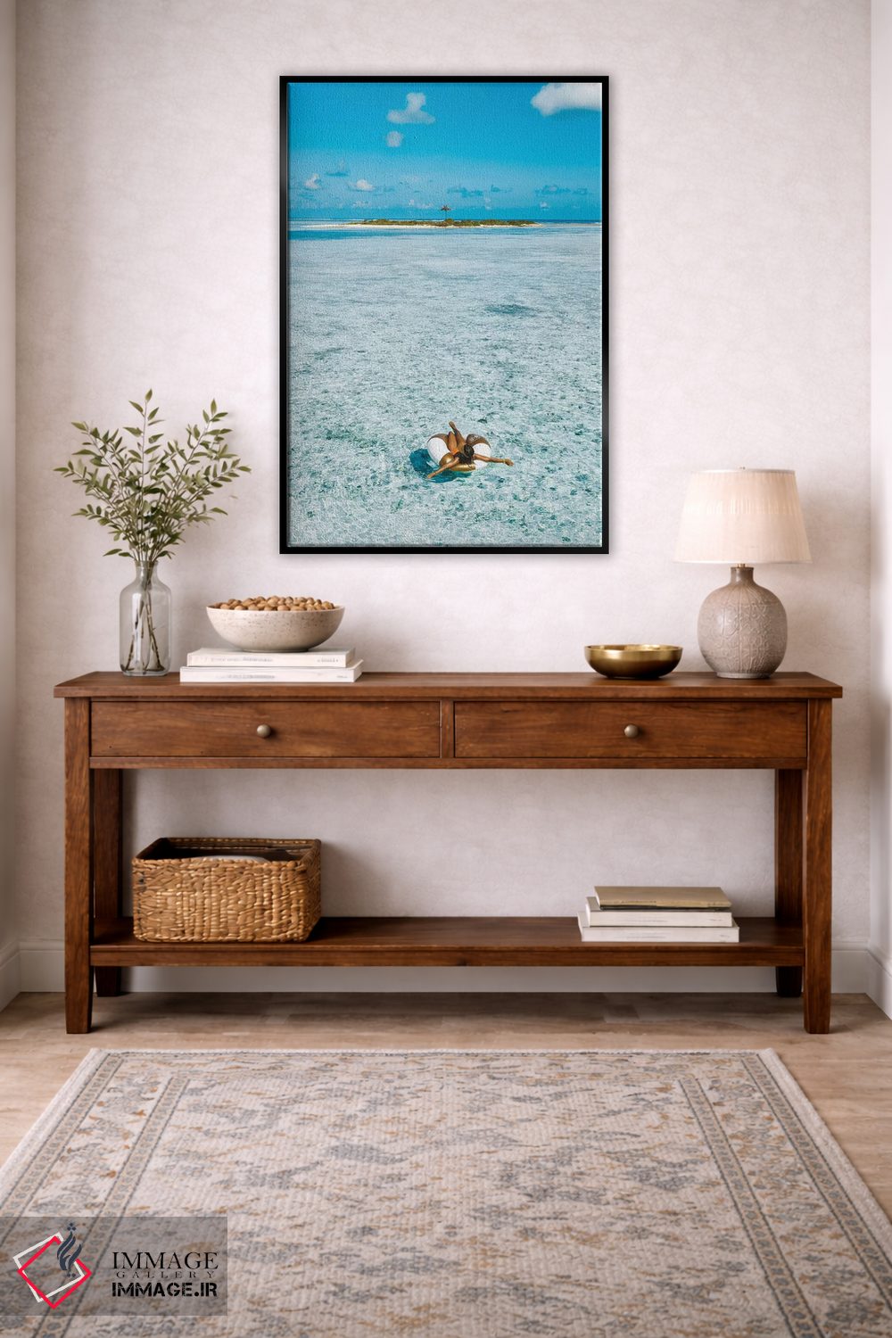 تابلو دکوراتیو دختر با حلقه استخر در جزیره مالدیو اثر جیمز وودیکا - نمای روبه‌رو روی دیوار