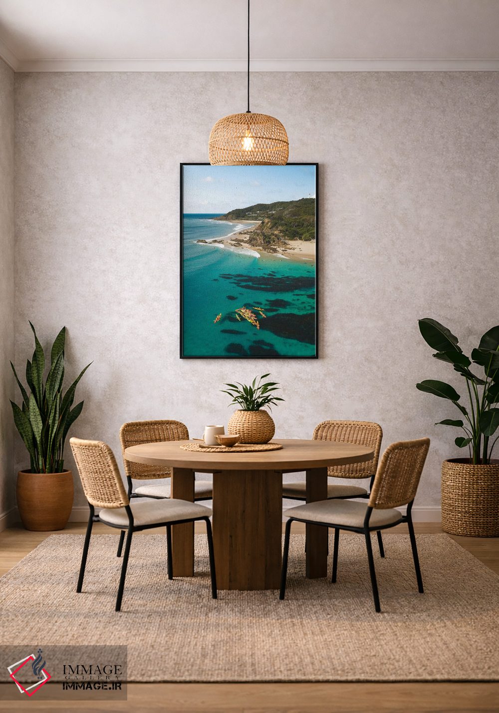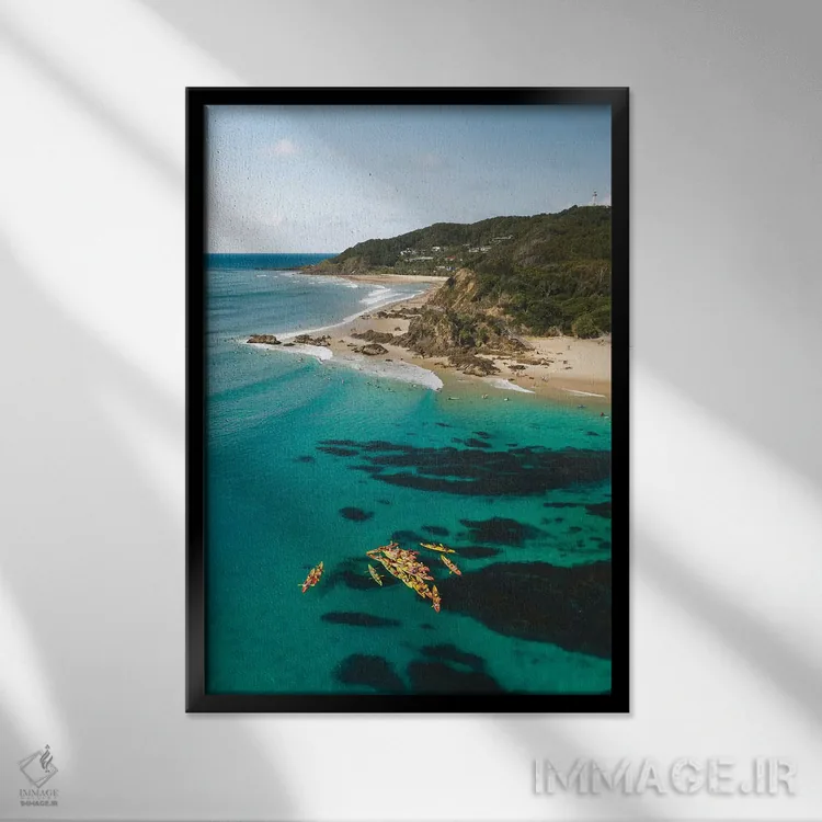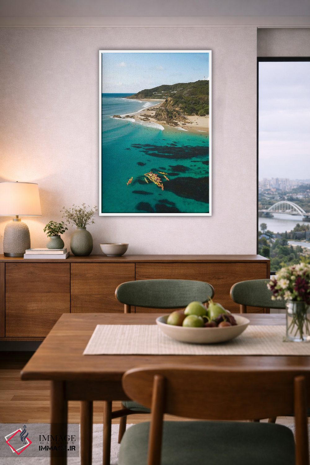 «منظرهٔ هوایی کایاکسواری در اقیانوس» اثرِ «جیمز وودیکا» میتواند سلیقهٔ صاحبخانه را بیاغراق نشان بدهد؛ برای دیوار بالای کنسول یا شومینه پیشنهاد میشود. در کنار قاب مناسب، جلوهٔ کار چند برابر میشود.
