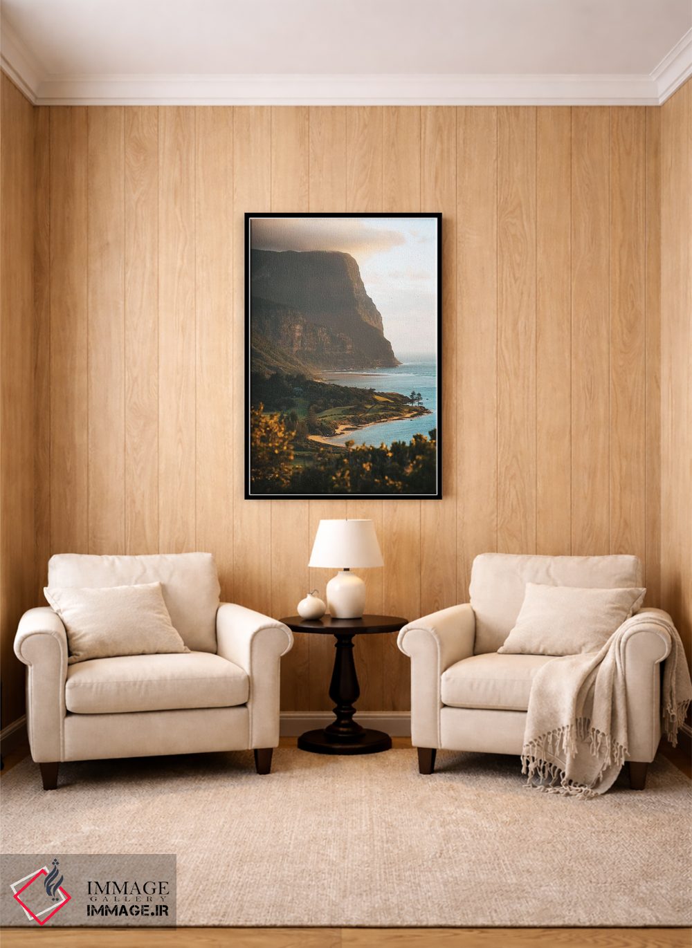 براساس پالت گرم اثر، قاب بلوط روشن (چوبی) پیشنهاد اول است و استخوانی ملایم مکمل. برای سفارشهای پروژهای با ابعاد و قابهای اختصاصی با ایماژ در تماس باشید.