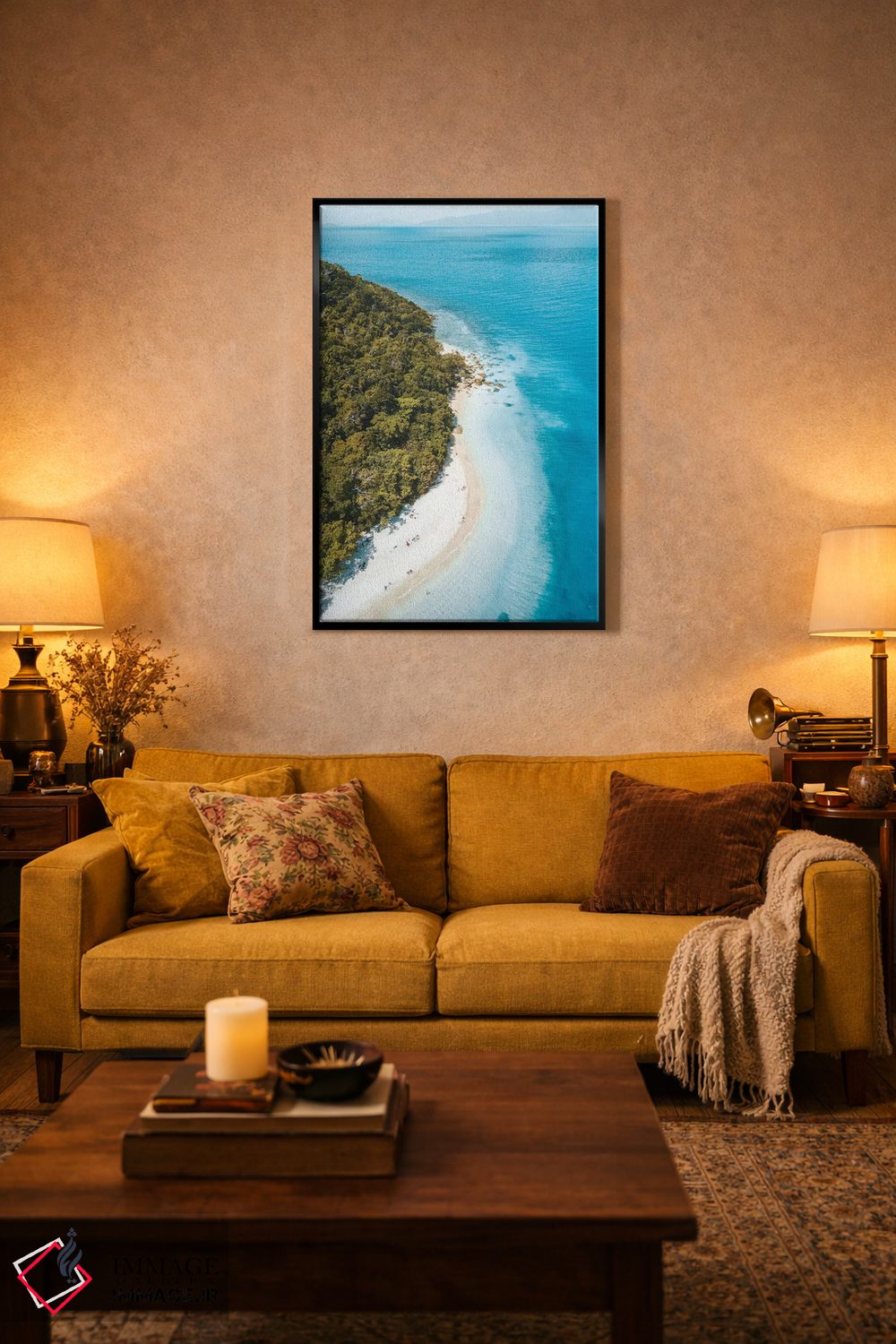 وقتی چیدمان را با دقت میچینید، «نمای هوایی ساحل جزیره گرمسیری» اثرِ «جیمز وودیکا» یک حس «تمامشده و پرداختشده» ایجاد میکند؛ برای کنار کتابخانه یا میز کار پیشنهاد میشود. در چیدمانهای مختلف، هماهنگپذیر و انعطافدار است.