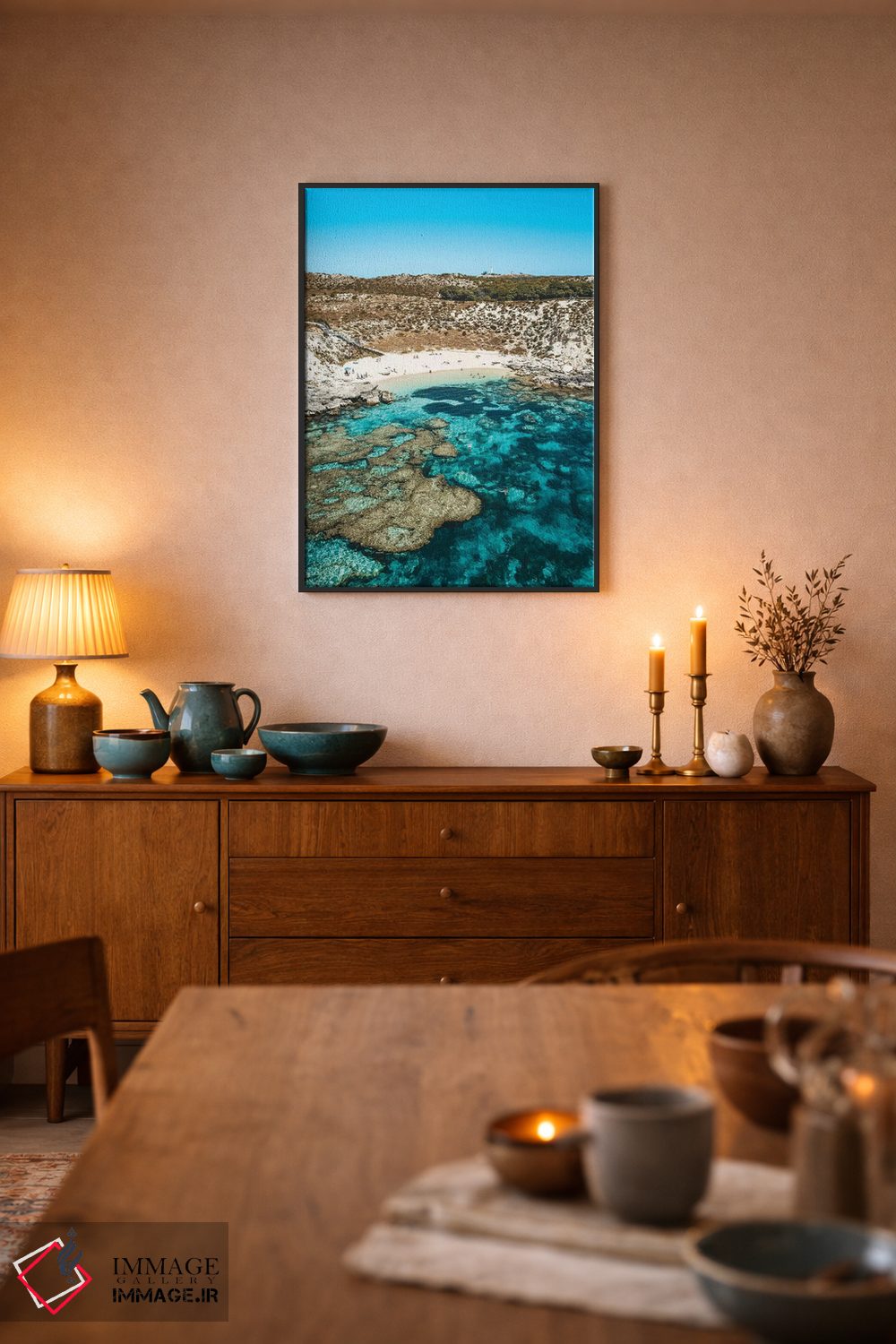 براساس پالت ترکیبی اثر، قاب بلوط روشن (چوبی) پیشنهاد اول است و استخوانی ملایم مکمل. برای سفارشهای پروژهای با ابعاد و قابهای اختصاصی با ایماژ در تماس باشید.