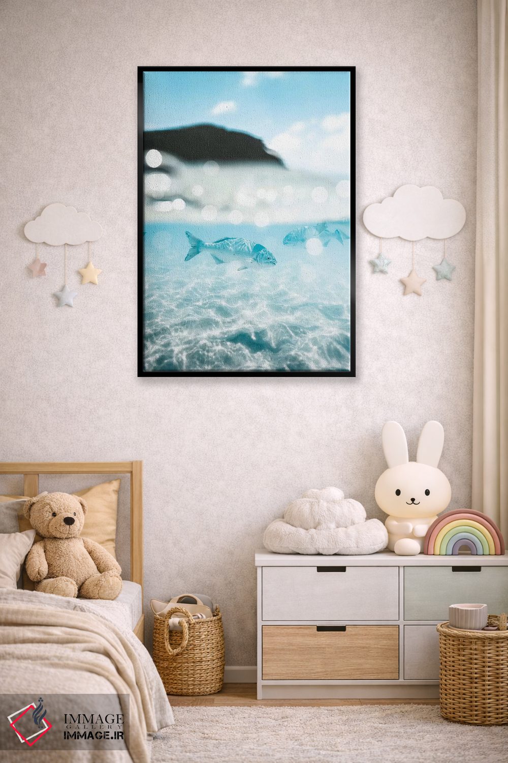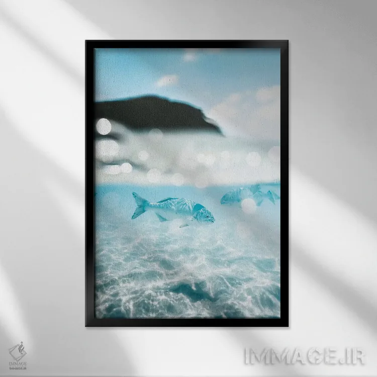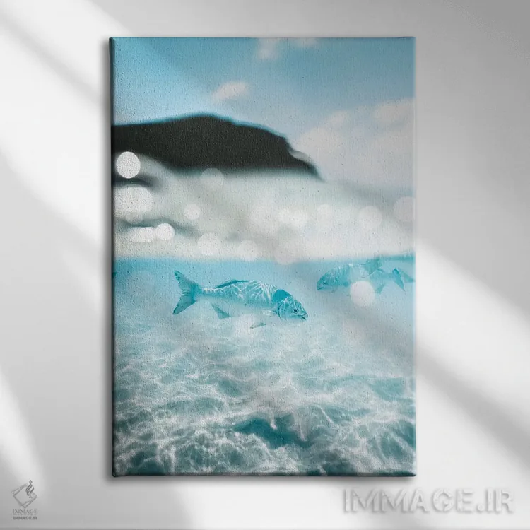 برای فضایی که میخواهید مرتبتر و حرفهایتر دیده شود، «تصویر دوگانهی زیر و روی آب از ماهیها (۵۰/۵۰)» اثرِ «جیمز وودیکا» جلوهٔ رنگها را طبیعیتر و متعادلتر نشان میدهد؛ برای دیوار بالای کنسول یا شومینه پیشنهاد میشود. به دیوار حس «تمامشده» میدهد.