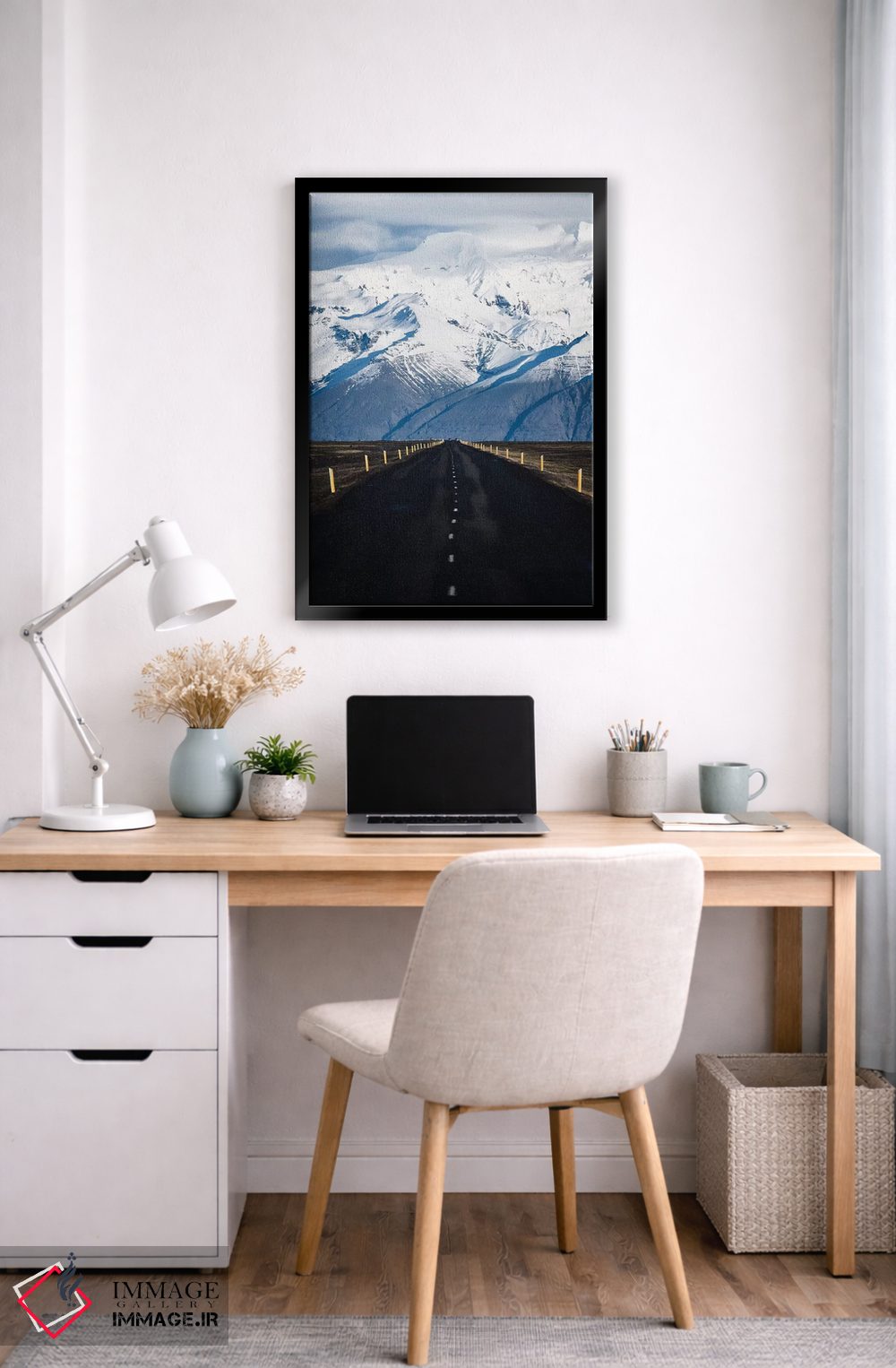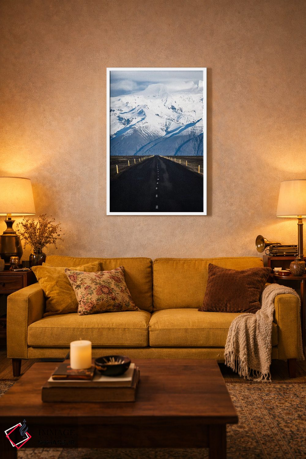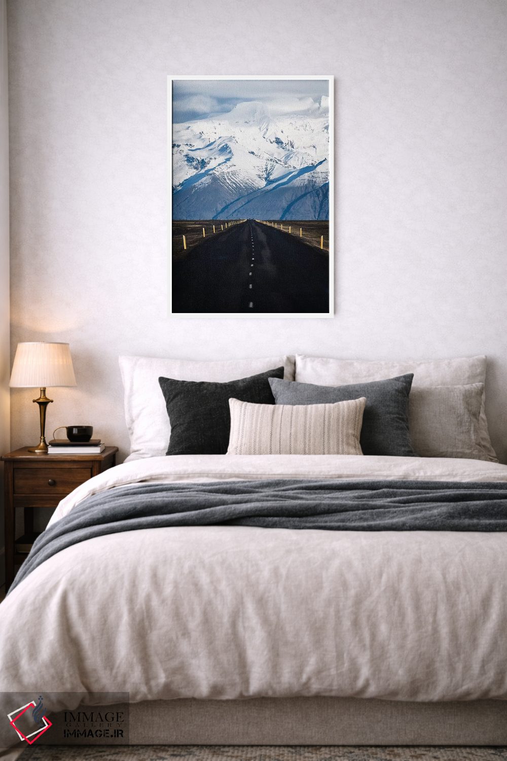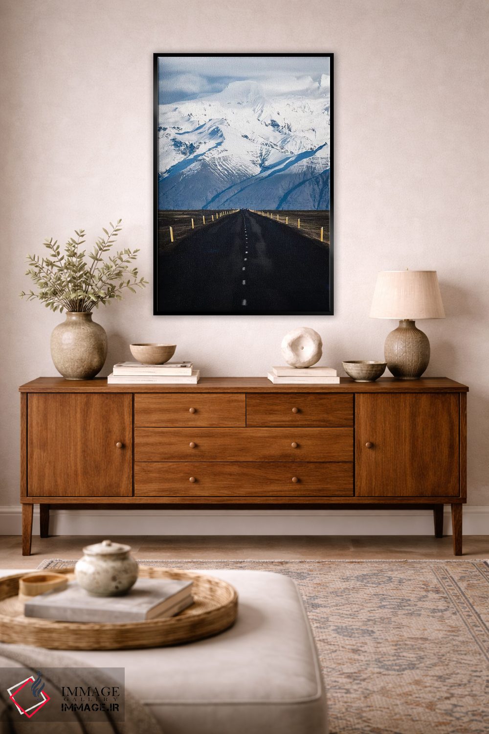 برای فضایی که میخواهید مرتبتر و حرفهایتر دیده شود، «جاده کوهستانی ایسلند» اثرِ «جیمز وودیکا» روی دیوار، تمیز و دقیق دیده میشود؛ برای نشیمنهای صمیمی و پذیراییهای شیک پیشنهاد میشود. به فضا حس «گالری خانگی» میدهد، بدون اینکه اغراق کند.