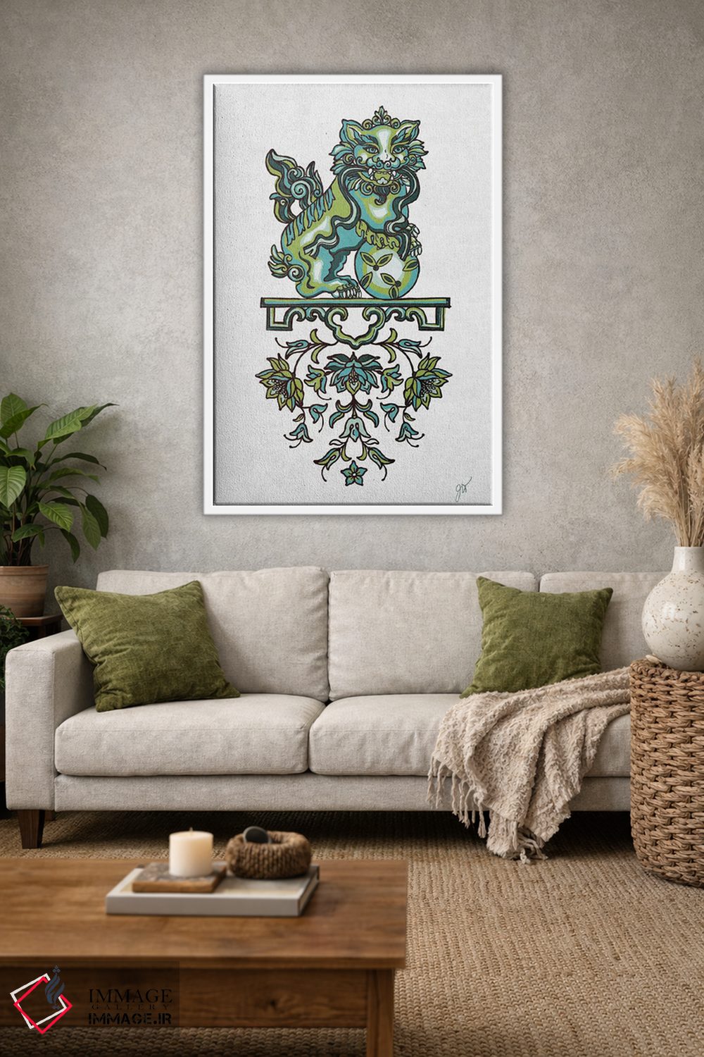 براساس پالت ترکیبی اثر، قاب تیک گرم (چوبی) پیشنهاد اول است و مشکی مات (فریم متوسط) مکمل. برای سفارشهای پروژهای با ابعاد و قابهای اختصاصی با ایماژ در تماس باشید.