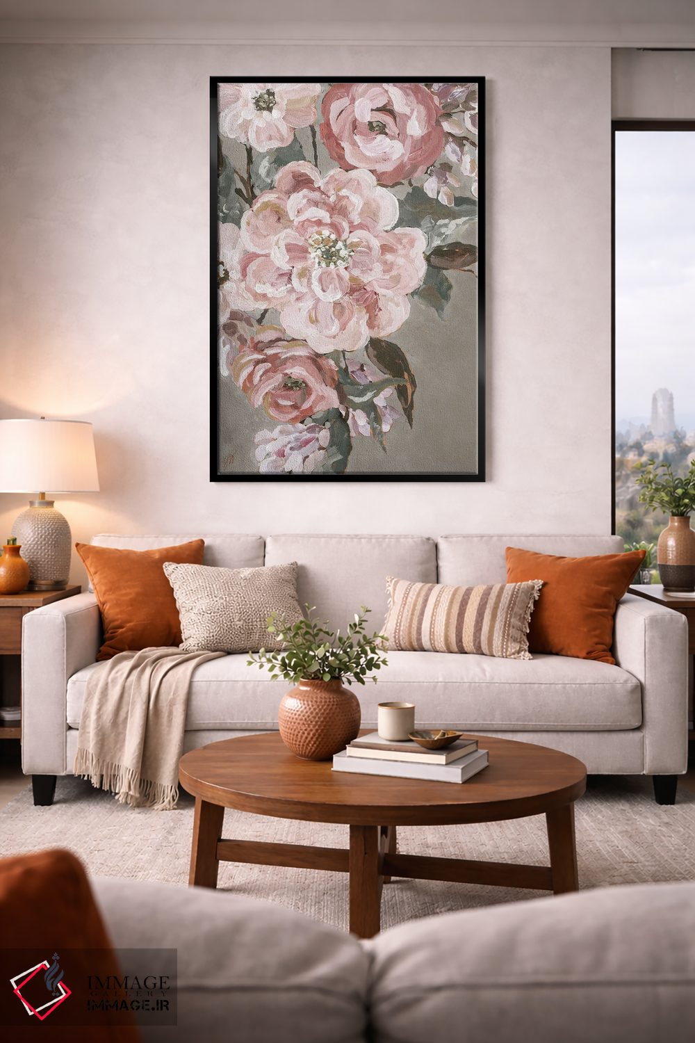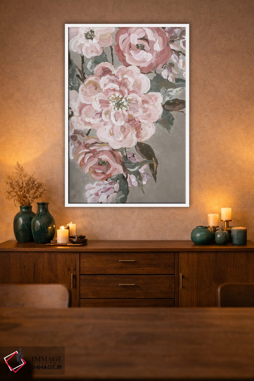 براساس پالت گرم اثر، قاب بلوط روشن (چوبی) پیشنهاد اول است و استخوانی ملایم مکمل. برای سفارشهای پروژهای با ابعاد و قابهای اختصاصی با ایماژ در تماس باشید.