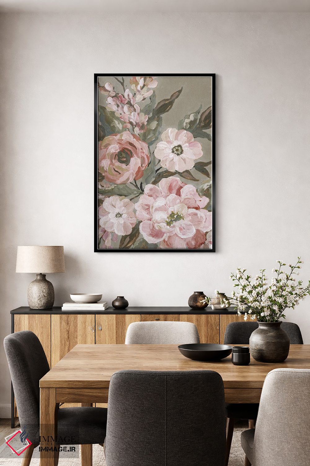 براساس پالت گرم اثر، قاب بلوط روشن (چوبی) پیشنهاد اول است و استخوانی ملایم مکمل. برای سفارشهای پروژهای با ابعاد و قابهای اختصاصی با ایماژ در تماس باشید.