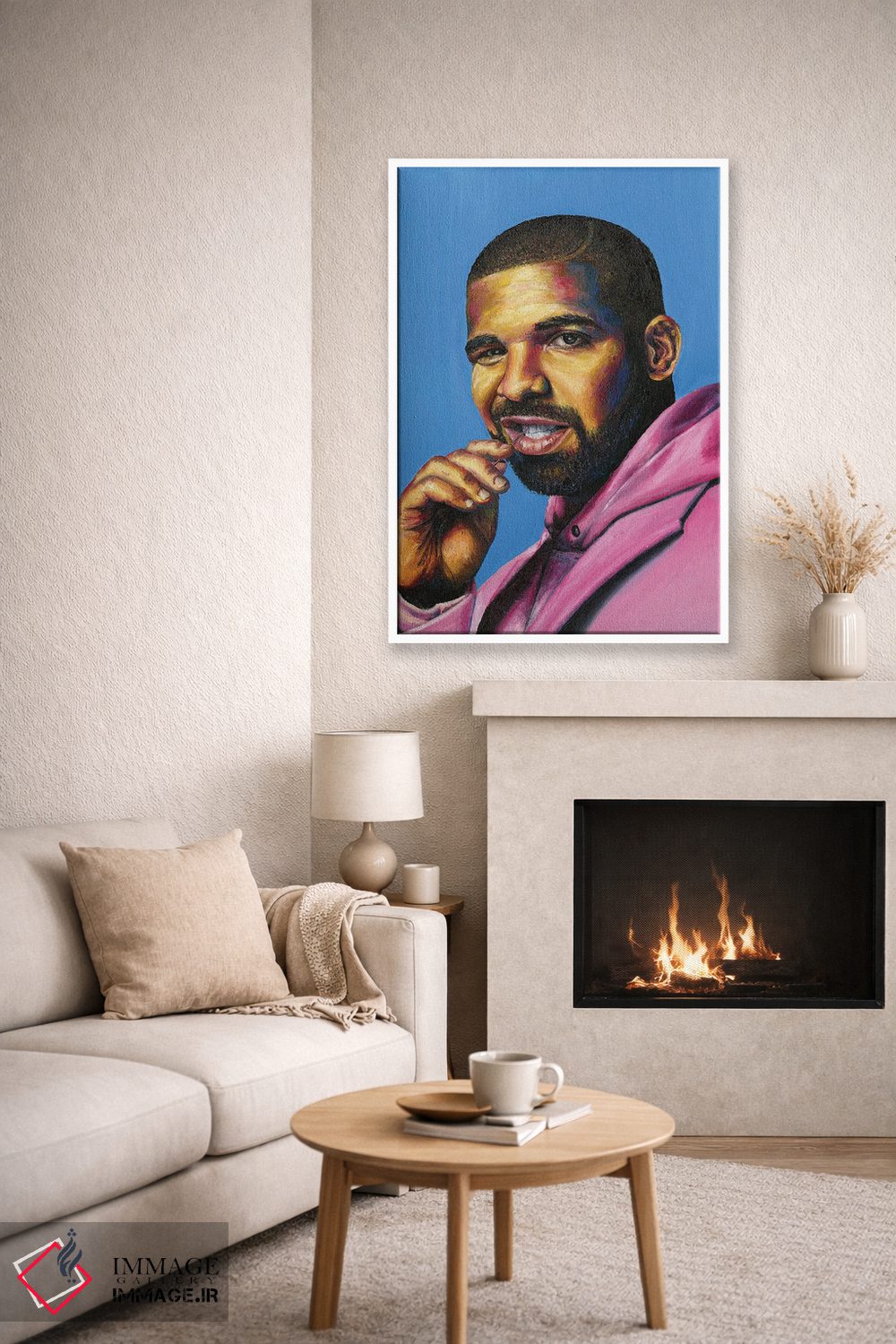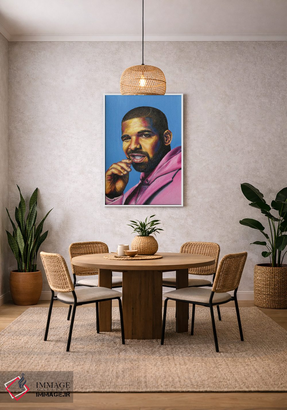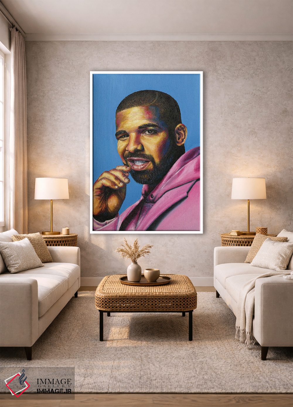 برای دیواری که دوست دارید «حرف داشته باشد»، «دریک (خواننده)» اثرِ «جناویو لویی» تضادهای رنگی را خوشقوارهتر میکند؛ برای کنار کتابخانه یا میز کار پیشنهاد میشود. روی دیوار، طبیعی و متعادل دیده میشود—بیاغراق و درست.