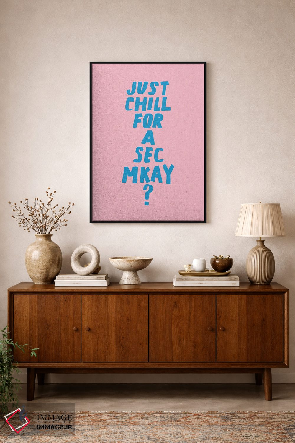 براساس پالت ترکیبی اثر، قاب تیک گرم (چوبی) پیشنهاد اول است و مشکی مات (فریم متوسط) مکمل. برای سفارشهای پروژهای با ابعاد و قابهای اختصاصی با ایماژ در تماس باشید.