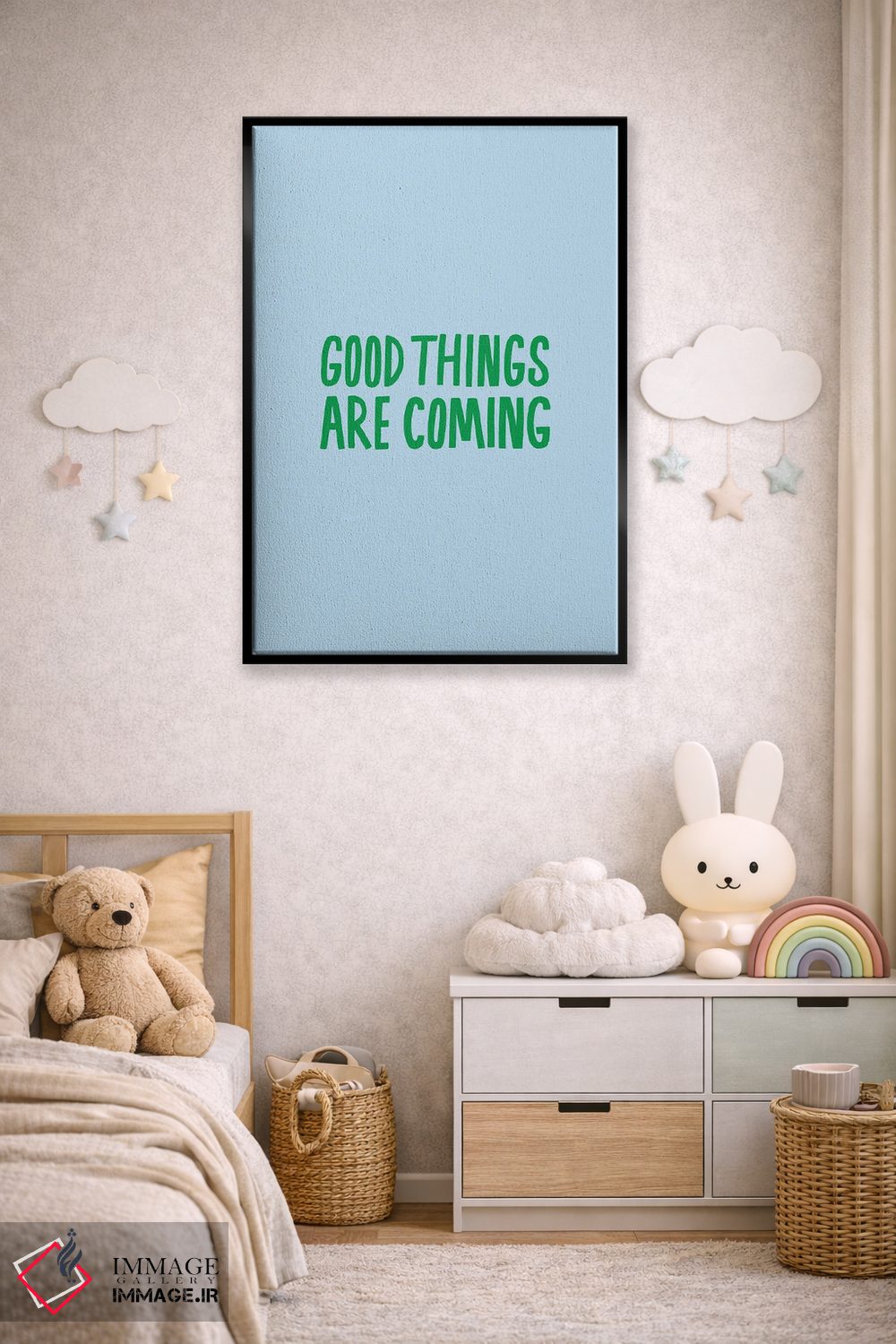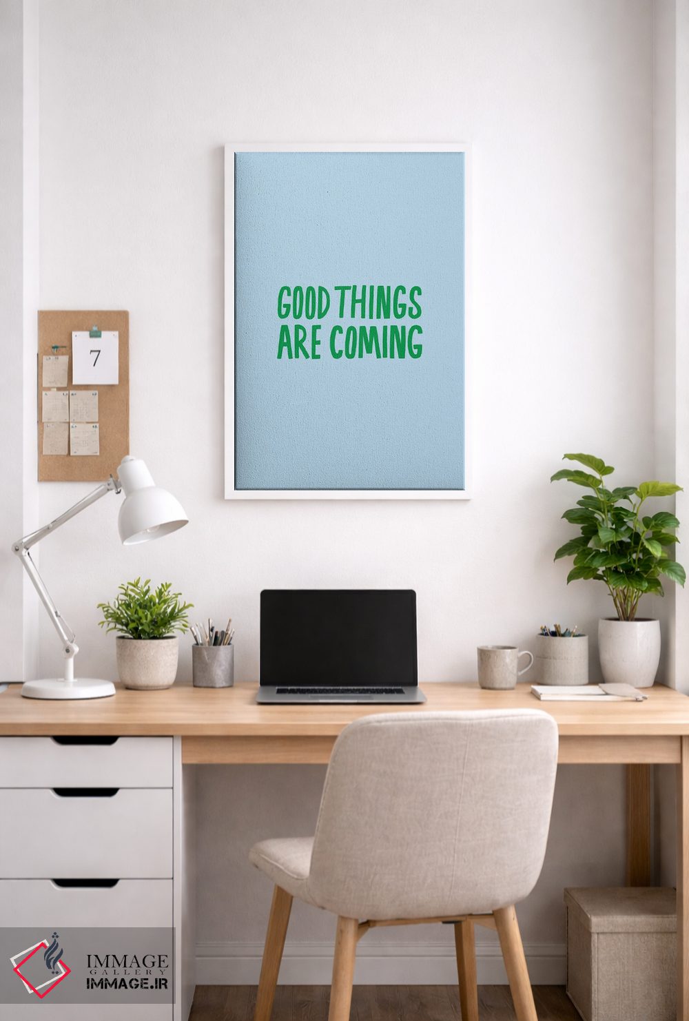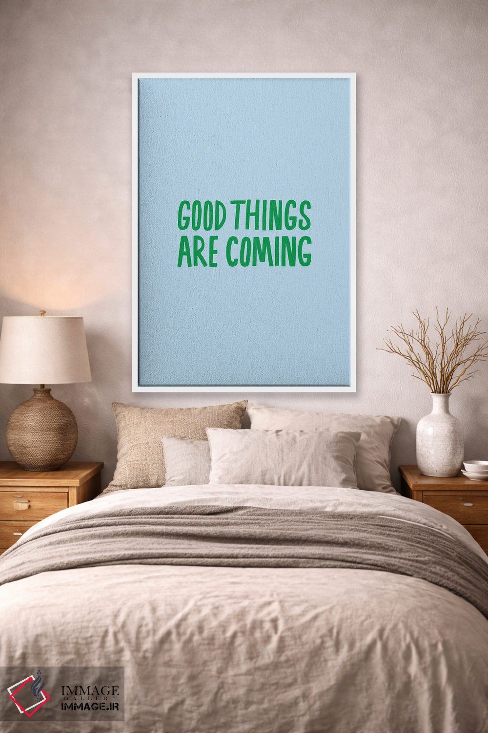 «اتفاقات خوب در راه است» اثرِ «جولیا والک» یک قاب تایپوگرافیک است که ریتم فضا را منظم نگه میدارد؛ برای دیوارهای سفید و چیدمانهای ساده، گزینهی خوبی است.