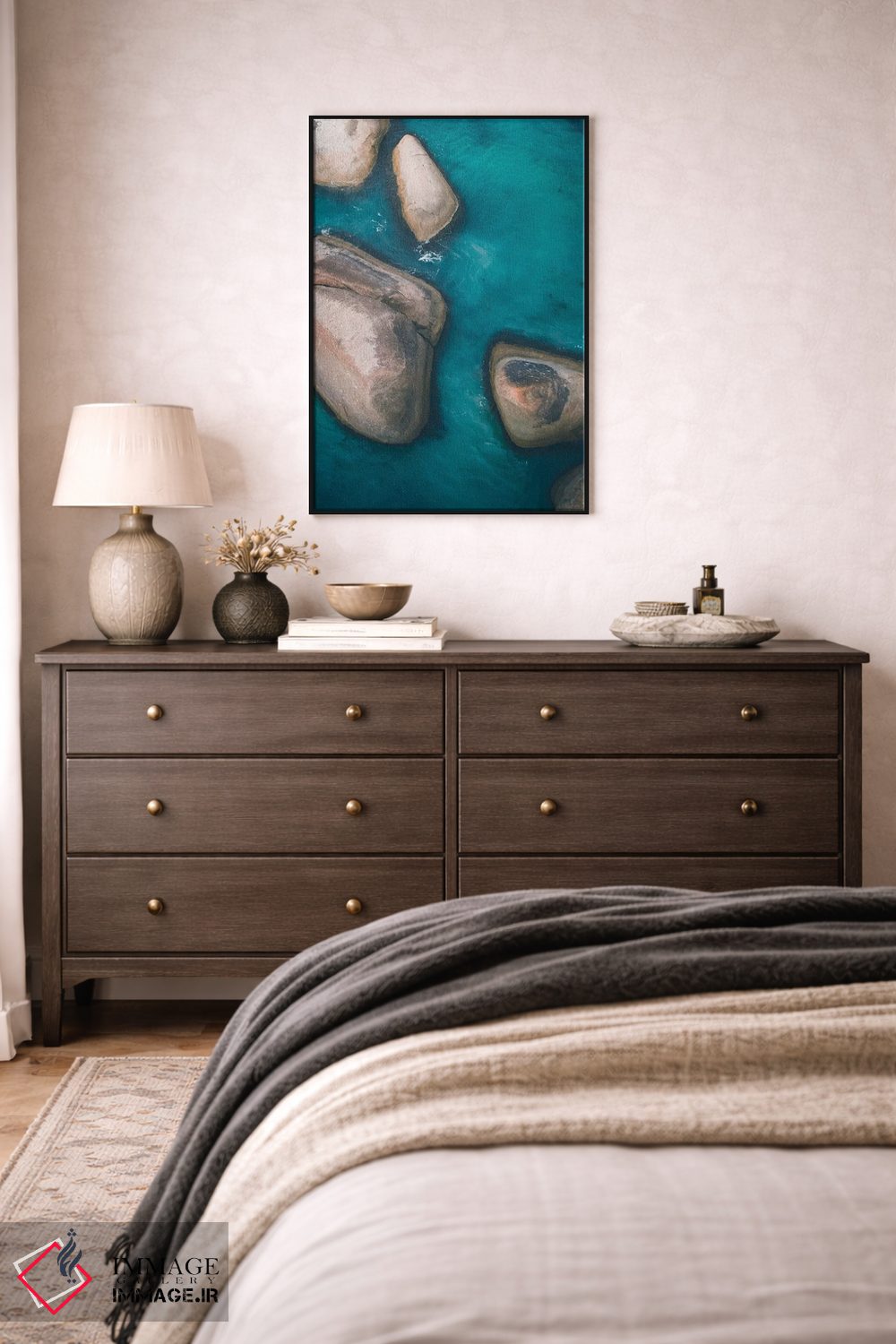 براساس پالت ترکیبی اثر، قاب بلوط روشن (چوبی) پیشنهاد اول است و استخوانی ملایم مکمل. برای سفارشهای پروژهای با ابعاد و قابهای اختصاصی با ایماژ در تماس باشید.