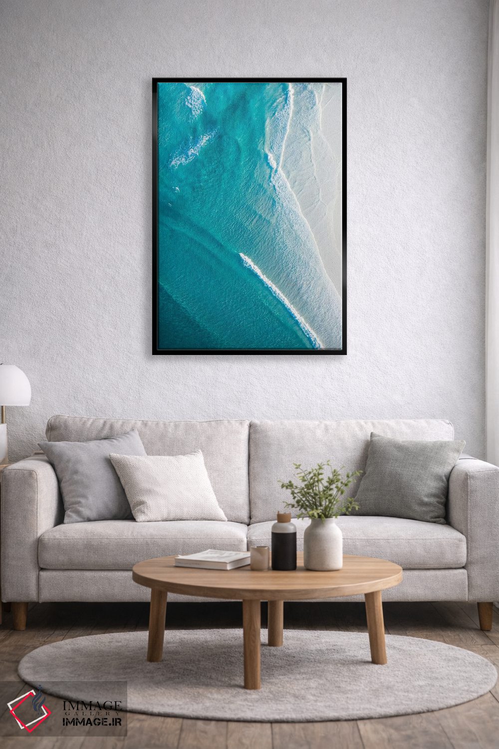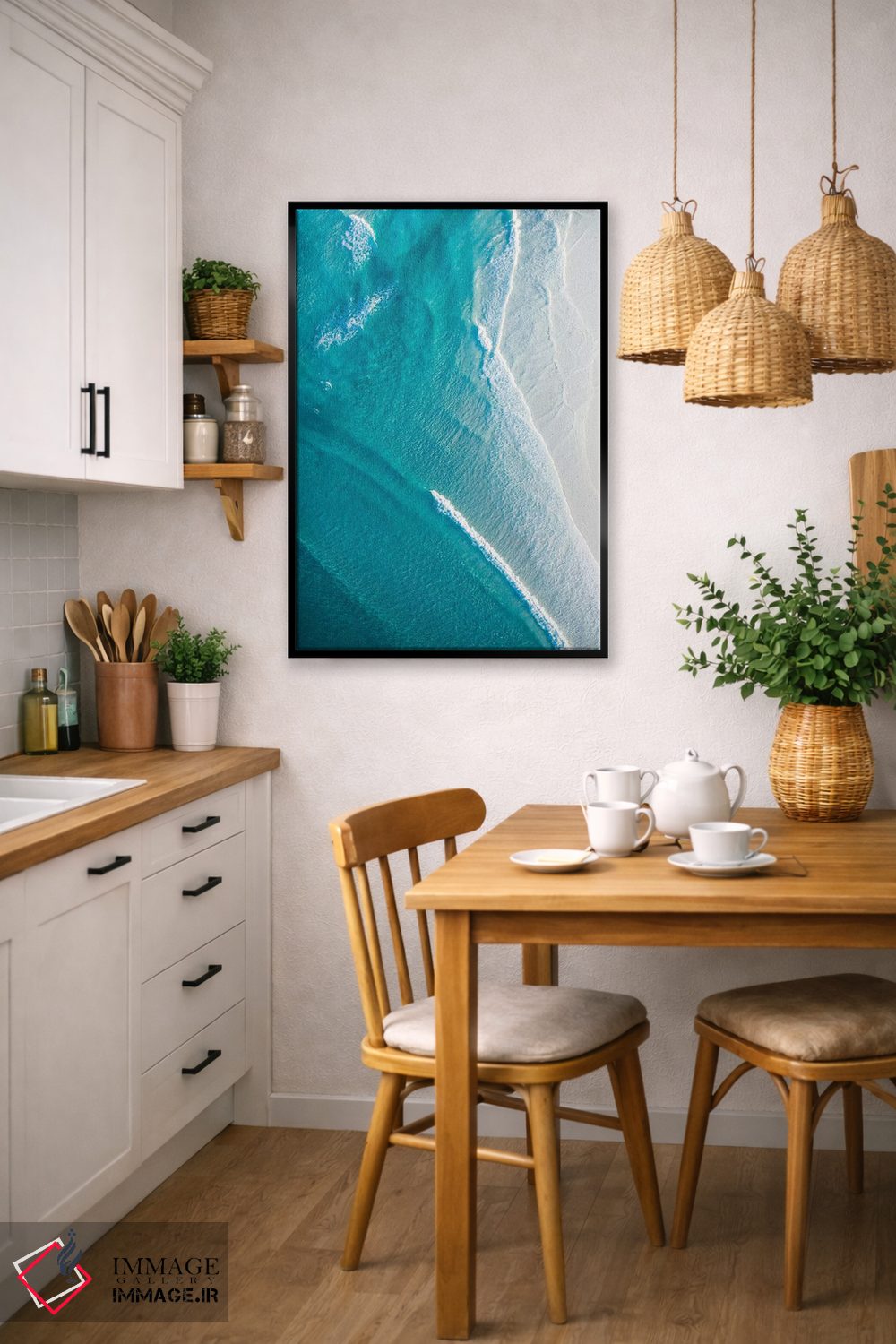 برای یک چیدمان تمیز، فیروزهای را در یک تابلو کوچک مکمل در نظر بگیرید تا هماهنگی بیشتر به چشم بیاید. انتخاب قاب هم میتواند این اکسنت را تقویت کند.