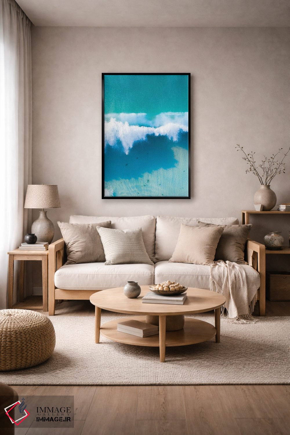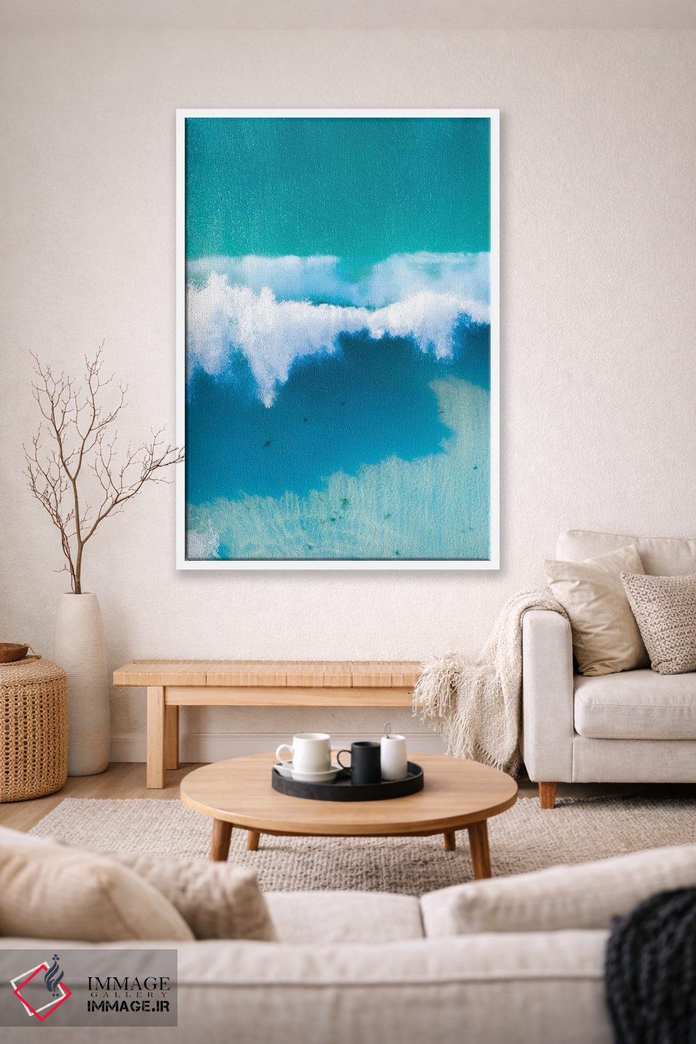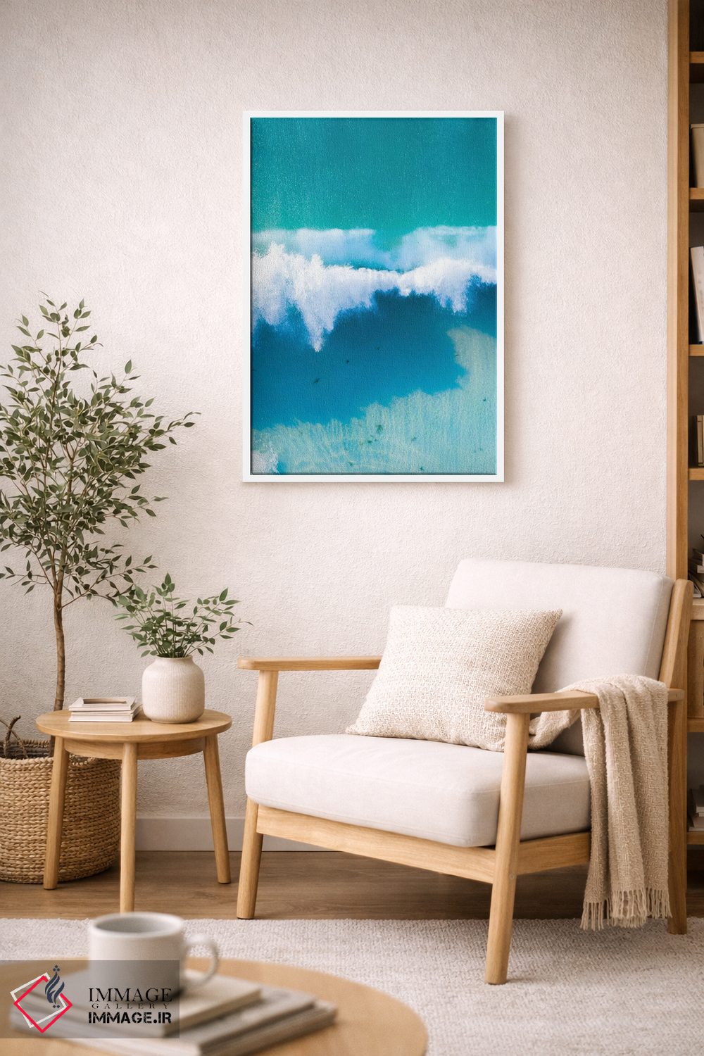 «امواج فیروزهای» اثرِ «جکسون رابرتز» با نگاه عکاسانه و موضوعِ این اثر، حسِ «پنجره رو به بیرون» را به دیوار میآورد.