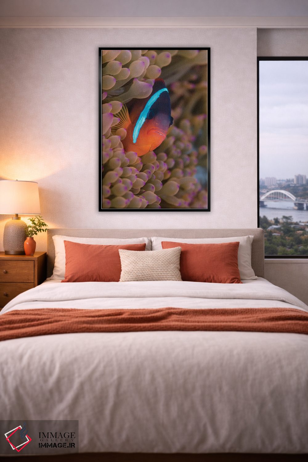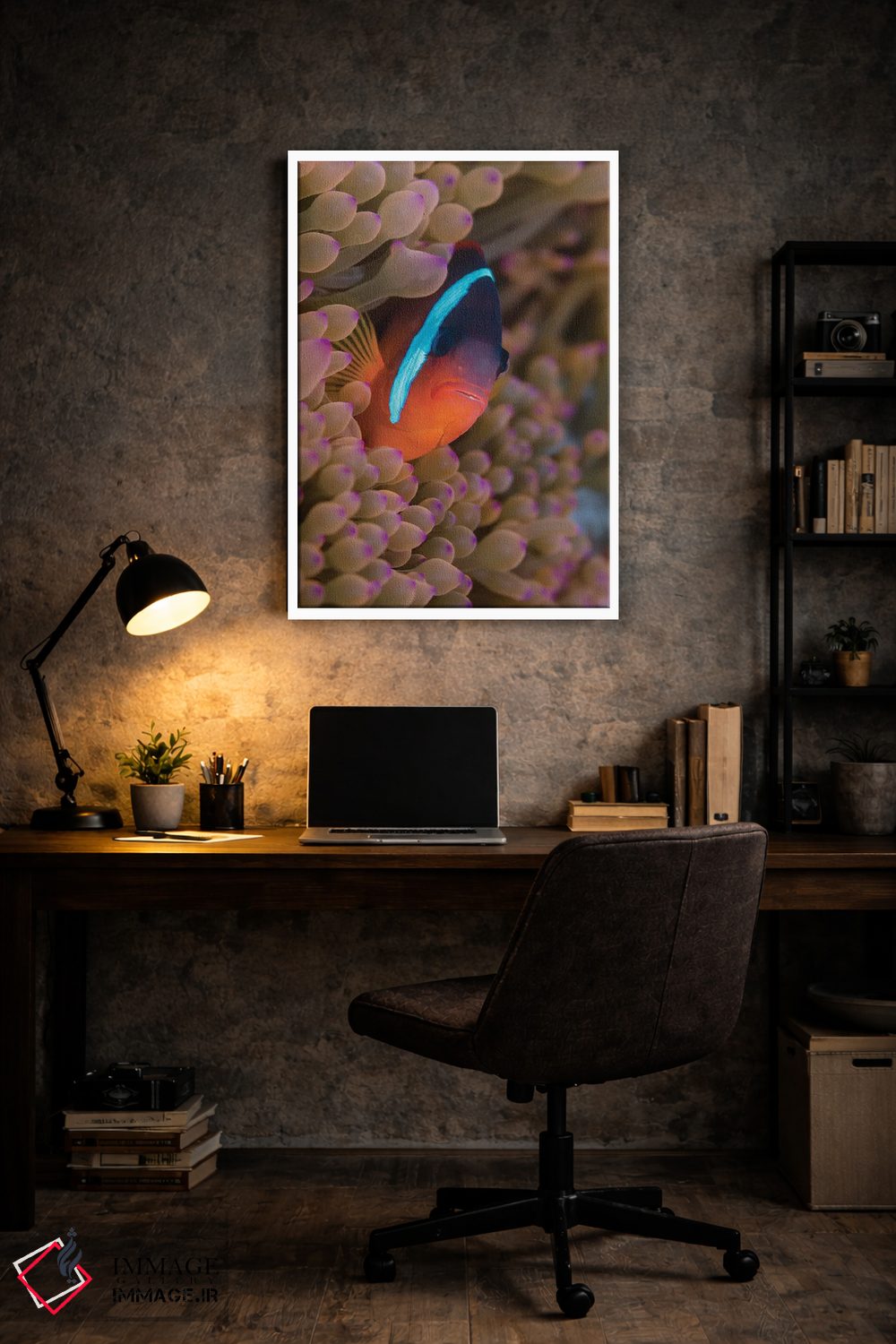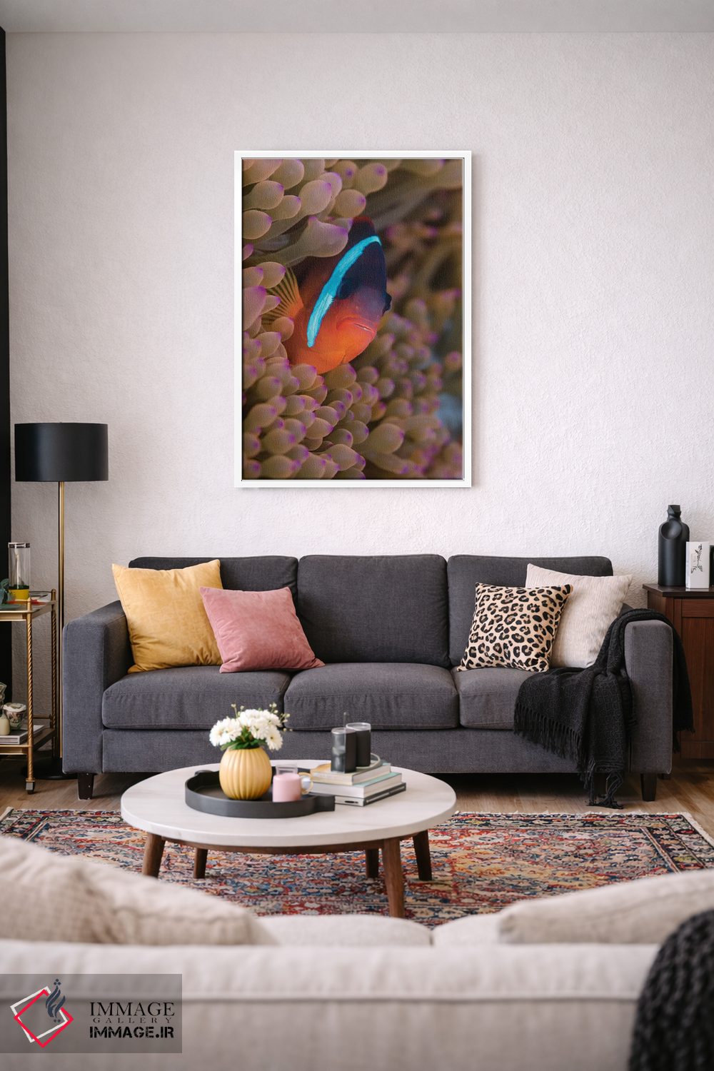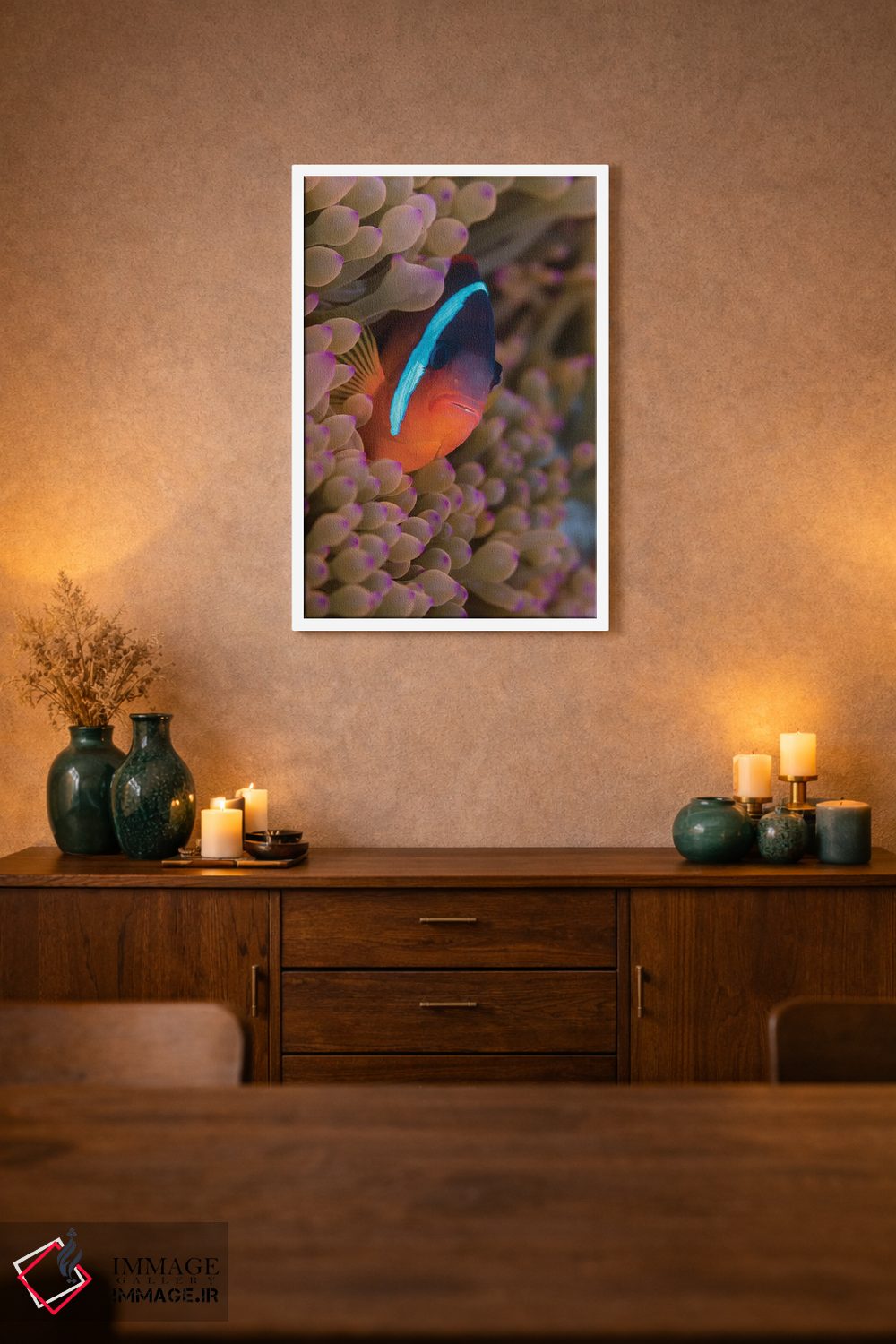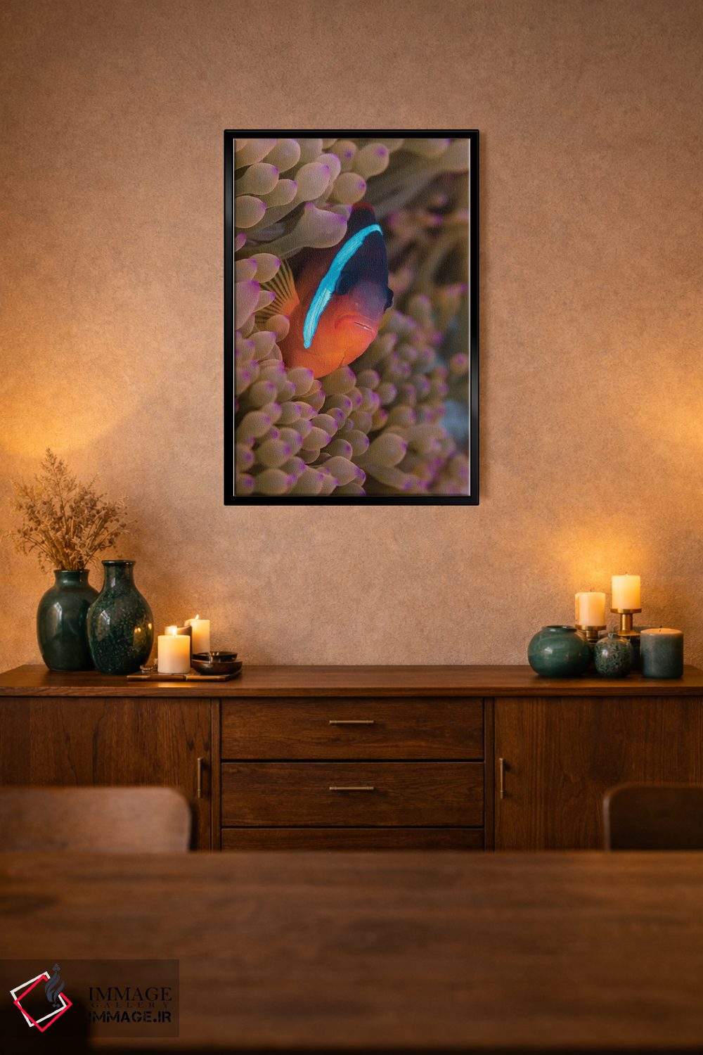 «فیجی. ماهی دلقک پنهان شده میان شقایقهای دریایی» اثرِ «جینز گالری (گالری هنری/تصویر)» میتواند بدون شلوغکاری، توجه را دقیق جمع کند؛ برای محیطهای کاری و استودیوهای خلاق پیشنهاد میشود. در کنار گیاهان آپارتمانی هم جلوهٔ لطیفی پیدا میکند.