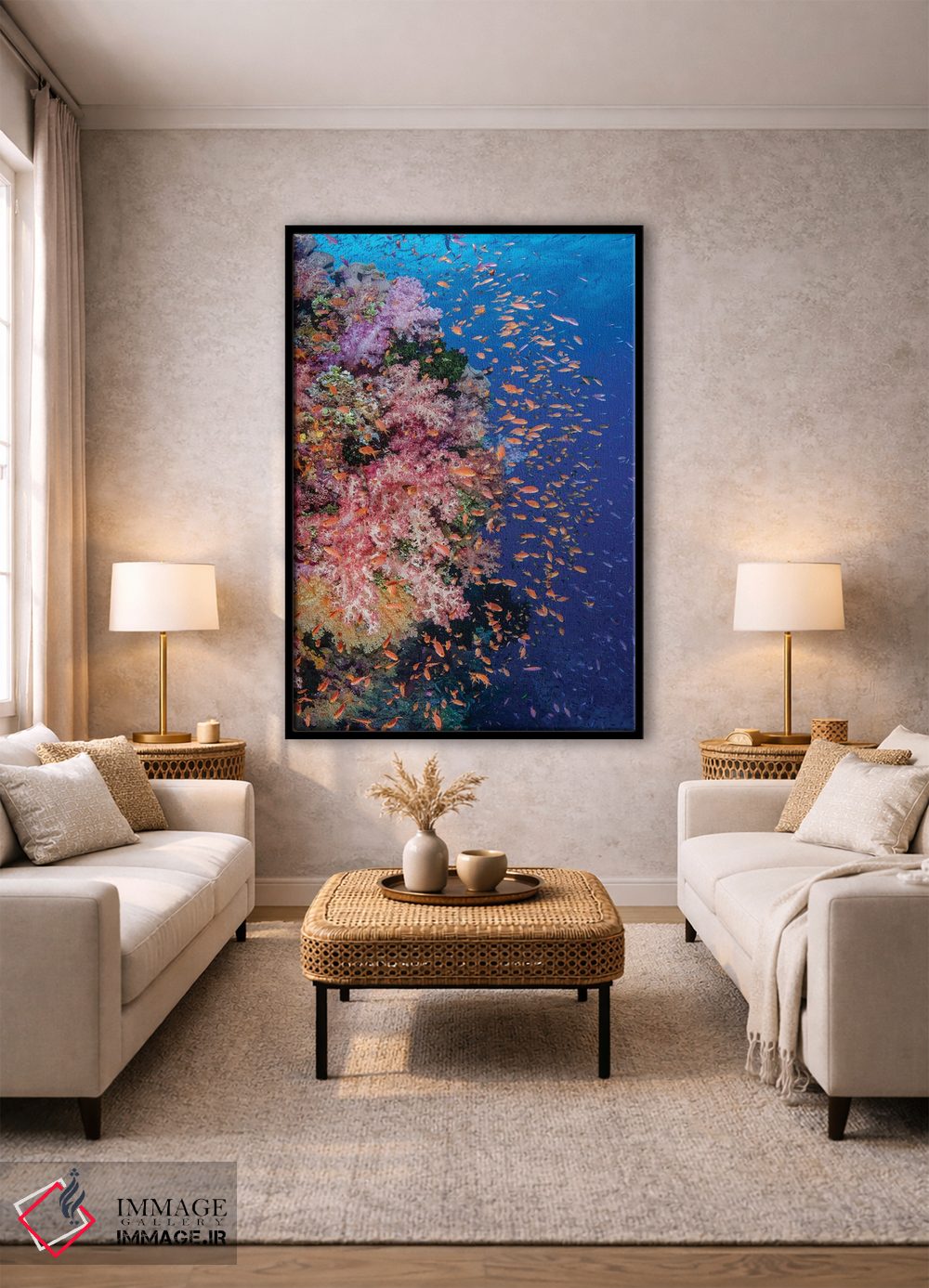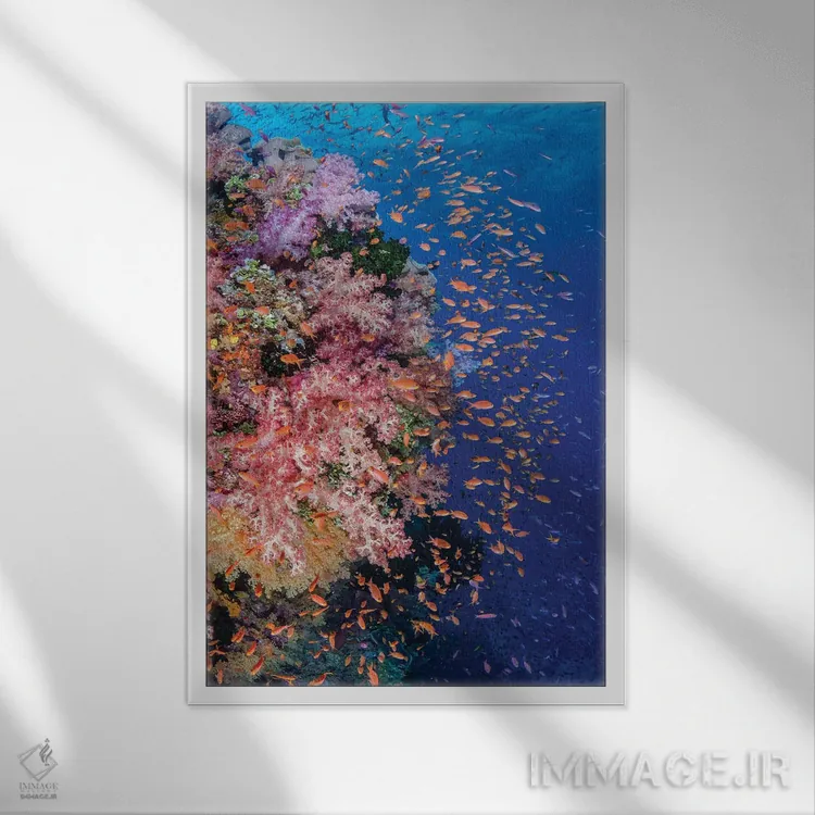 برای فضایی که میخواهید مرتبتر و حرفهایتر دیده شود، «فیجی. صخره مرجانی با آنتیاس (نوعی ماهی) I» اثرِ «جینز گالری (گالری هنری/تصویر)» در کنار مبلمان، خوشنشین و هماهنگ مینشیند؛ برای فضاهایی که میخواهید آرام اما جدی دیده شوند پیشنهاد میشود. اگر میخواهید مهمانها مکث کنند، این اثر دلیل خوبیست.