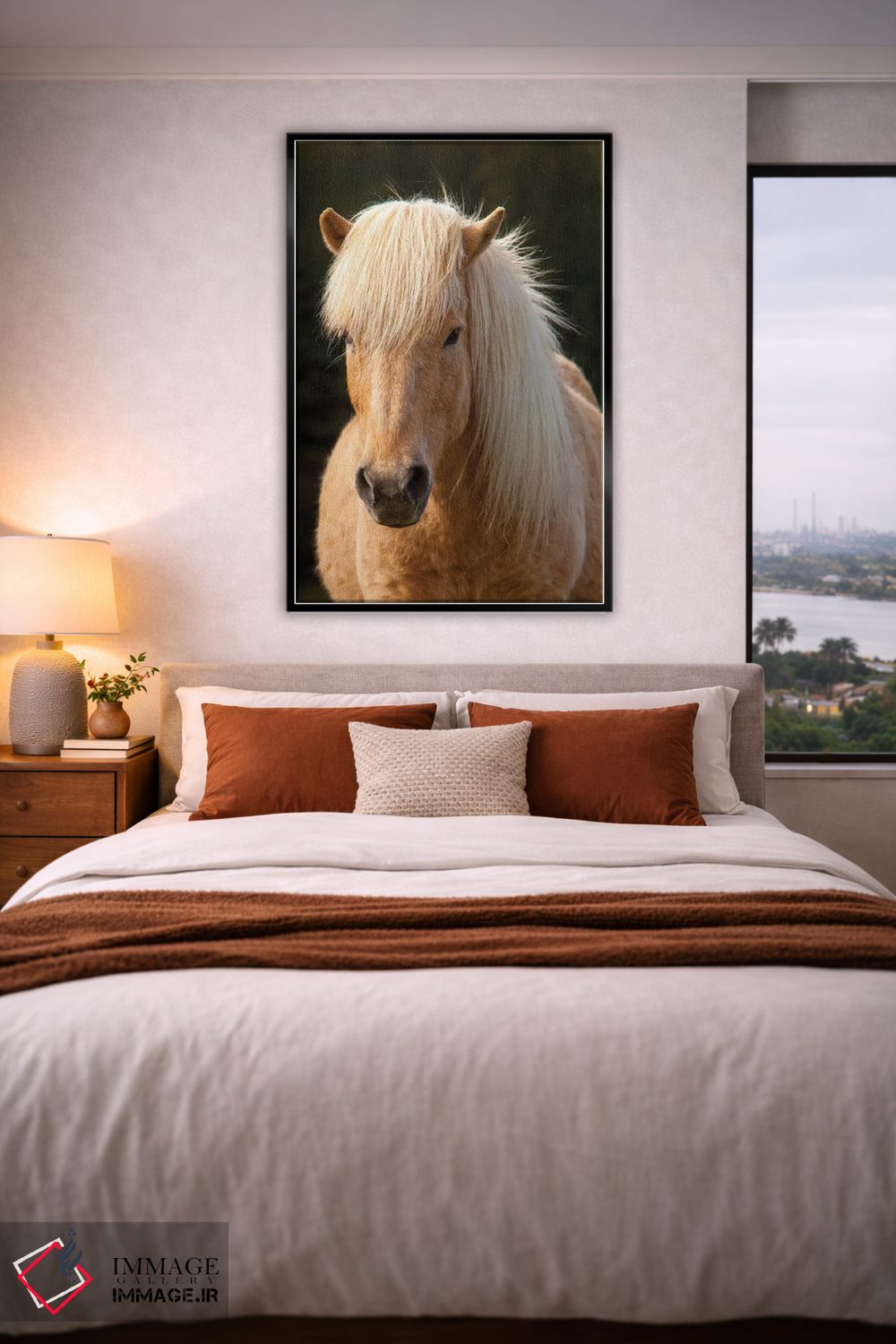 براساس پالت گرم اثر، قاب بلوط روشن (چوبی) پیشنهاد اول است و استخوانی ملایم مکمل. برای سفارشهای پروژهای با ابعاد و قابهای اختصاصی با ایماژ در تماس باشید.