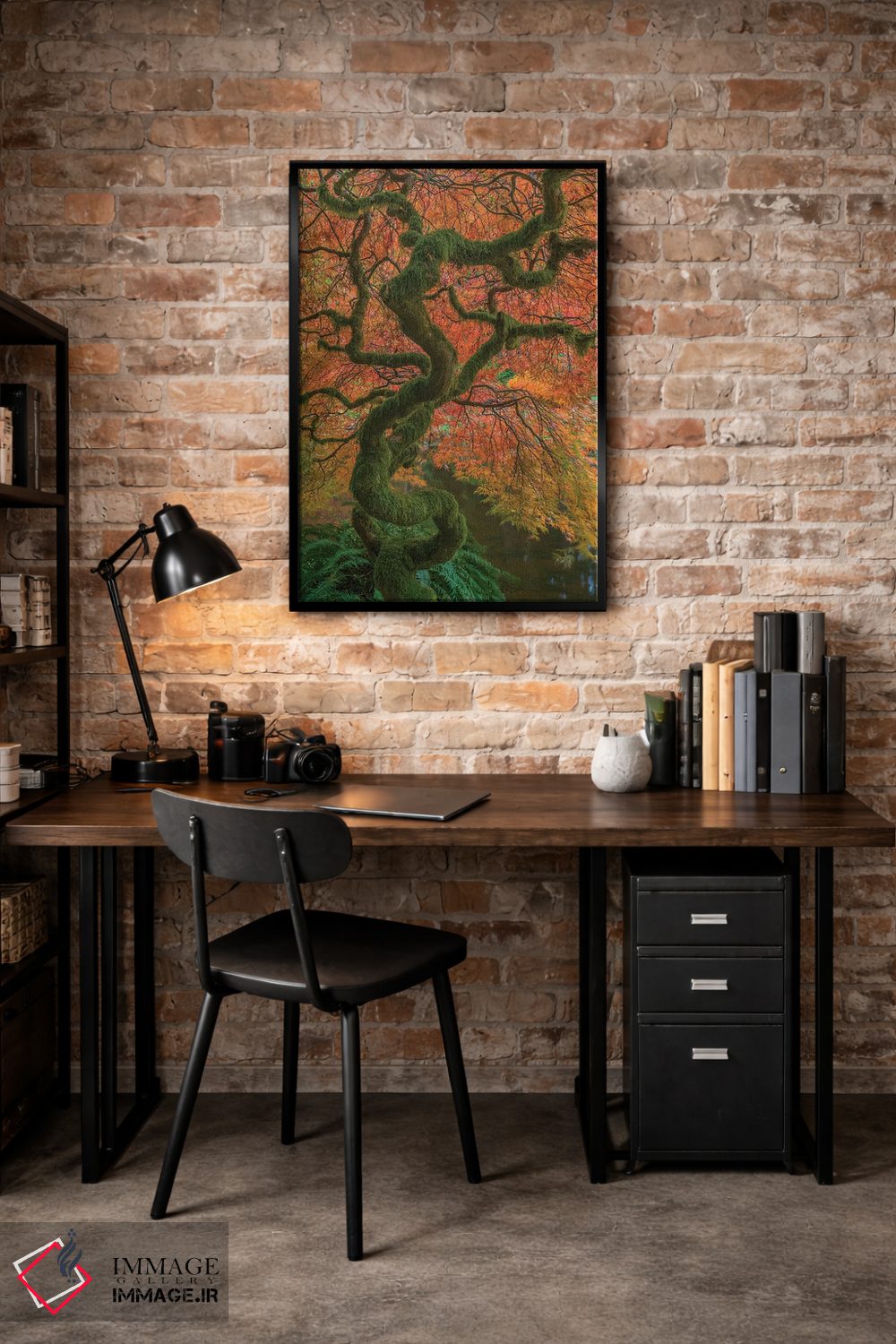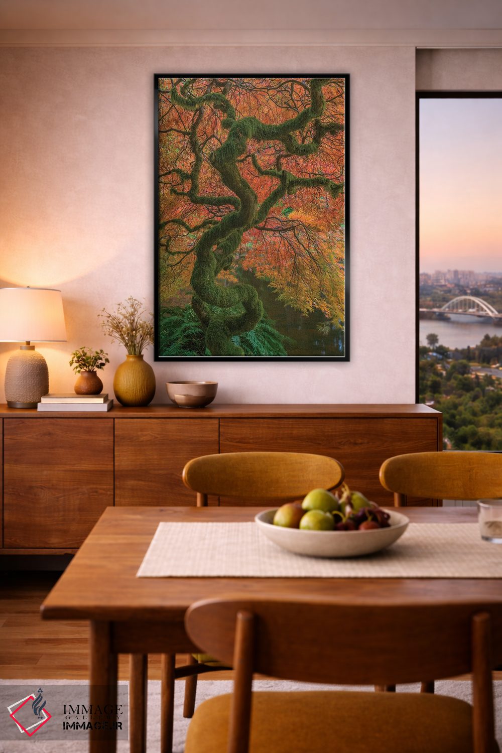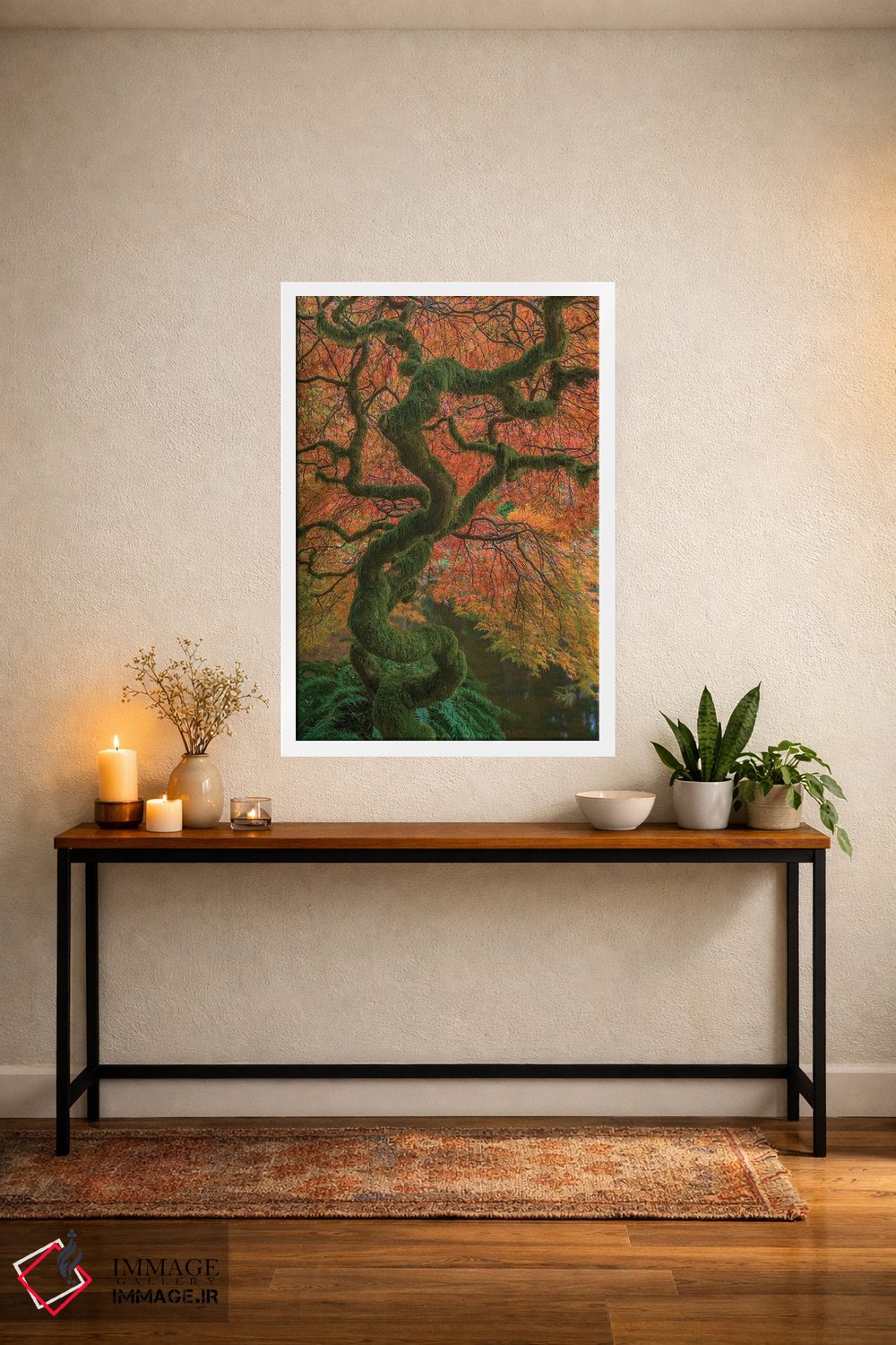 برای اتاق خواب و نشیمنهای آرام، «Washington State، Bainbridge Island. Japanese maple tree in fall.، ایالات متحده، ایالت واشینگتن، جزیره بینبریج. درخت افرا ژاپنی در پاییز.» اثرِ «جینز گالری (گالری هنری/تصویر)» فضا را نرمتر و مهماننوازتر میکند؛ برای کنار میز آرایش یا کنسول انتخابی خوشسلیقه است. حضورش آرام است، اما بیاثر نیست.