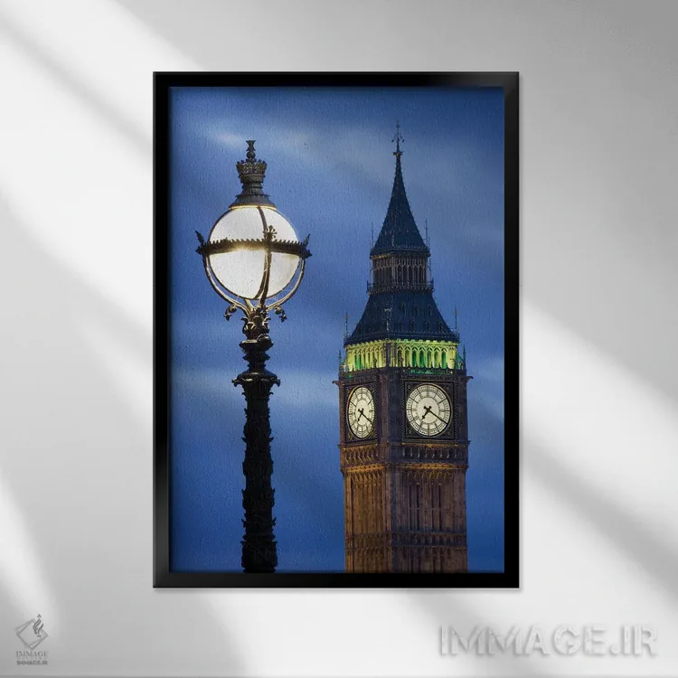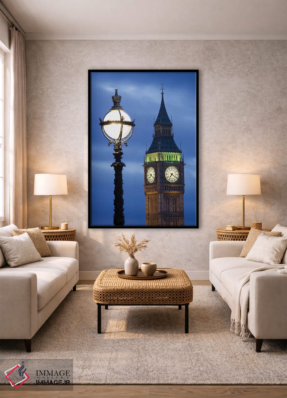 در نگاه اول، «Great Britain، London، Big Ben. Clock Tower Lamp Post.، اروپا، بریتانیا، لندن، بیگ بن. چراغ پایه جلوی برج ساعت (بیگ بن)» اثرِ «جینز گالری (گالری هنری/تصویر)» اتاق را جمعوجورتر و مرتبتر نشان میدهد؛ برای دیوار بالای کنسول یا شومینه پیشنهاد میشود. در چیدمانهای مختلف، هماهنگپذیر و انعطافدار است.