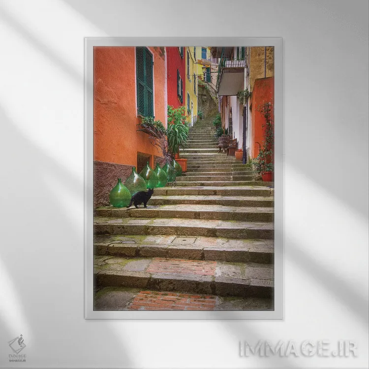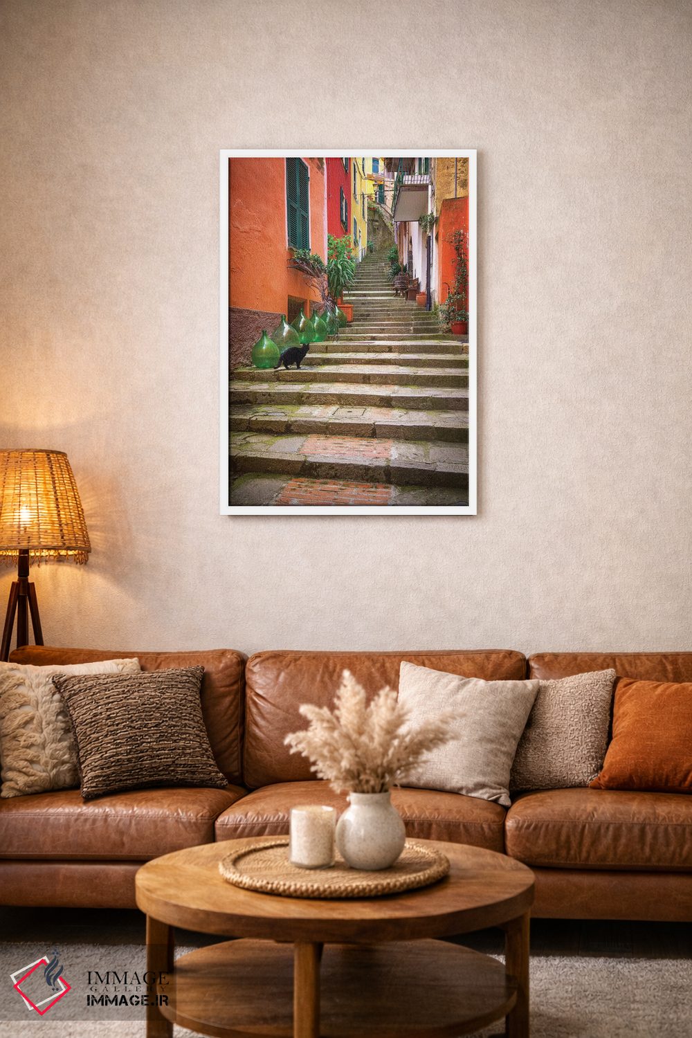 «Italy، Monterosso. Cat On Long Stairway.، اروپا، ایتالیا، مونتروسو. گربه روی راهپله بلند» اثرِ «جینز گالری (گالری هنری/تصویر)» بازیِ دقیقِ خط و هندسه است؛ اتاق را مرتبتر و منسجمتر نشان دهد؛ برای اتاق جلسات انتخابی خوشسلیقه است. با نورپردازی خطی، خطوط اثر خواناتر هم میشود.