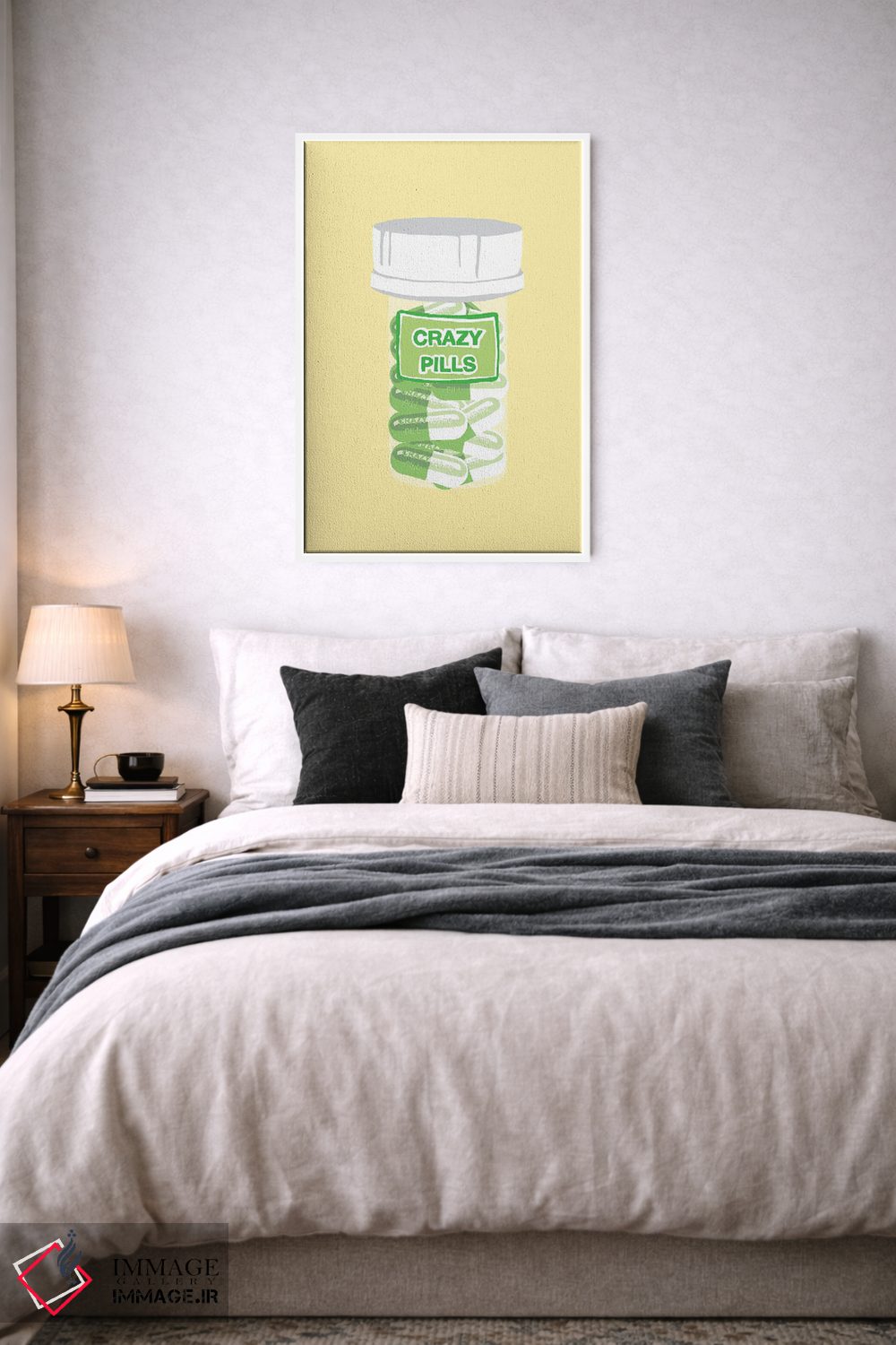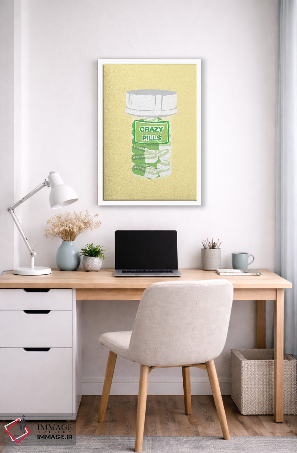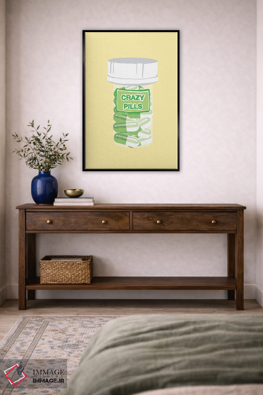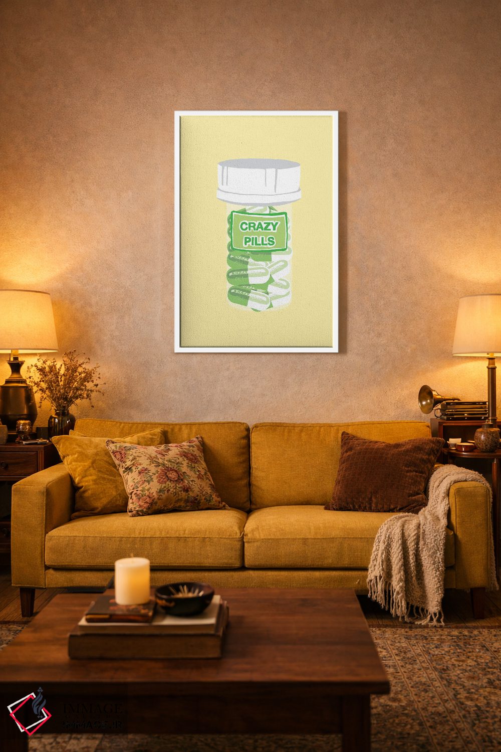 «بطری قرص دیوانگی زرد» اثرِ «جیمی متز» به فضا عمق میدهد؛ این اثر در اجرای هنری، برای دکورهای کلاسیک—مدرن یک نقطهی کانونی تمیز میسازد.