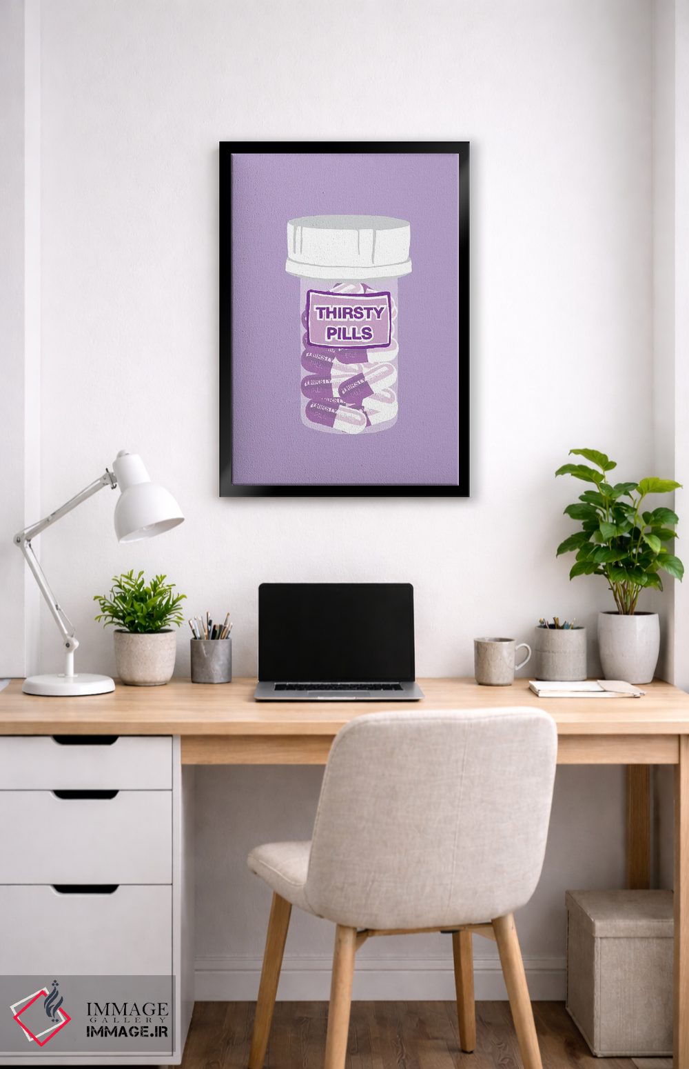 این اثر با عنوان «بطری قرص تشنگی بنفش کمرنگ» اثرِ «جیمی متز»، برای دیوارهای شاخص و چیدمانهای سطحبالا مناسب است.
